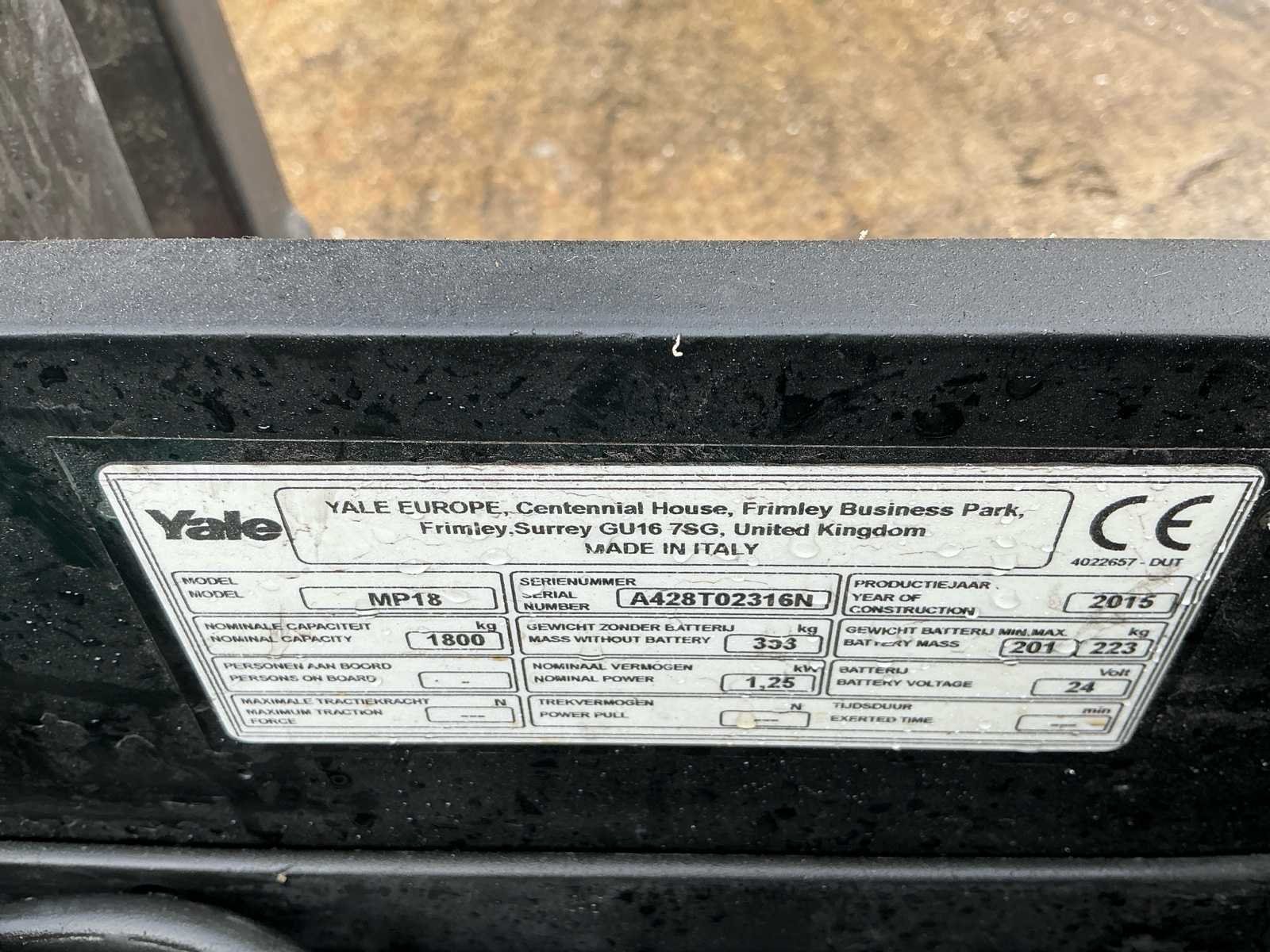 Yale MP18 elektrische pallettruck Aangeboden: Yale MP18 elektrische palletwagen. Deze elektrische pallettruck is geschikt voor intern transport van pallets in magazijnen, werkplaatsen en logistieke omgevingen. Nog in functionele bruikbare staat met zichtbare gebruikssporen zie foto’s. Heeft een interne lader om met 230v opgeladen te worden. Nee Merk: Yale Type: MP18 Accu lader: true