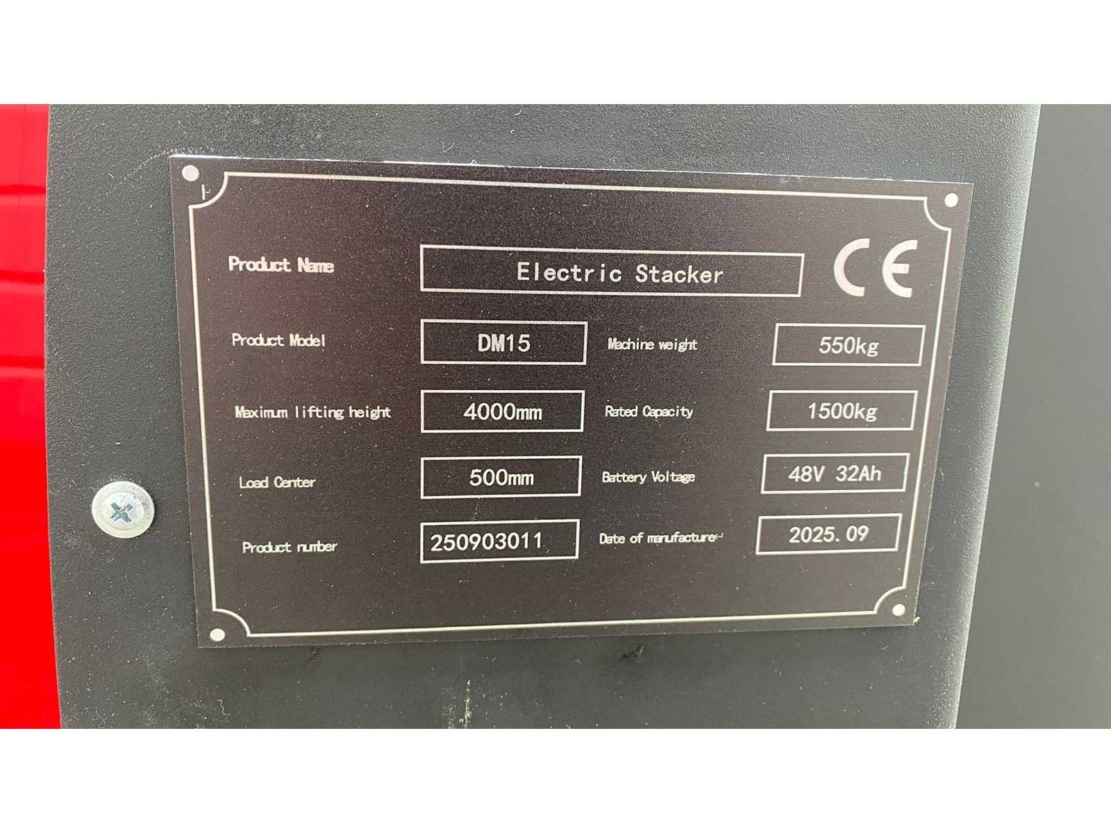 Merk: DMHT Model: DM15 Mast: Duplex Aandrijving: Elektrisch Max. hefhoogte: 4000 mm Gewicht: 550 kg Doorrijhoogte mast ingeschoven Maximale hefcapaciteit: 1500 kg Aantal wielen: 4 Type wiel: volle rubber Spanning accu: 48v Lader: ja / 48v 32 mA Laadspanning: 230v Bedrijfsrem: Auto No Merk: DMHT Type: DM15 Bouwjaar: 09-2025 Hefvermogen: 1500kg Lepellengte: 1150mm Accu lader: true Eigen gewicht: 550kg