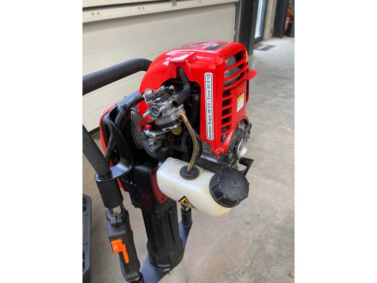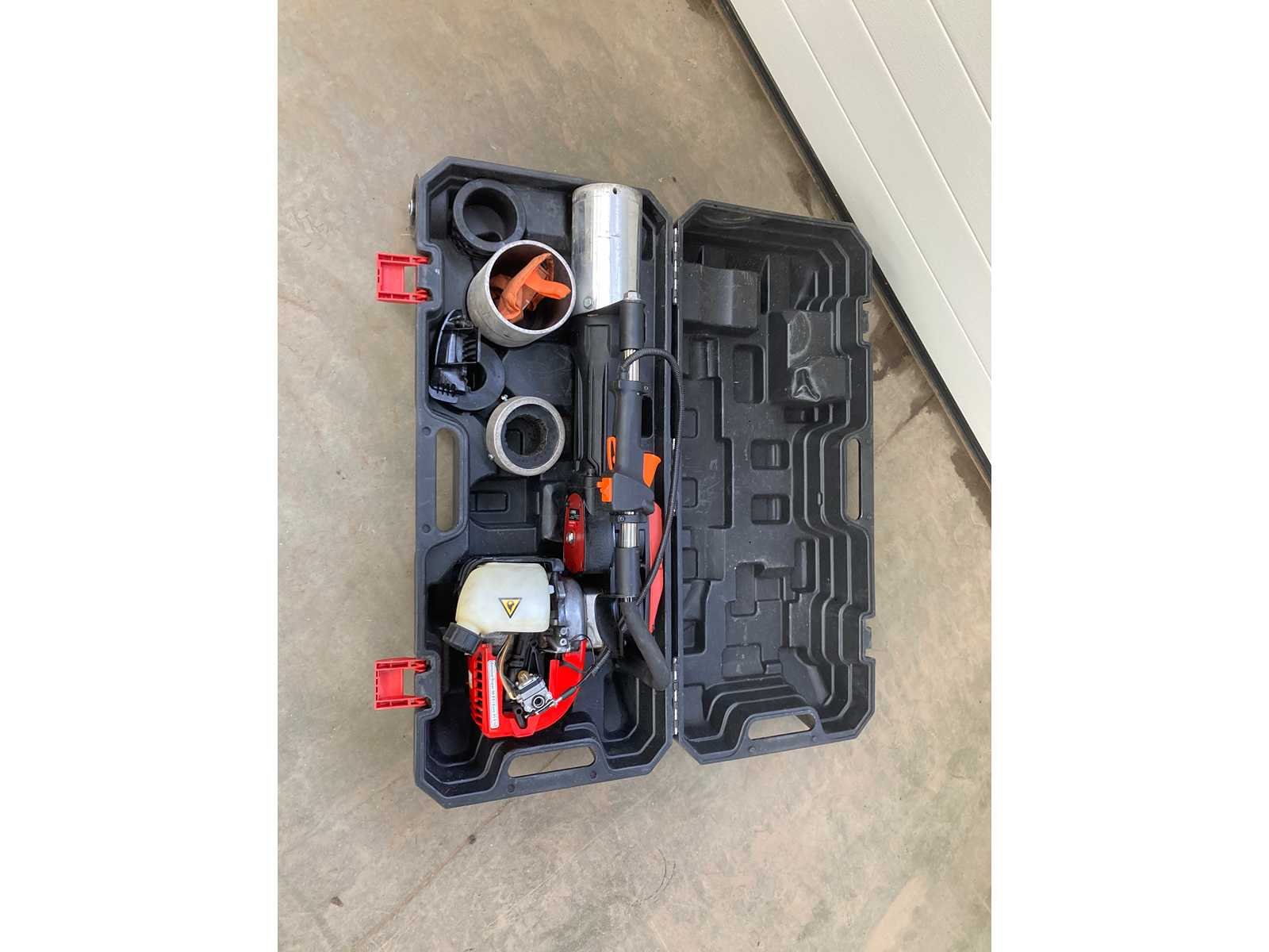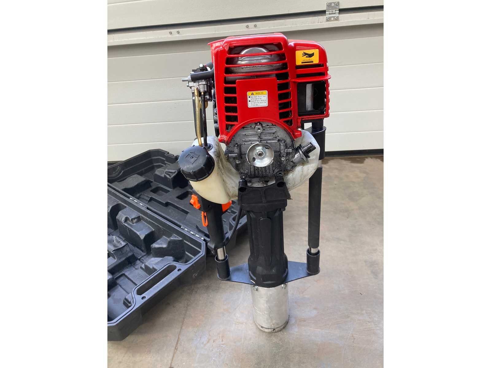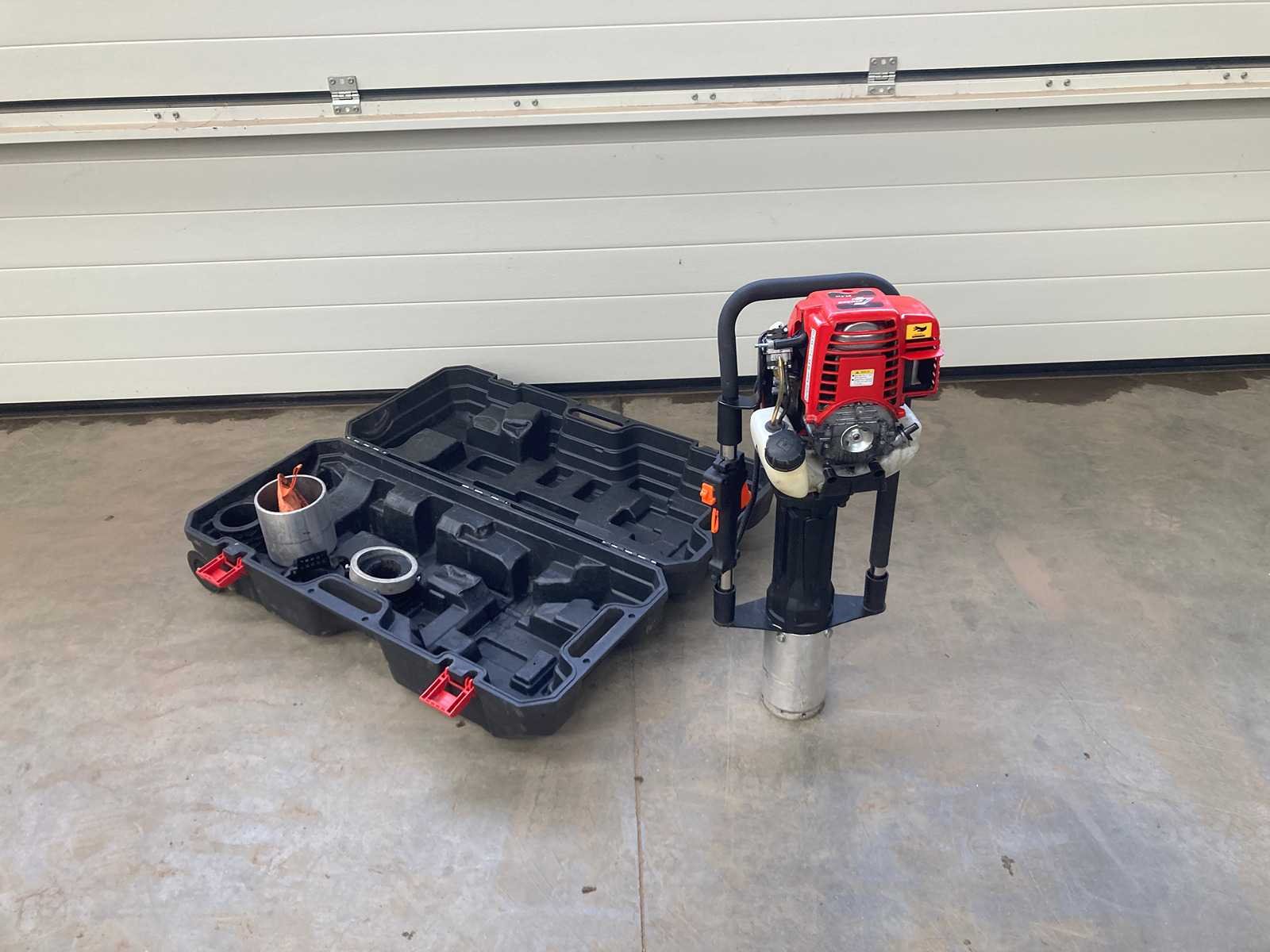Palen rammer met benzine motor; power : 1000W /7000r/min; 38cc; met 2 hulp opzetstukken met paaldiameter : 45, 65 en 95mm; incl accessoires; incl kunststof draagkoffer met wielen die daardoor verrijdbaar is; handleiding aanwezig Trekkoord en luchtfilter ontbreken Nee Merk: Thrall Type: DPD 120 Afmeting l: 1000mm Afmeting b: 400mm Afmeting h: 350mm Eigen gewicht: 32kg