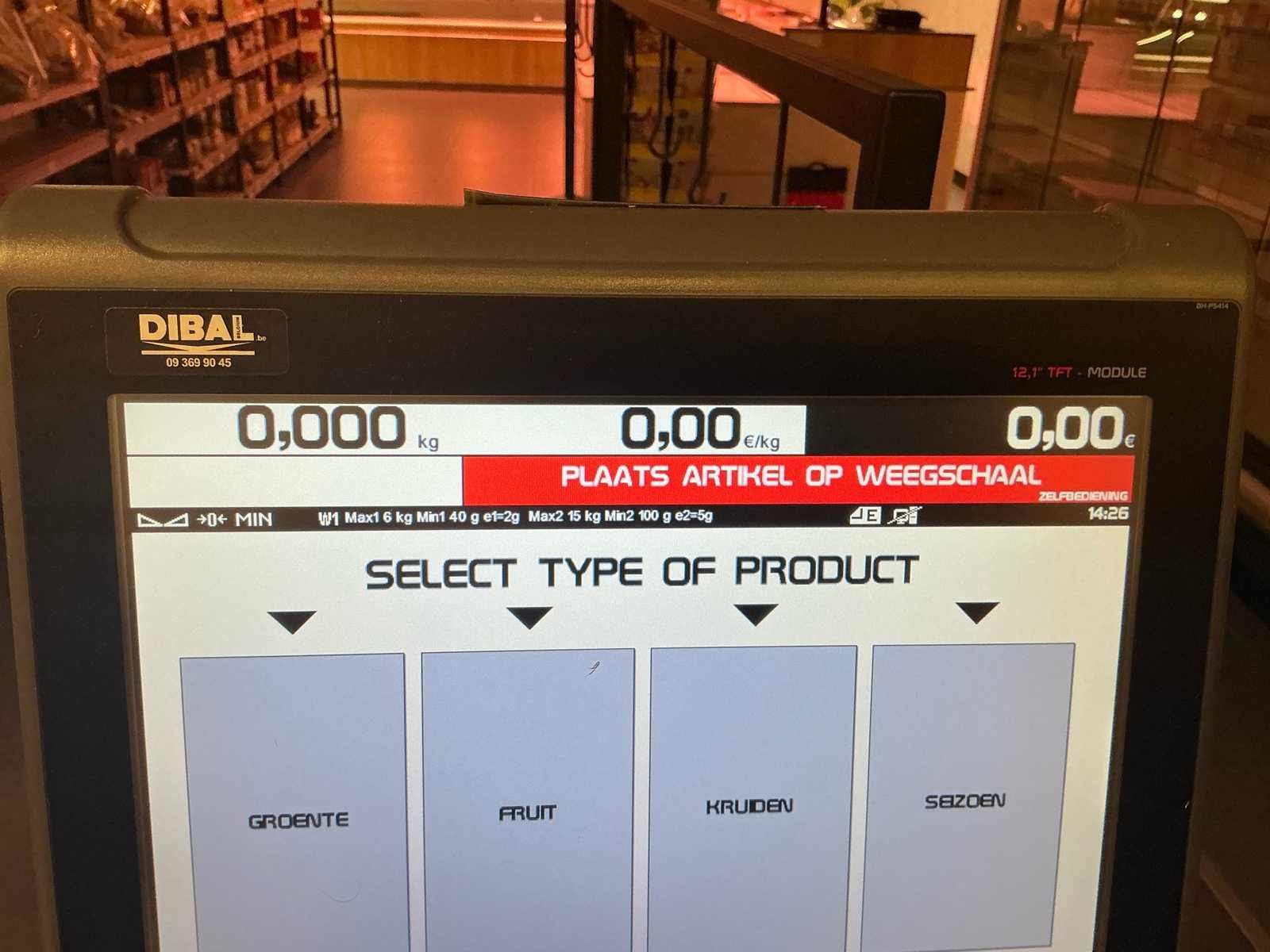 Professionele weegschaal in perfect werkende staat. Verkoop wegens stopzetting handelszaak. No Merk: Dibal Type: TFT module 12.1. DH-P5414