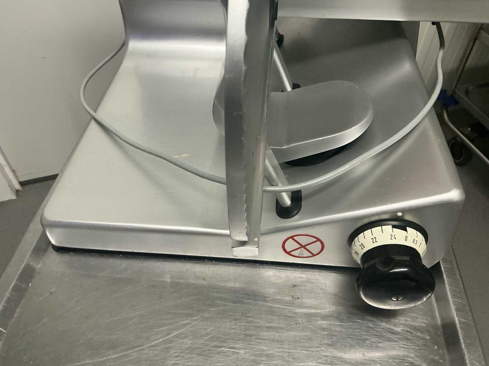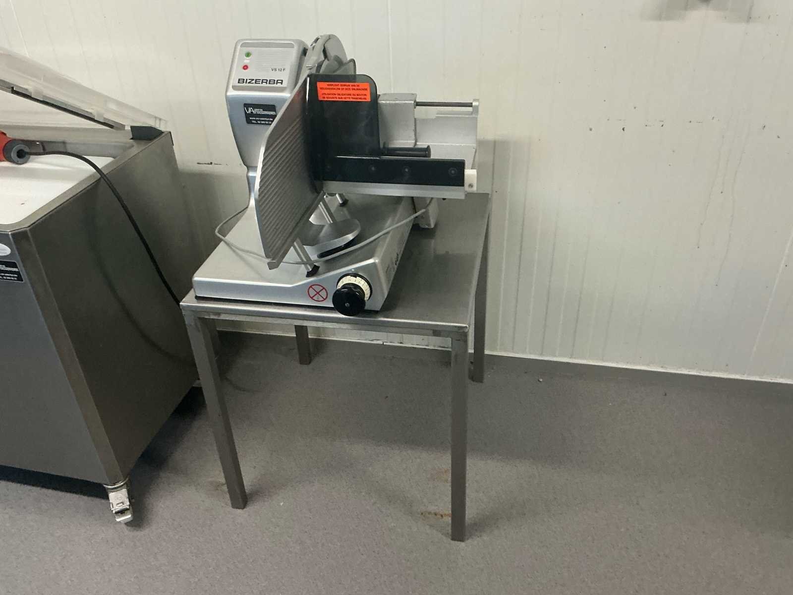 Verkoop wegens stopzetting handelszaak. Uitstekende staat en steeds goed onderhouden. 1 Inox werktafeltafel inbegrepen. Afmetingen tafel D.68cm - H 70cm. Zie bijgevoegde foto’s. professionele vleessnijmachine Bizerba VS12 (waaronder de uitvoering VS12 F), een verticale deli‑/vleessnijmachine die veel in slagerijen en horecakeukens wordt gebruikt:  No Merk: Bizerba Type: VS12 F Bouwjaar: 2013 Serienummer: 10913268 Diameter snijblad: 350mm Max. snijdikte: 240mm Aansluiting: 220V Eigen gewicht: 47kg Totale afmeting L: 860mm Totale afmeting Breedte: 770mm Totale afmeting Hoogte: 480mm