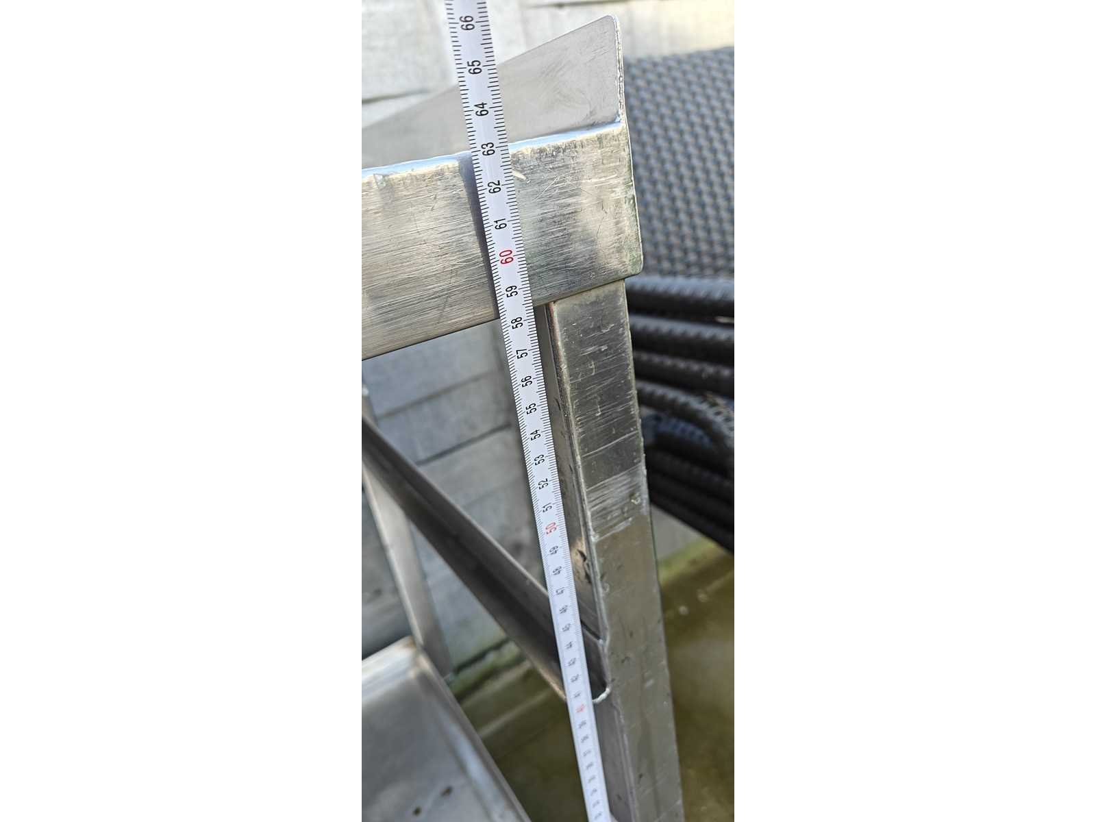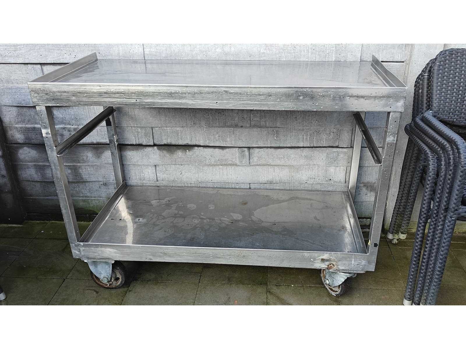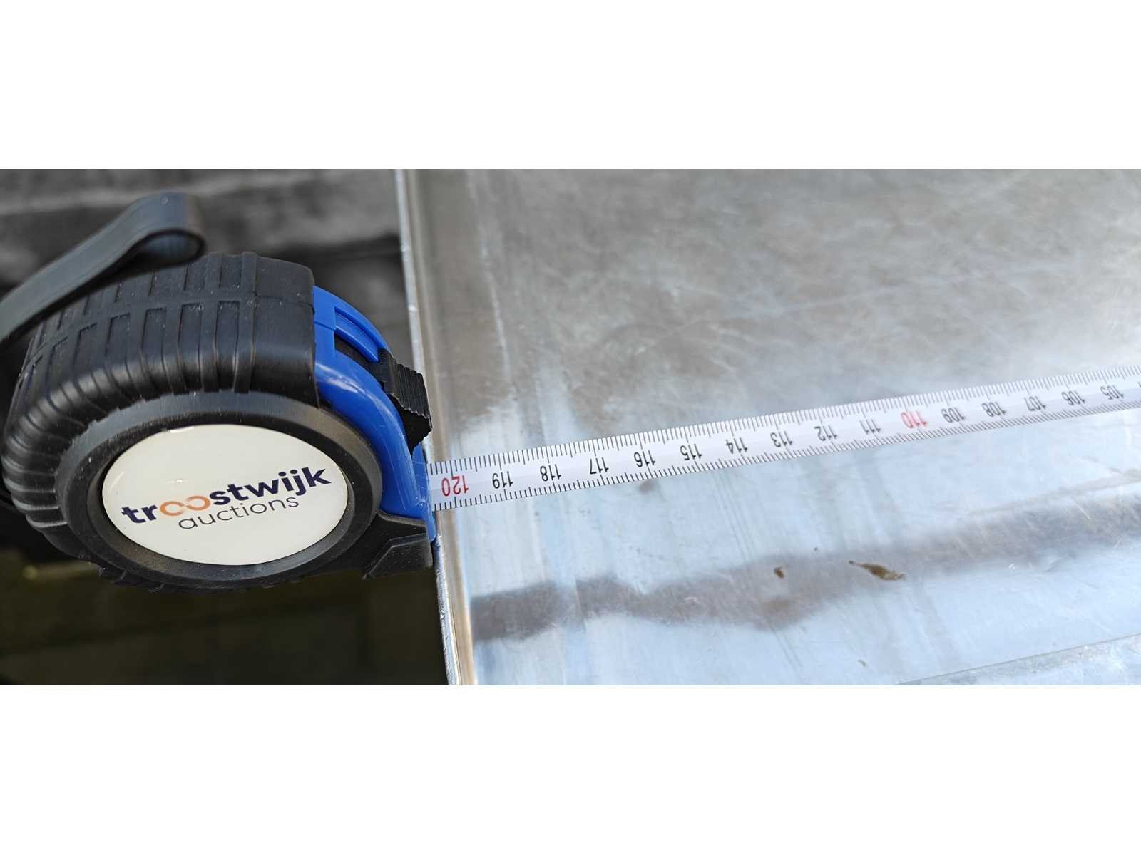 Van de grond gemeten: Onderste legplank op 25cm hoogte 1 legplank voorziening op 65cm werkhoogte 88cm voorzien van een opstaande rand van 3 cm. 2 zwenkel wielen & 2 vaste. Nee Merk: Franke Type: Mobiele werktafel Lengte: 55cm Breedte: 120cm Hoogte: 90cm