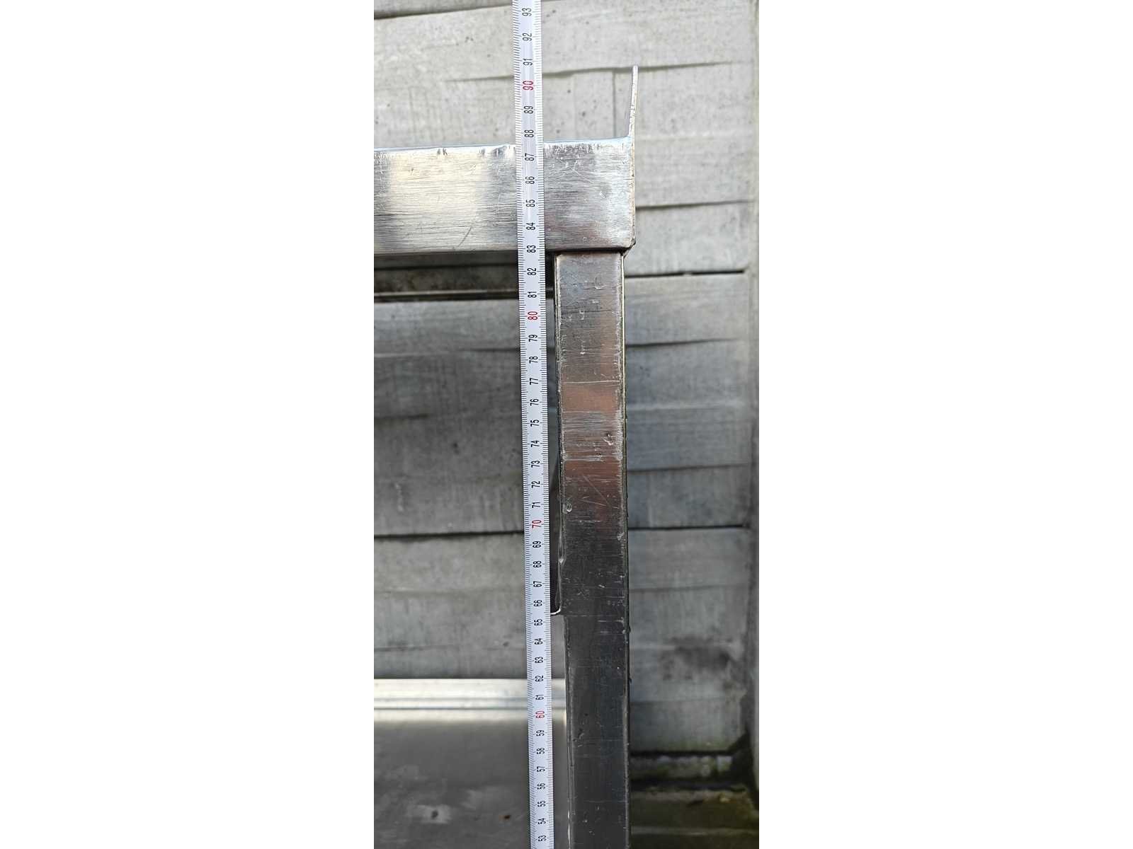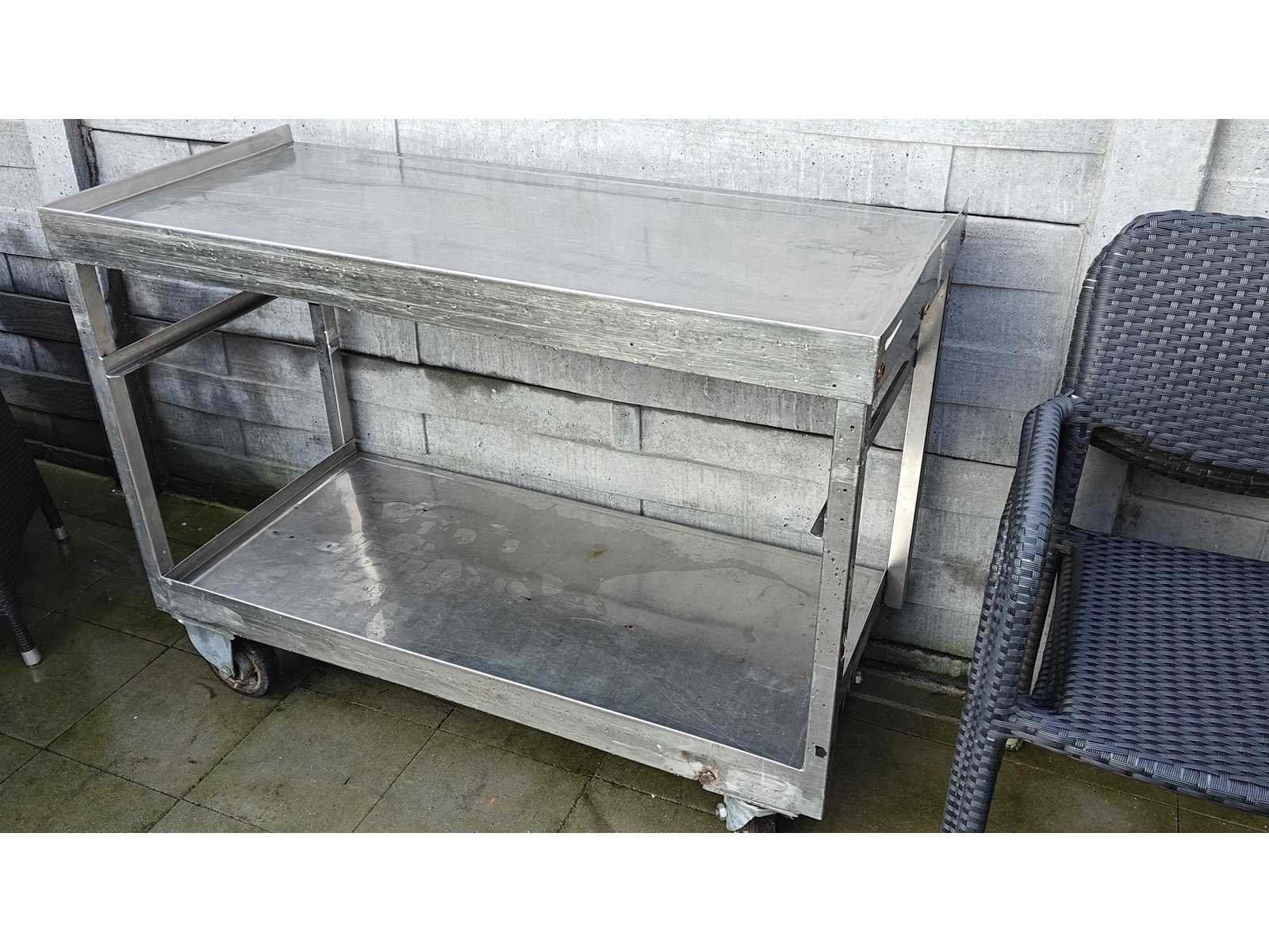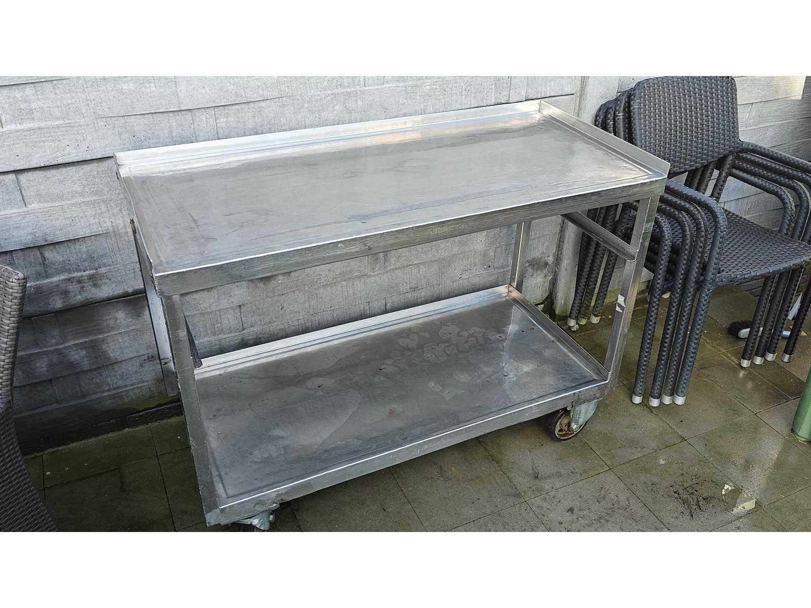 Van de grond gemeten: Onderste legplank op 25cm hoogte 1 legplank voorziening op 65cm werkhoogte 88cm voorzien van een opstaande rand van 3 cm. 2 zwenkel wielen & 2 vaste. Nee Merk: Franke Type: Mobiele werktafel Lengte: 55cm Breedte: 120cm Hoogte: 90cm