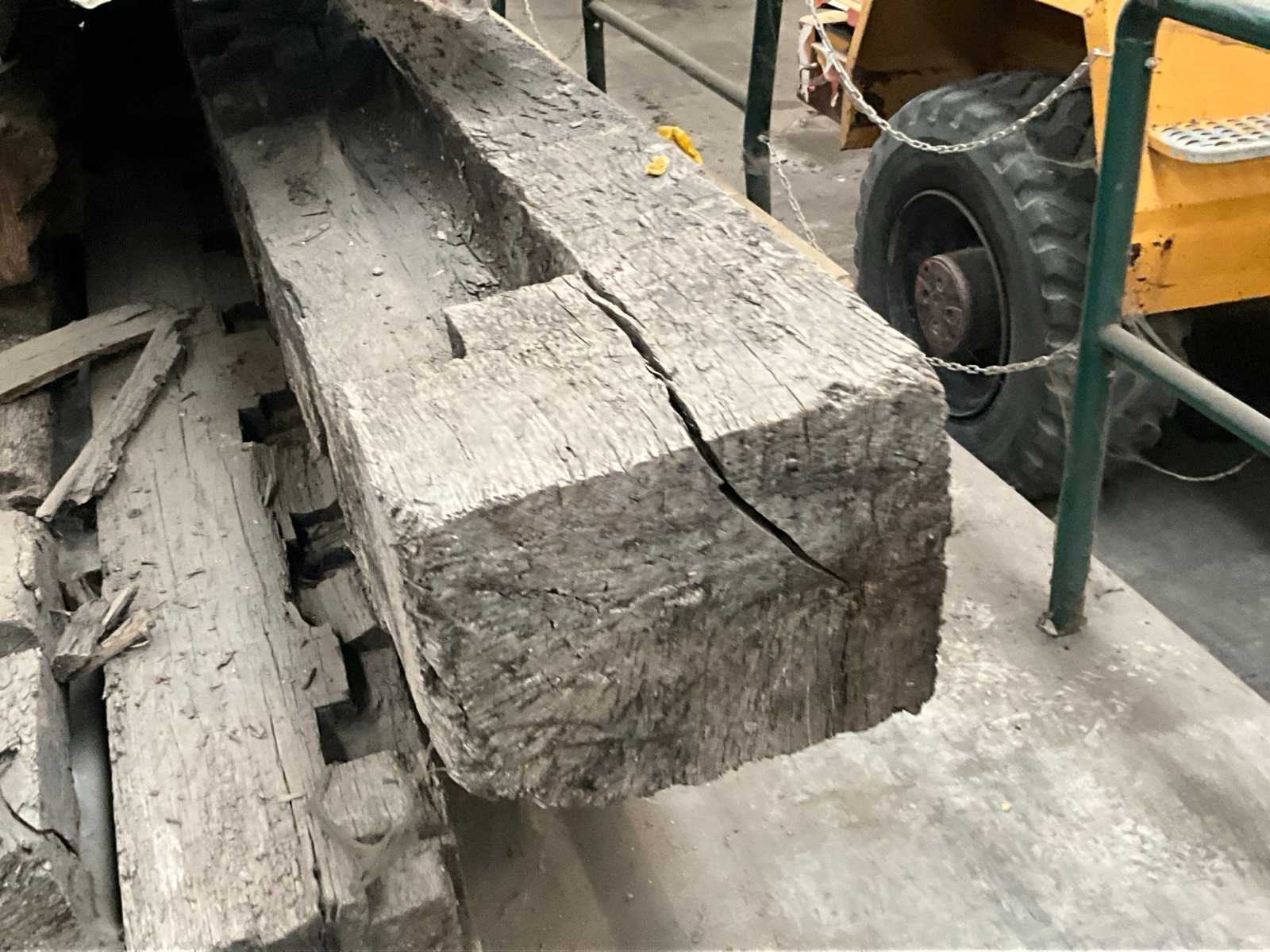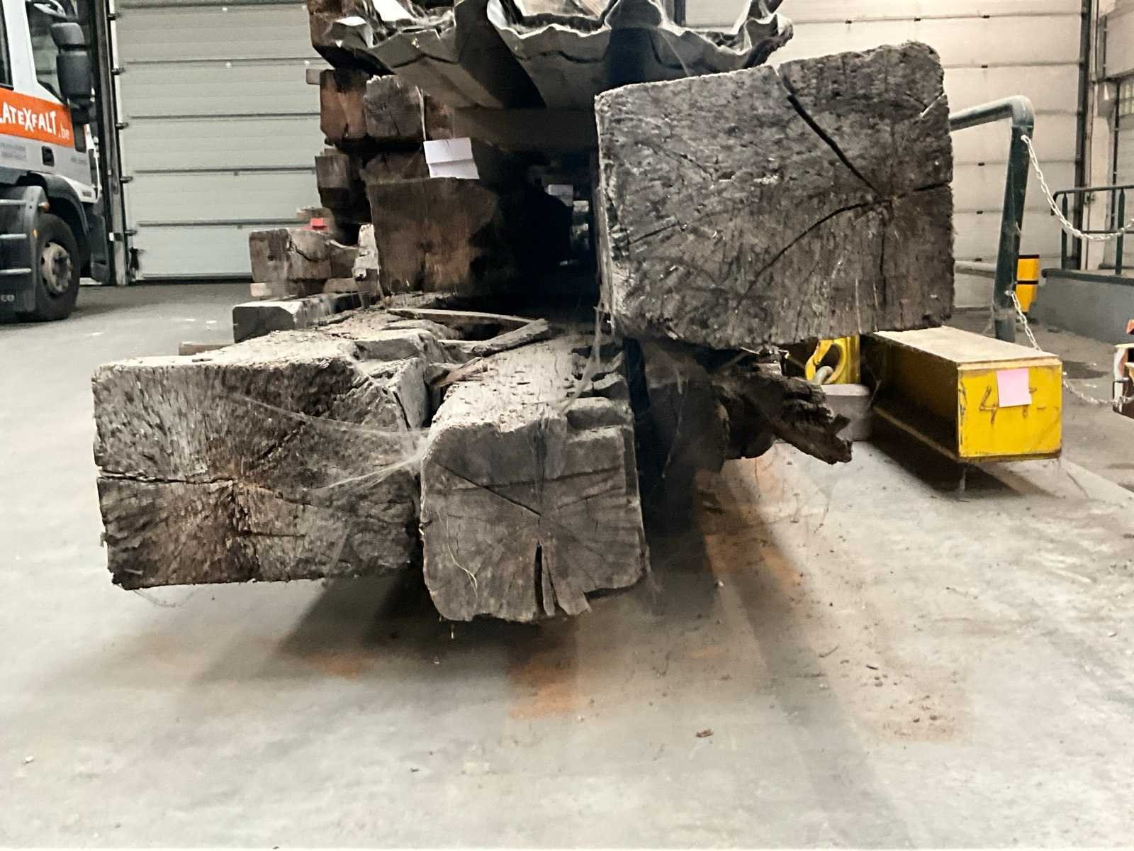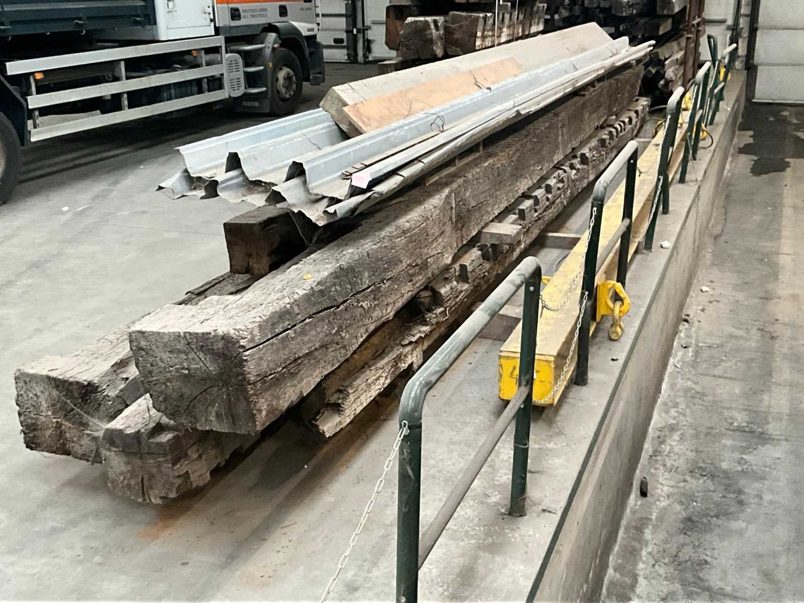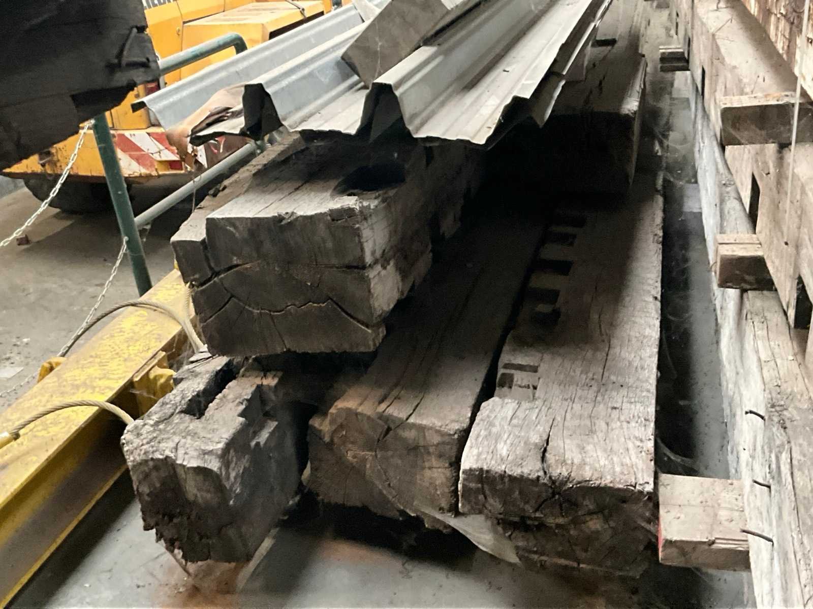 Waaronder met lengtes 600 tot 650 cm en met diktes en breedtes 39x32cm, 30x40cm, 29x26cm, compleet met partij ijzeren dakplaten. No