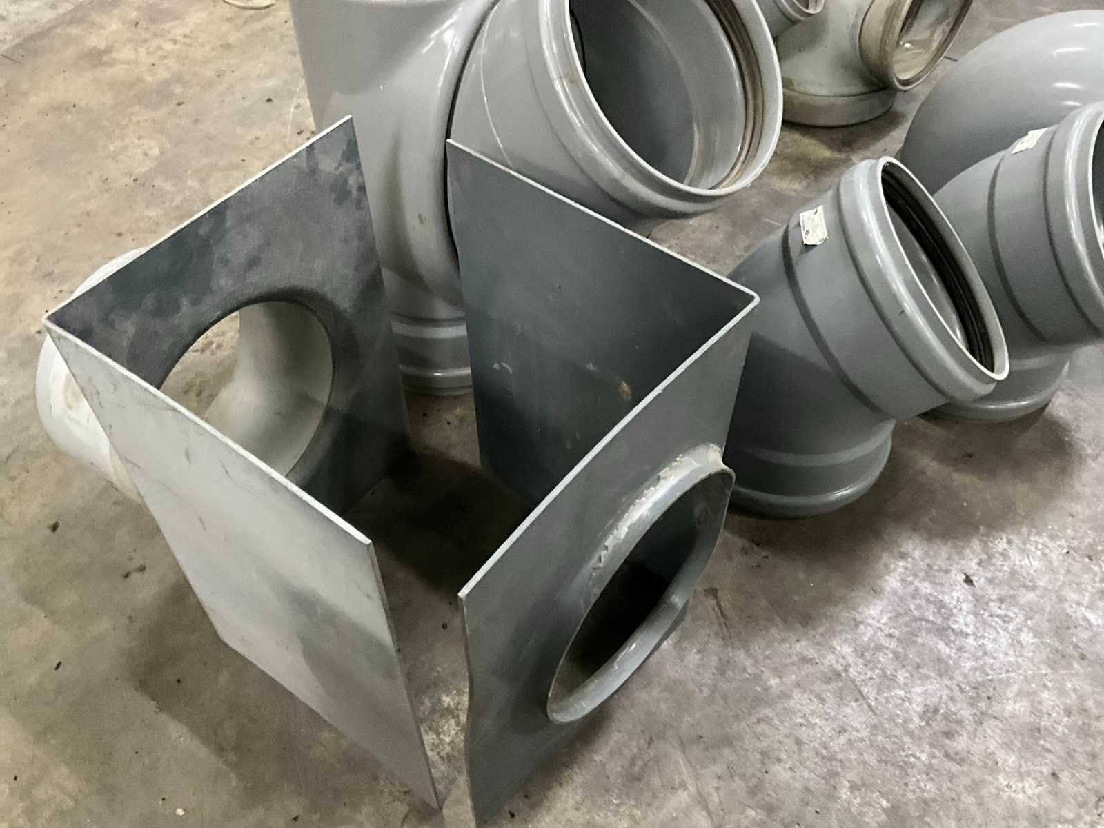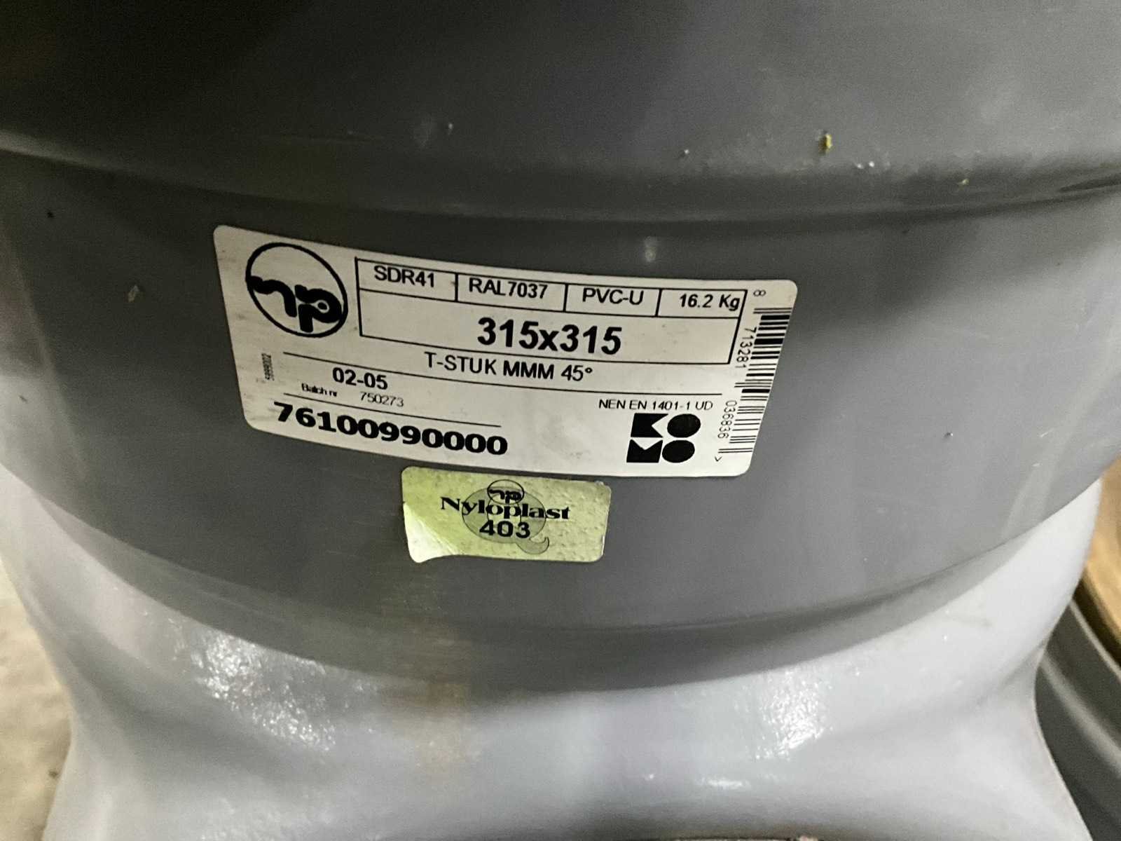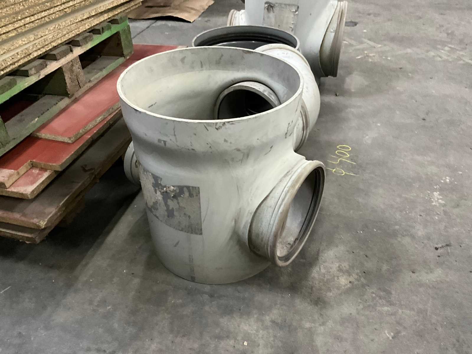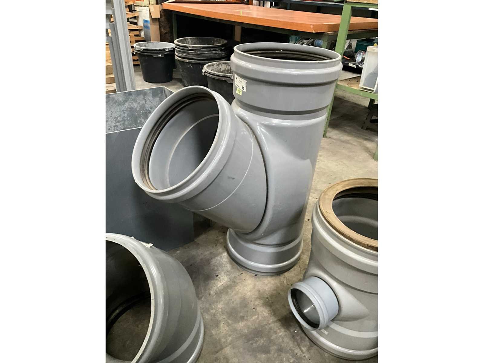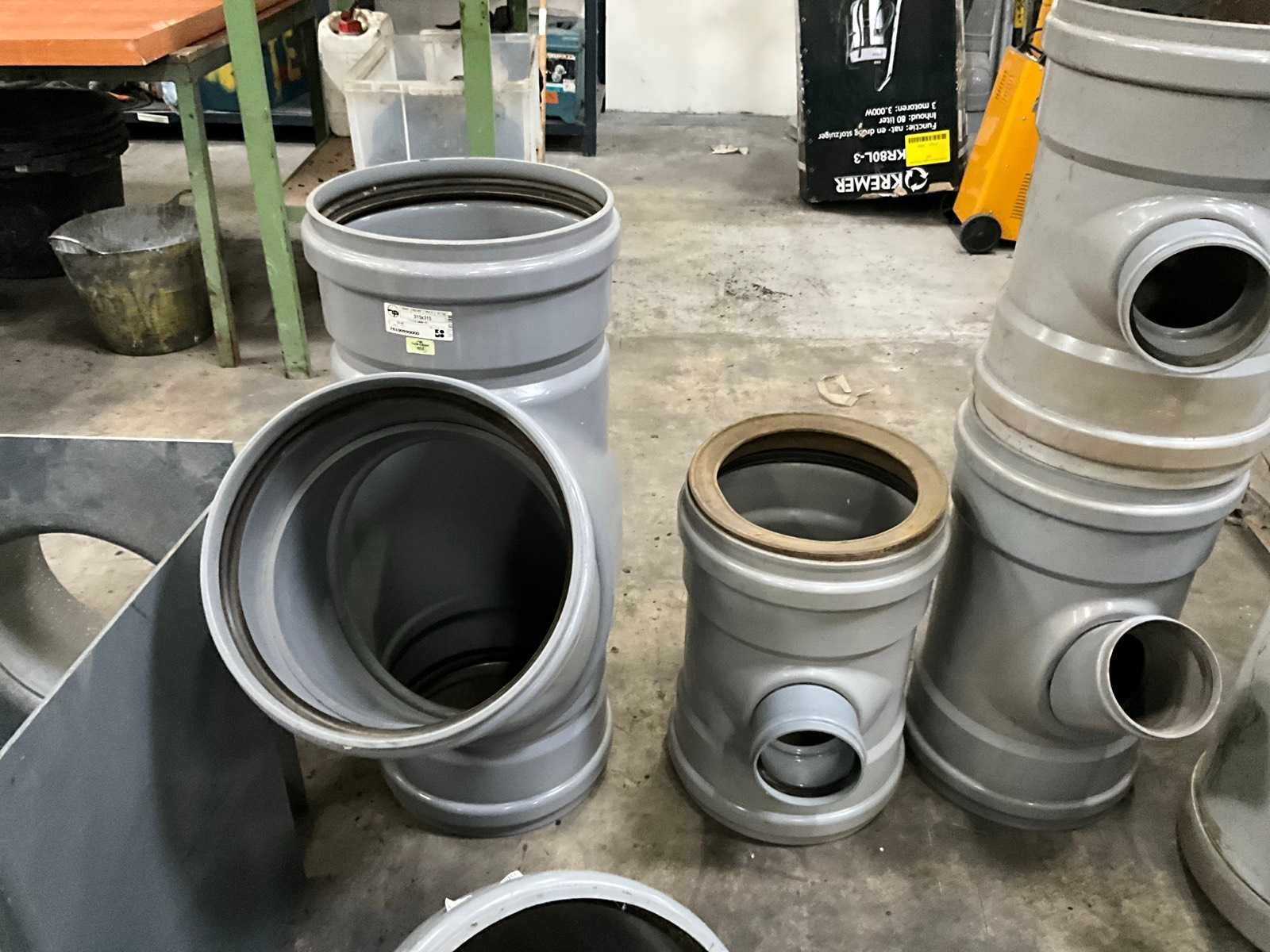 Bestaande uit 5 T-stukken, 3 bochten, 2 doorvoerstukken (steekproef), 2 opzetstukken en 2 diverse moffen. Allen met 31,5 en 40 cm diameter, in diverse hoogtes/lengtes en in kunststoffen pvc uitvoering. Nee