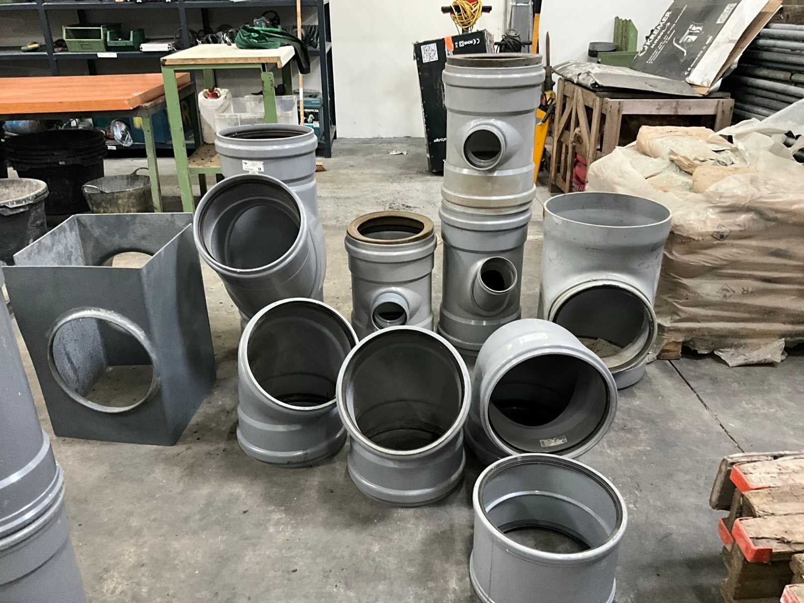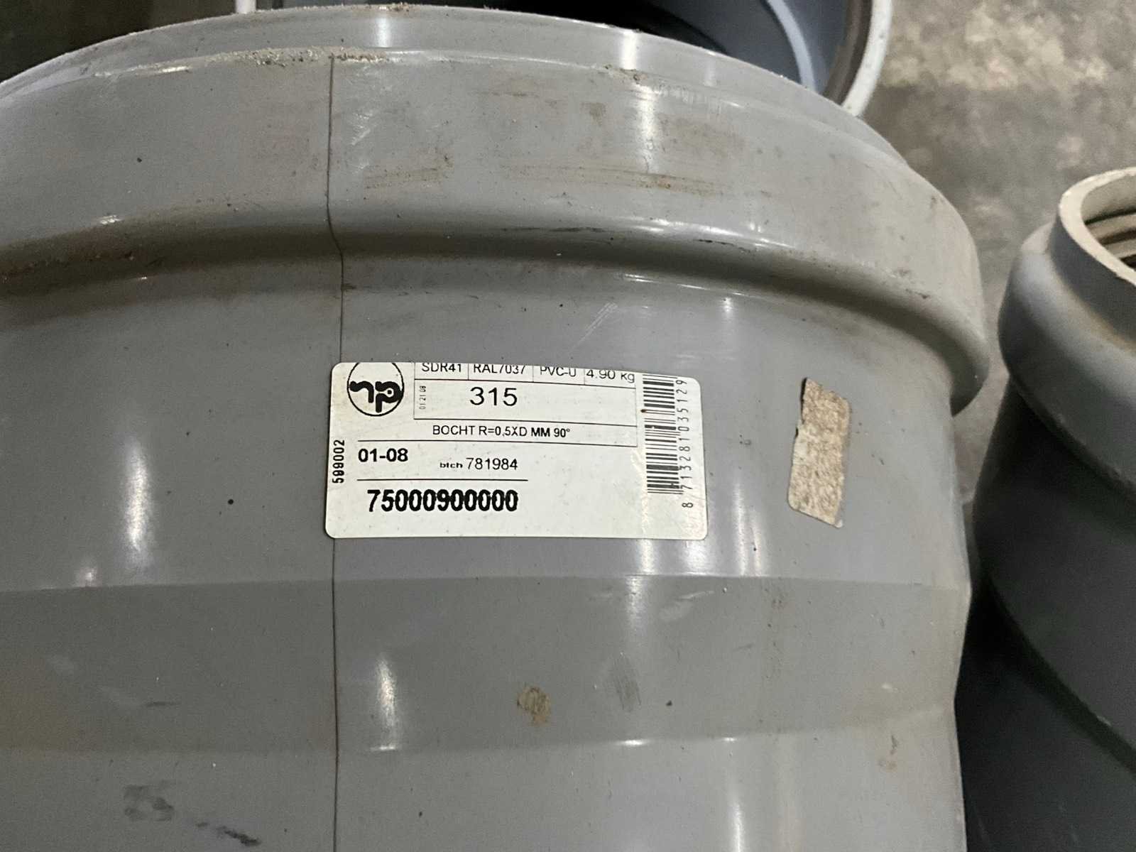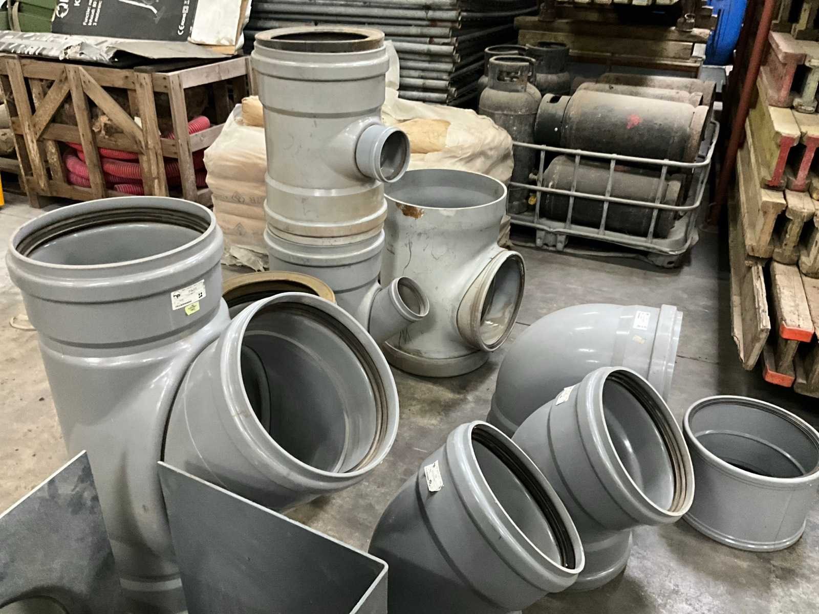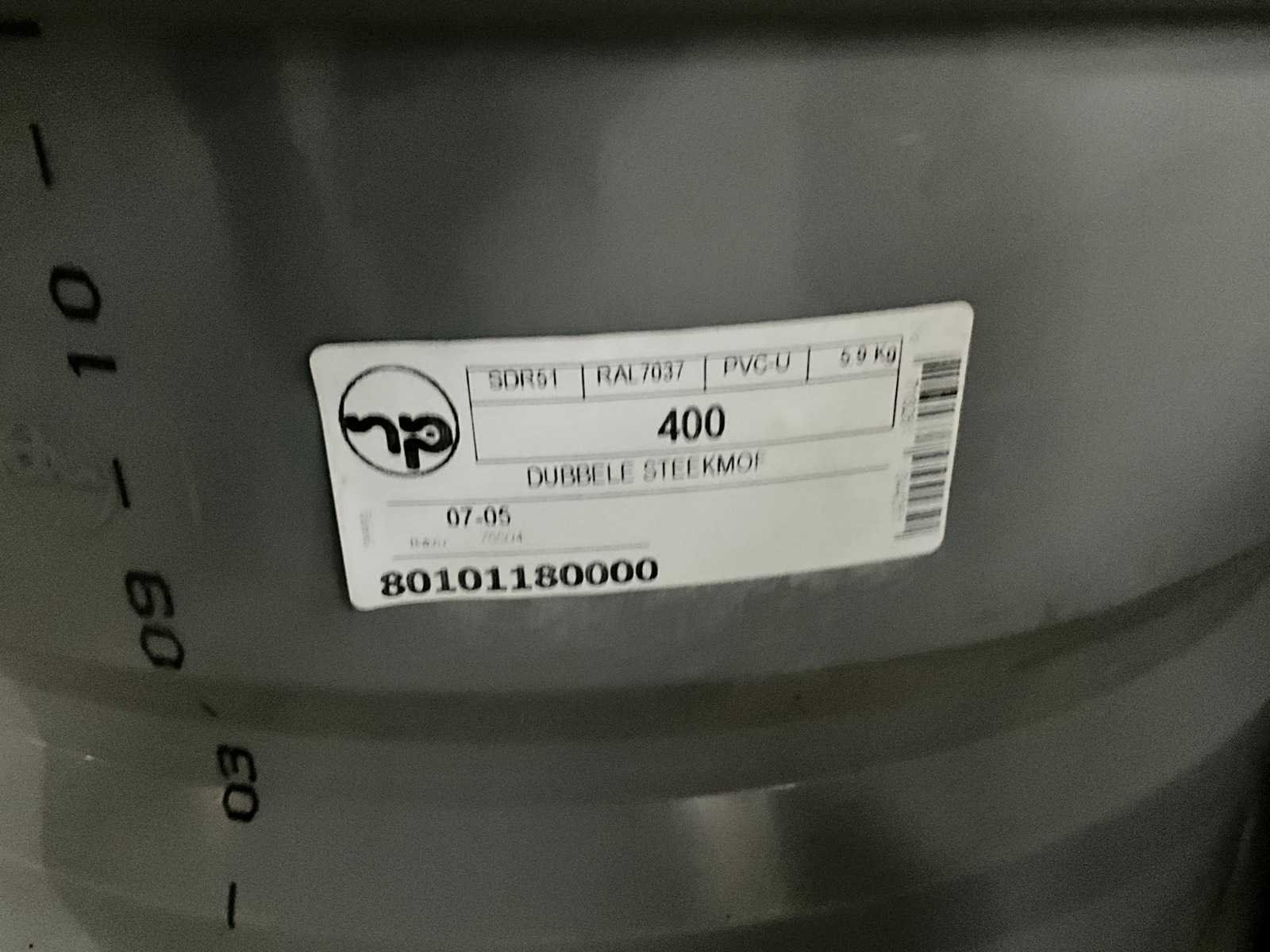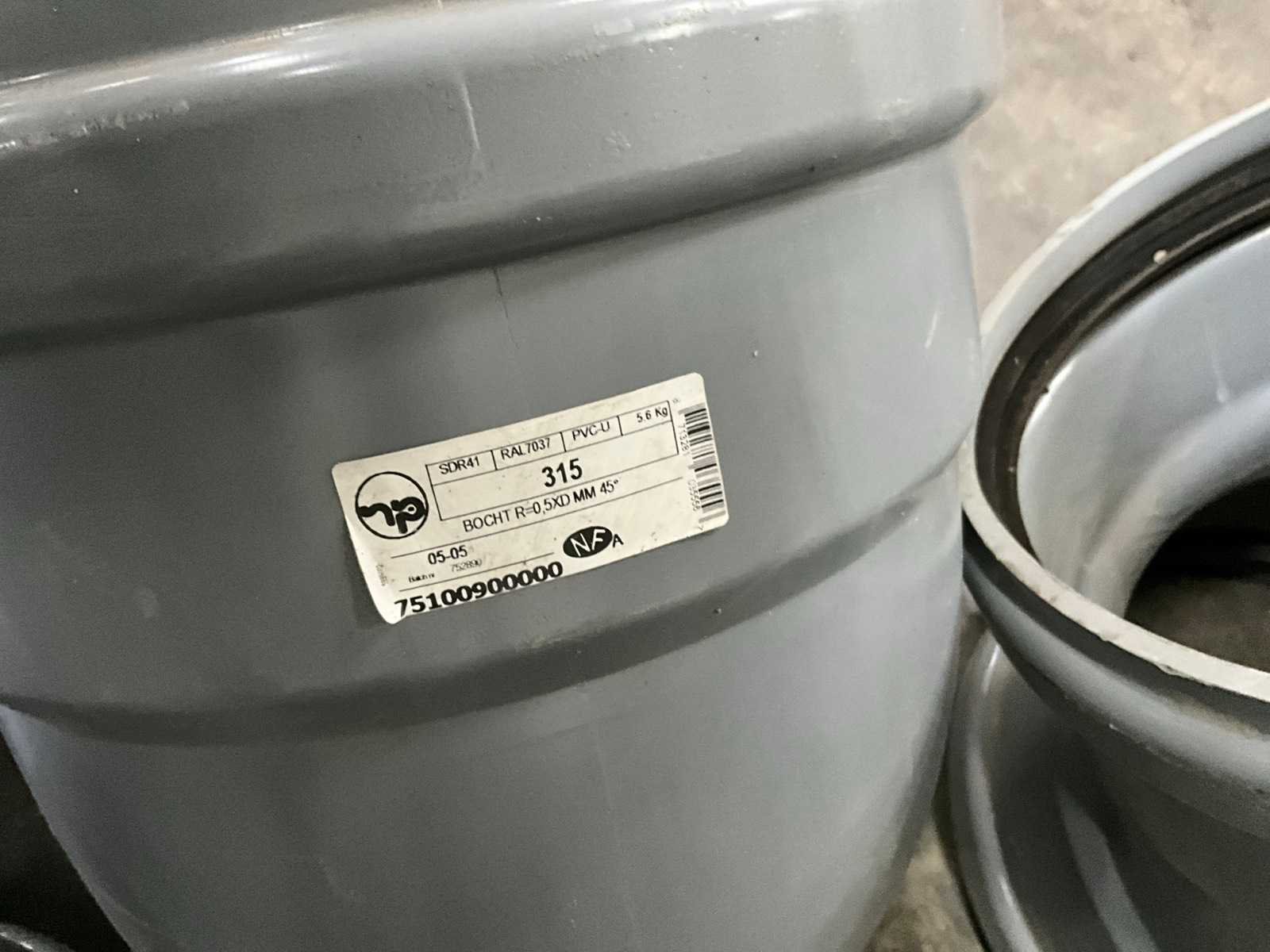 Bestaande uit 5 T-stukken, 3 bochten, 2 doorvoerstukken (steekproef), 2 opzetstukken en 2 diverse moffen. Allen met 31,5 en 40 cm diameter, in diverse hoogtes/lengtes en in kunststoffen pvc uitvoering. Nee