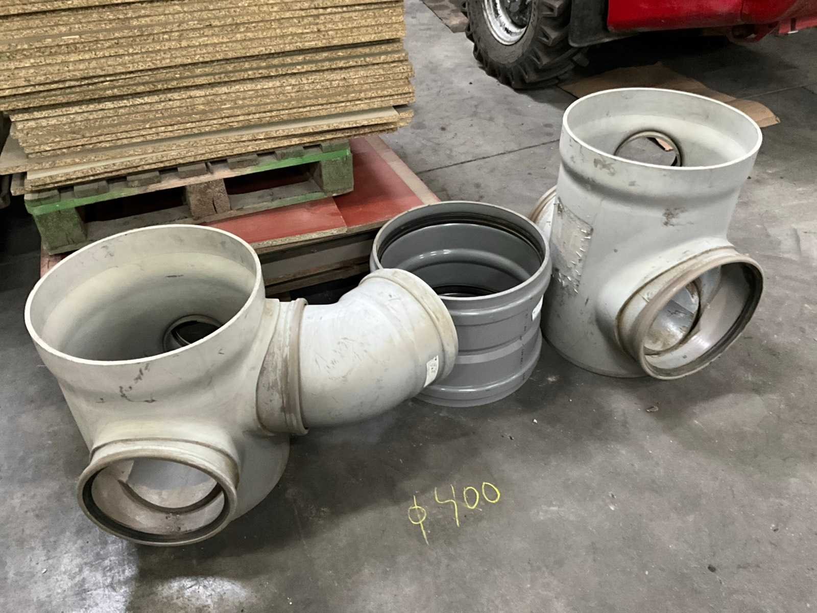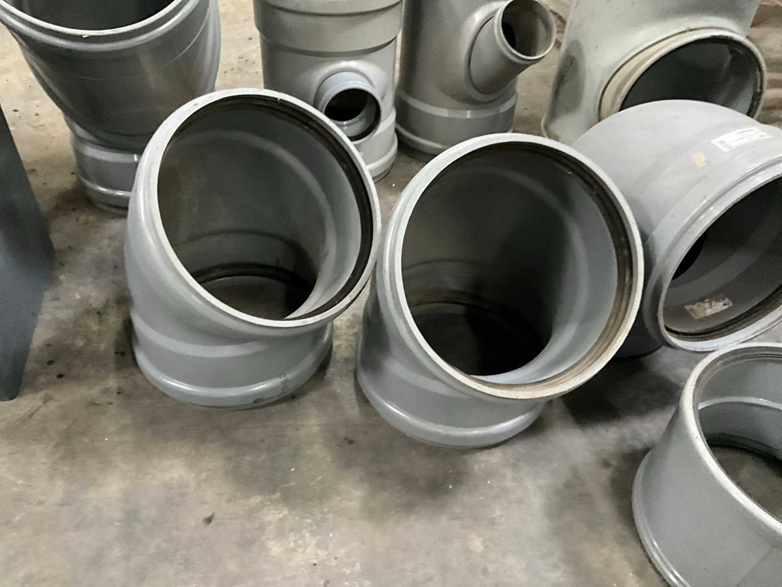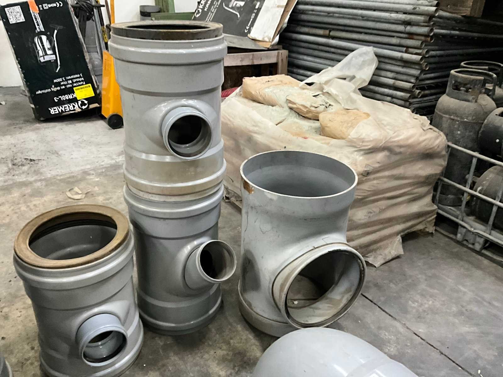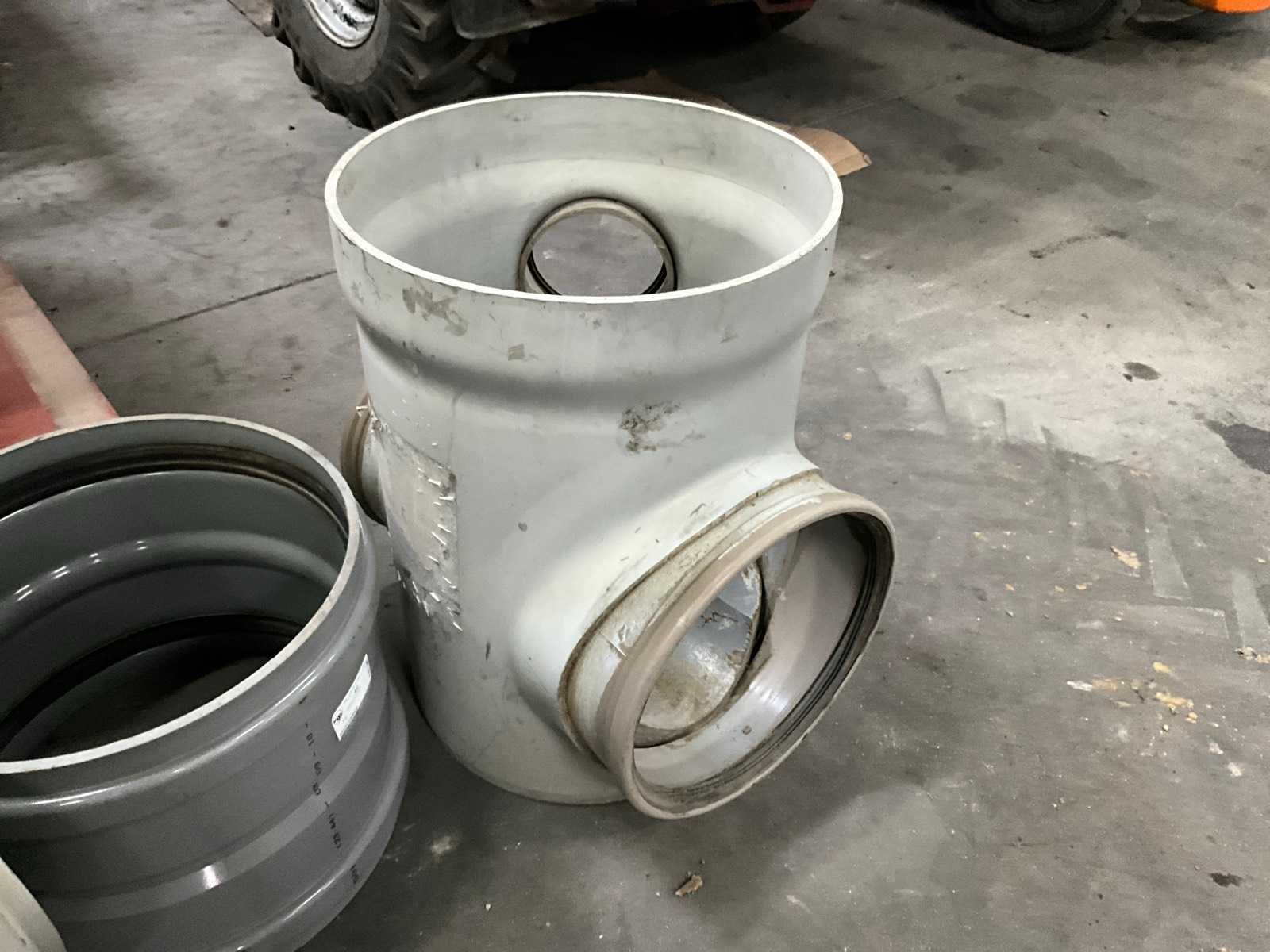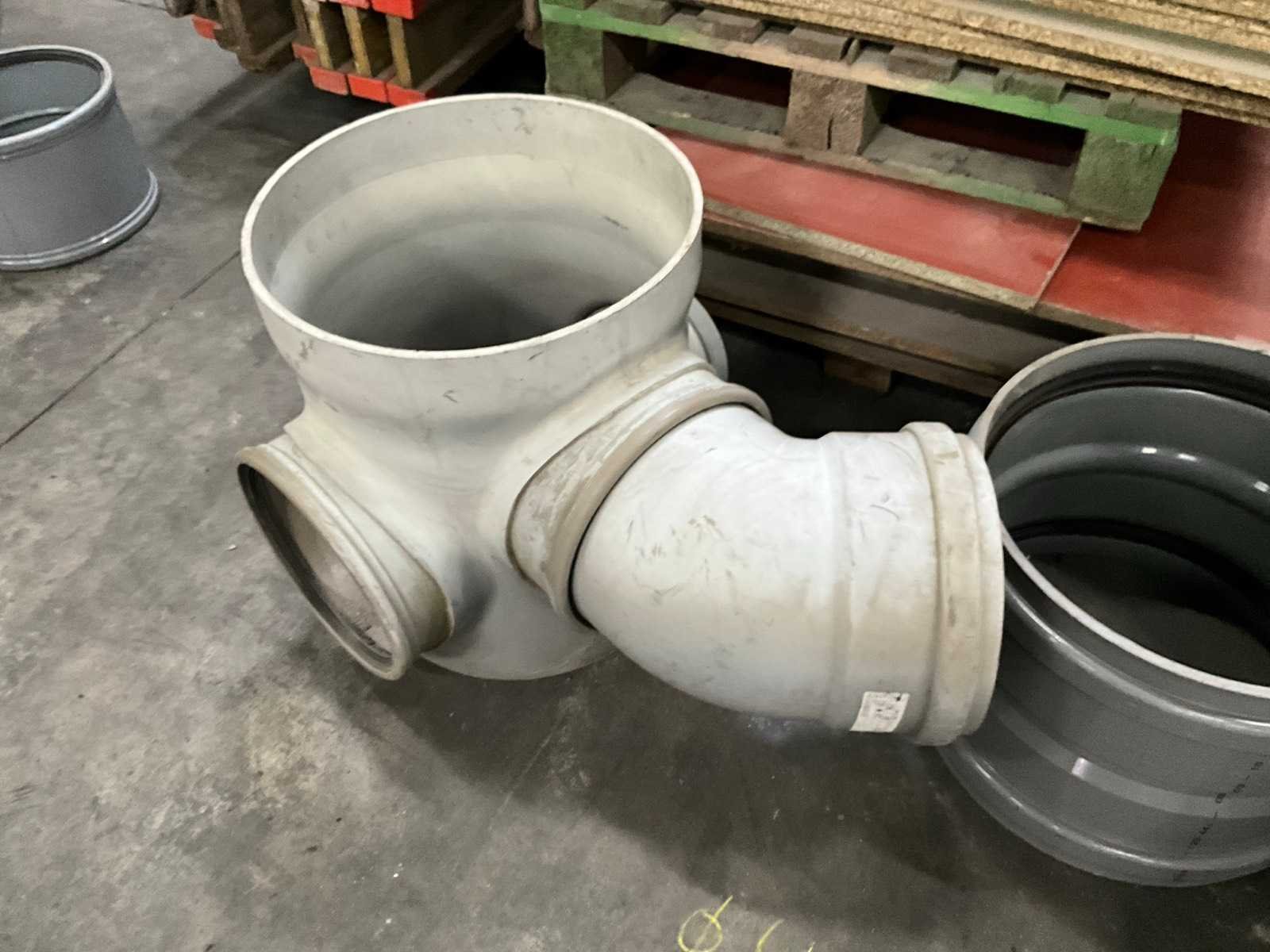 Bestaande uit 5 T-stukken, 3 bochten, 2 doorvoerstukken (steekproef), 2 opzetstukken en 2 diverse moffen. Allen met 31,5 en 40 cm diameter, in diverse hoogtes/lengtes en in kunststoffen pvc uitvoering. Nee