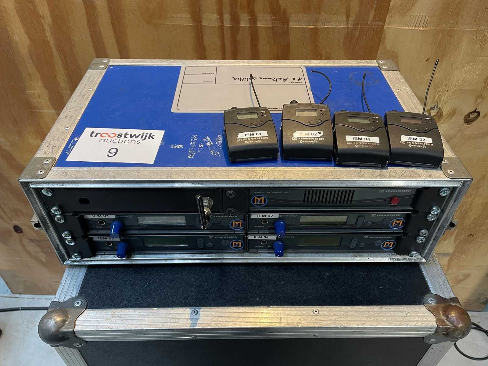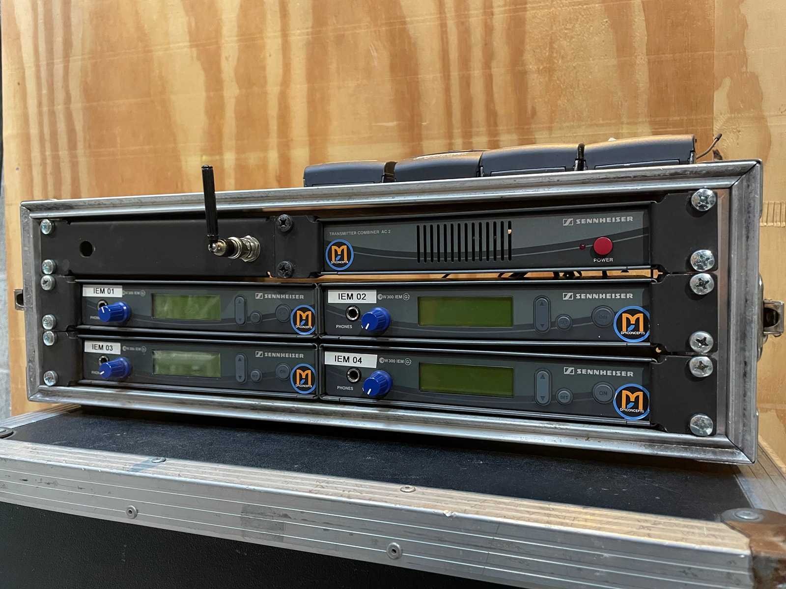 Sennheiser EW300 IEM G2 set (In flightcase) - 1x Sennheiser AC2 Transmitter combiner - 4x Sennheiser EW300 IEM G2 Transmitter - 4x Sennheiser EW300 IEM G2 Bodypack Frequency: (518–554 MHz) Nee Merk: Sennheiser Type: EW300 IEM G2