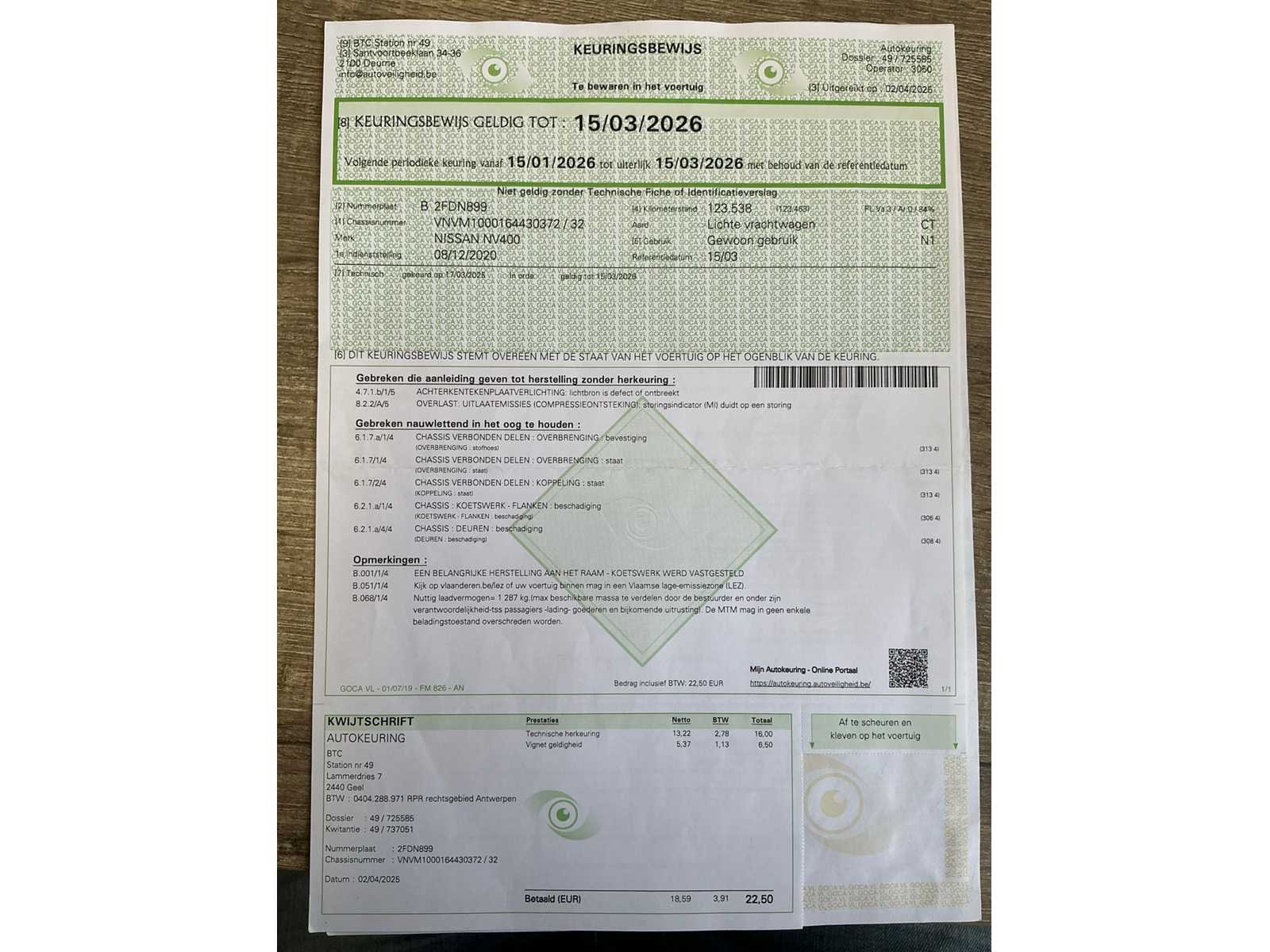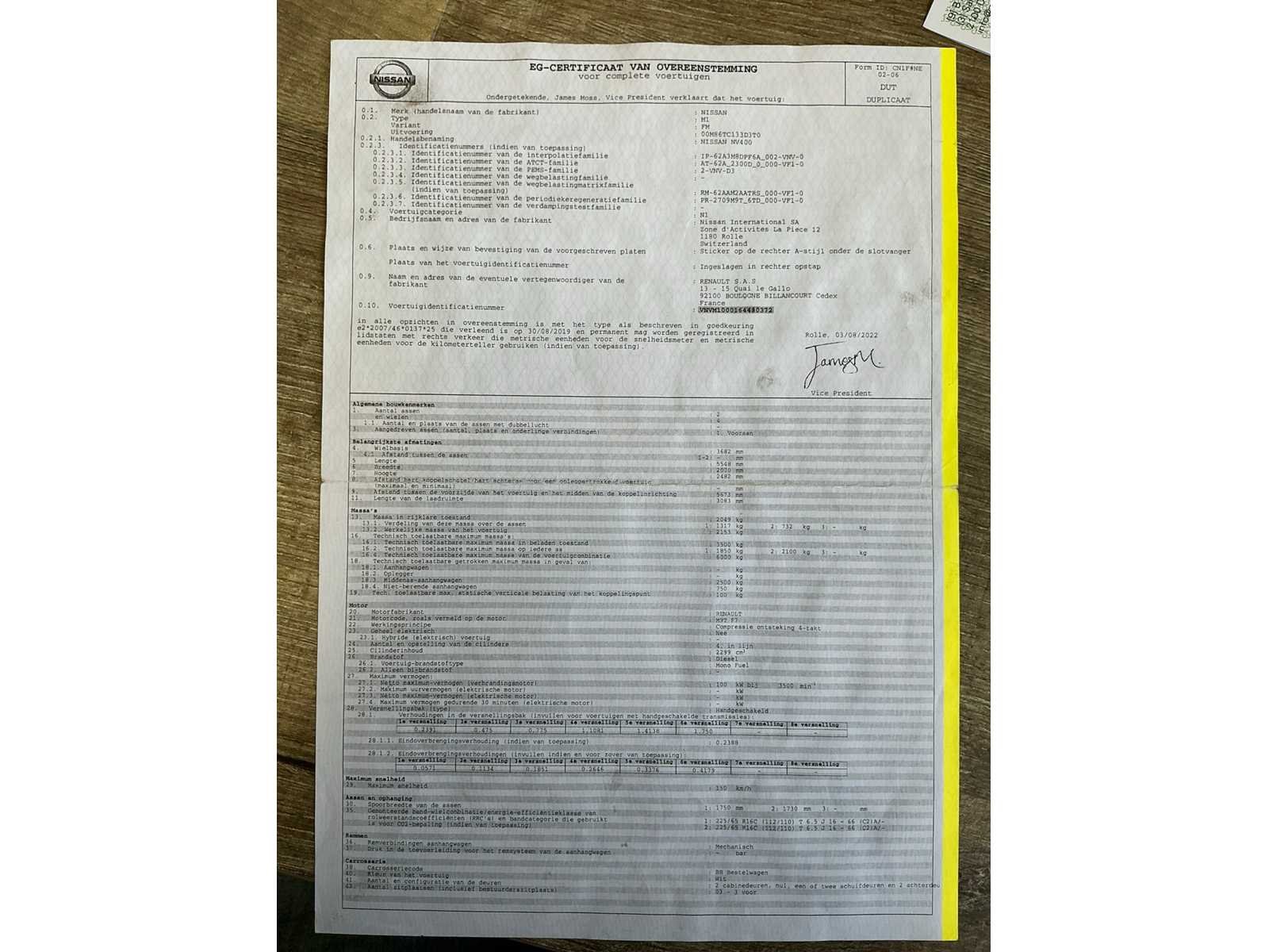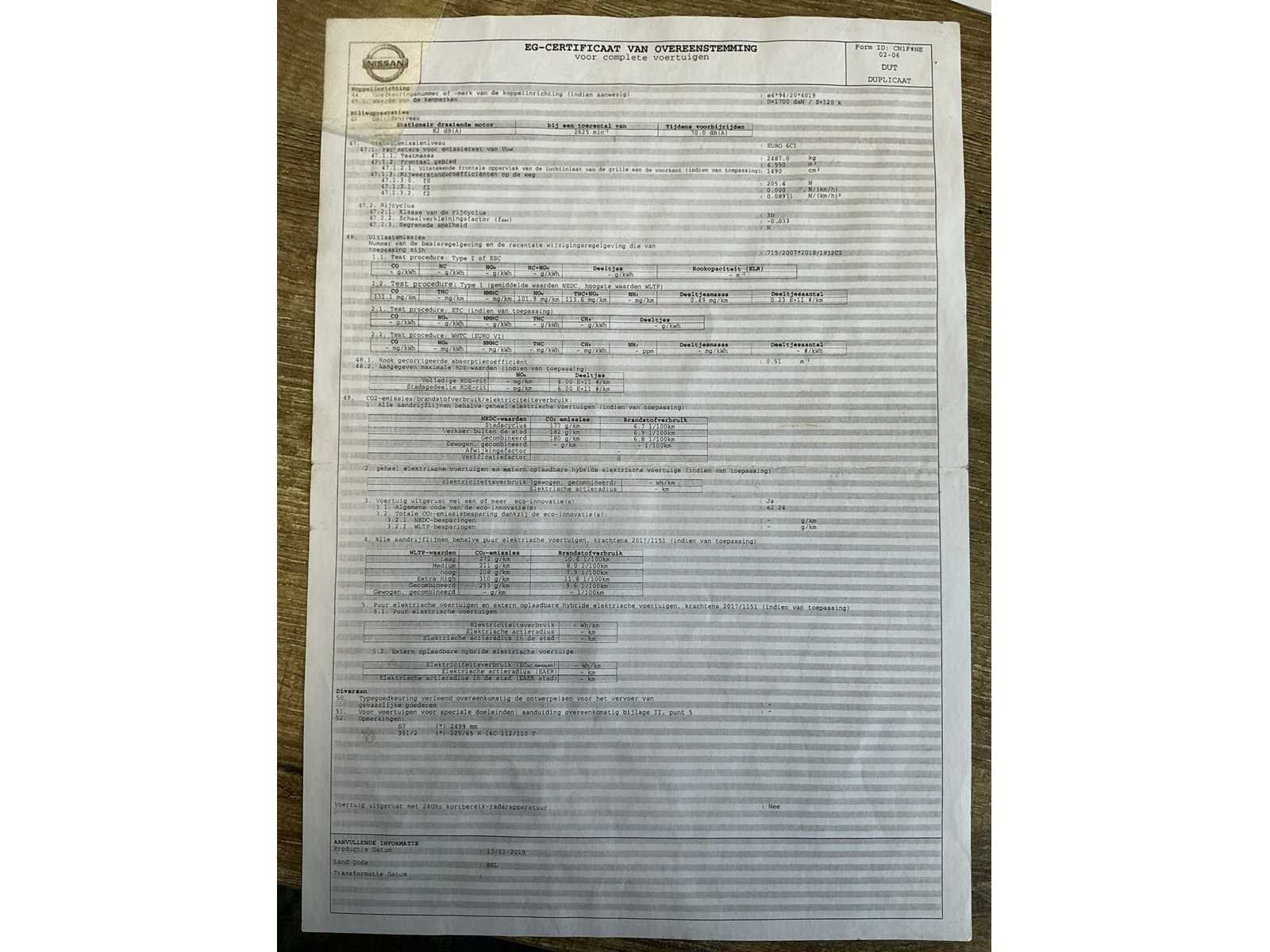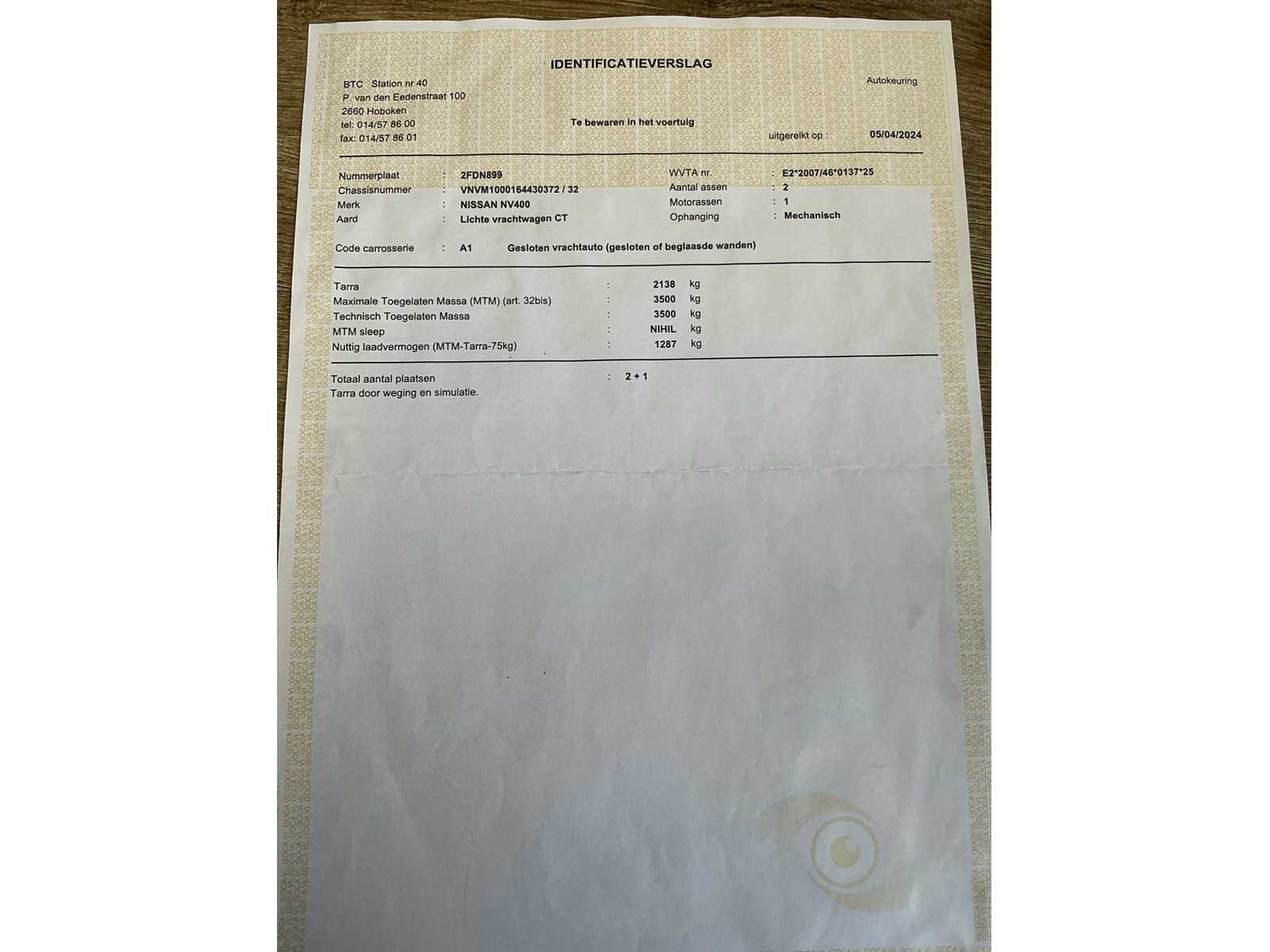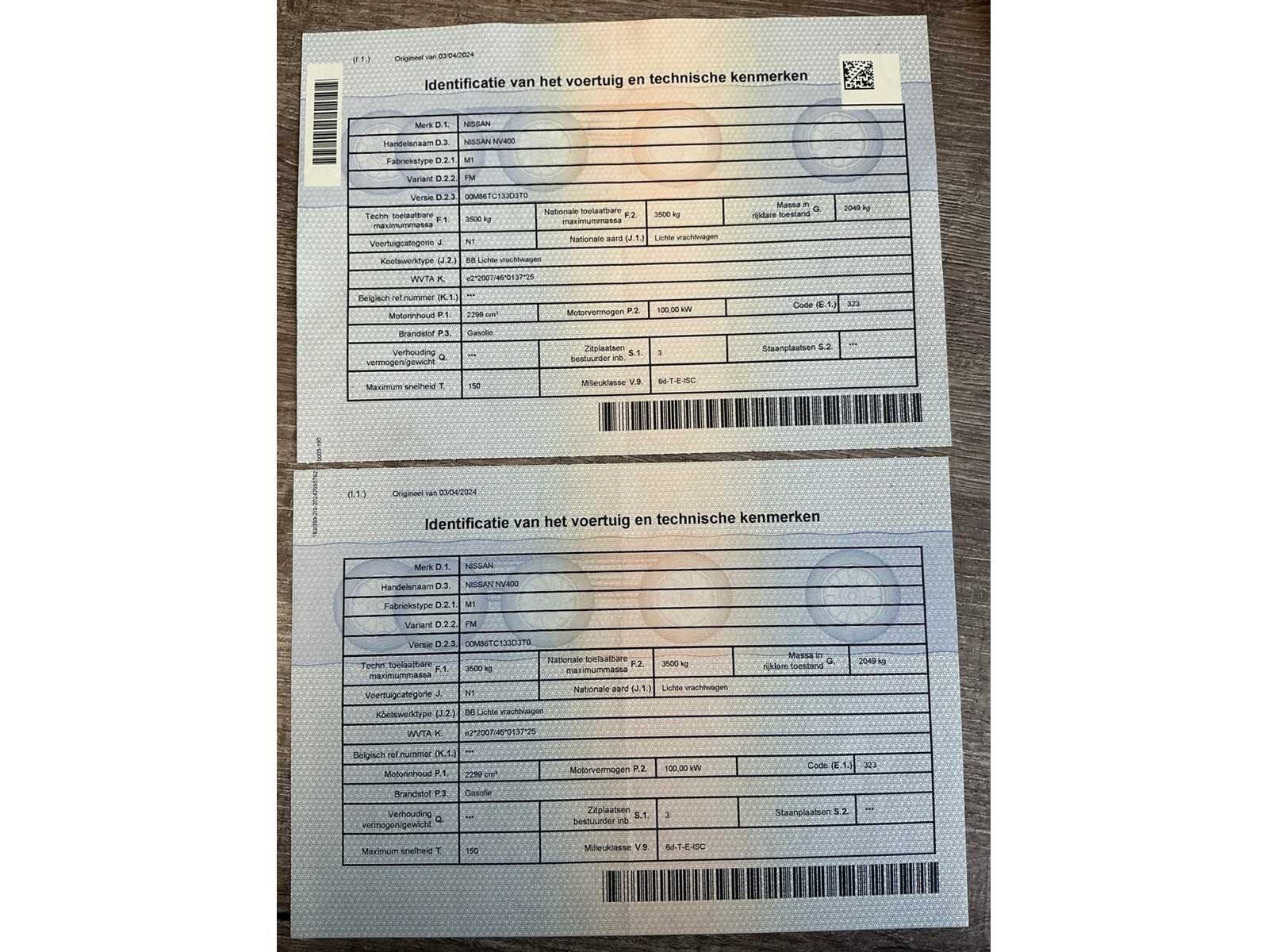 Voorzien van inschrijvingsbewijs deel 1 en deel 2, gelijkvormigheidsattest, keuringsbewijs geldig tot 15/03/2026 en identificatie verslag Nee Merk: Nissan Type: NV400 Bouwjaar: 2020 Chassisnummer: VNVM1000164430372 Afgelezen kilometerstand: 123631km Cilinderinhoud: 2299cc Vermogen (kW): 100kW Brandstof: diesel Datum eerste inschrijving: 08/12/2020 Aantal zitplaatsen: 3 Nationaliteit documenten: België Aantal sleutels: 2 Ledig gewicht: 2138kg Emissieklasse: 6d-T-E-ISC Startinformatie: Start en rijdt