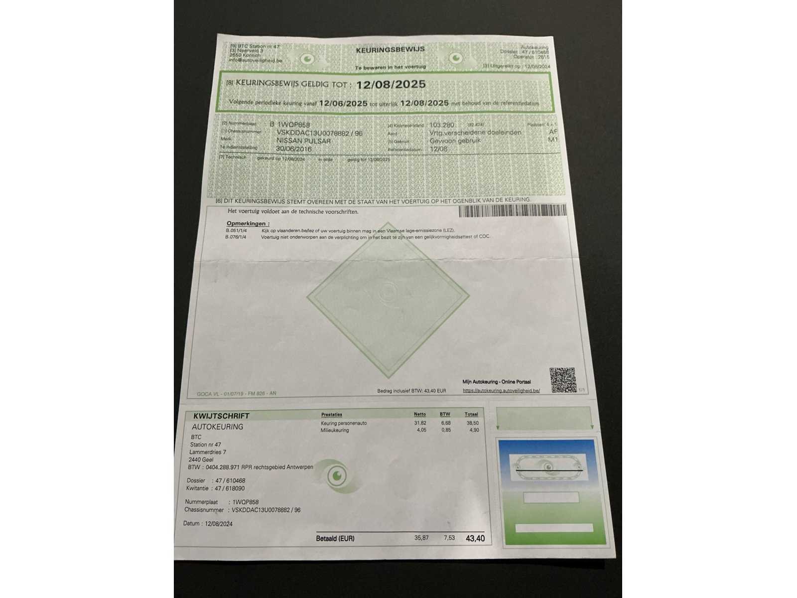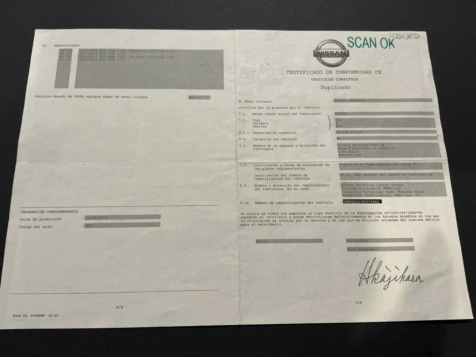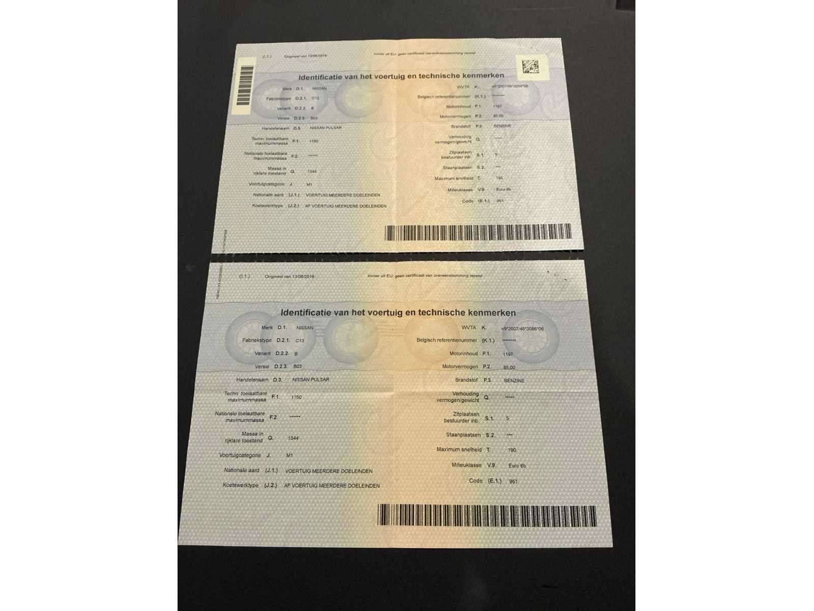 Nee Merk: Nissan Model: Pulsar Bouwjaar: 2016 Afgelezen kilometerstand: 111564km Cilinderinhoud: 1197cc Vermogen (kW): 85kW Brandstof: benzine Chassisnummer: VSKDDAC13U0078882 Datum eerste toelating: 30/06/2016 Aantal zitplaatsen: 5 Emissieklasse: Euro 6b Aantal sleutels: 1 Gelijkvormigheidsattest aanwezig: true Start en rijdt: Ja Keuringsrapport geldig tot: 12/08/2025 Airconditioning: true Inschrijvingsbewijs - deel 1 : Aanwezig Inschrijvingsbewijs - deel 2: Aanwezig