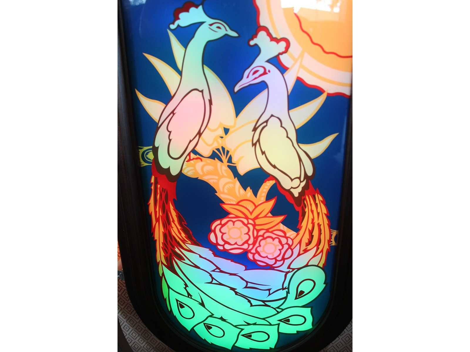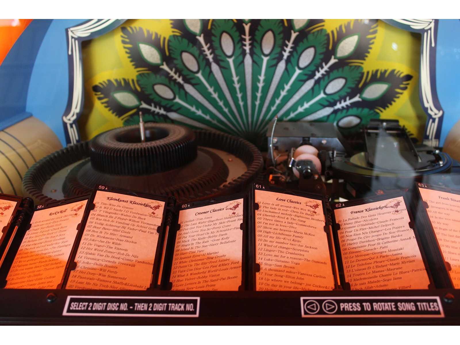 100 cd selecties, verkleurende pauwen, bubble tubes, met muntinworp, K99 techniek, afstandsbediening, documentatie Nee Merk: Wurlitzer Type: 850 Peacock Gewicht: 170 Lengte: 670mm Breedte: 990mm Hoogte: 1650mm
