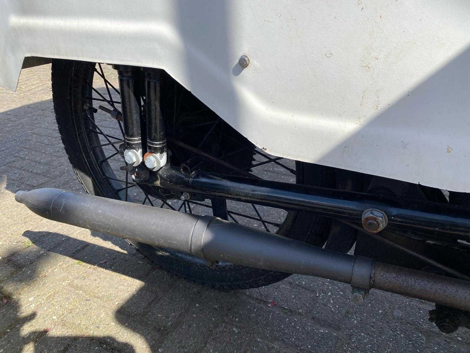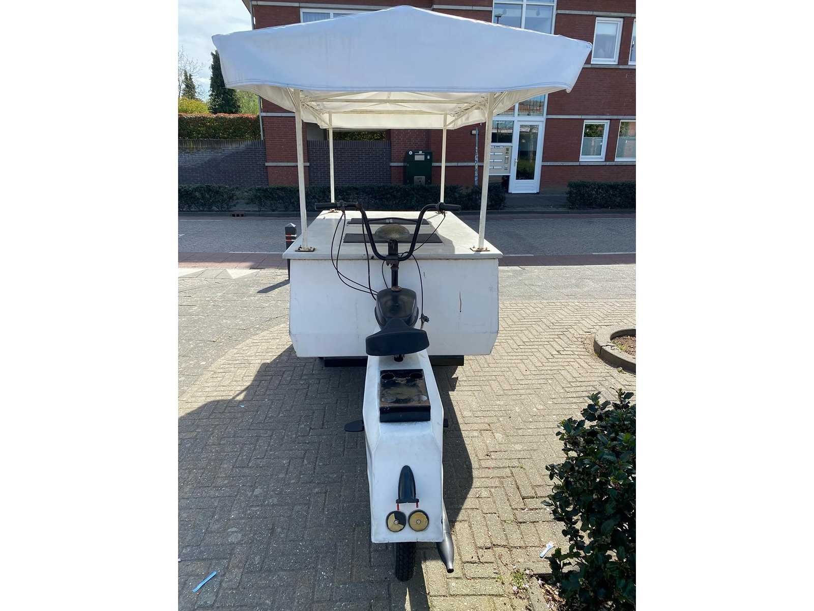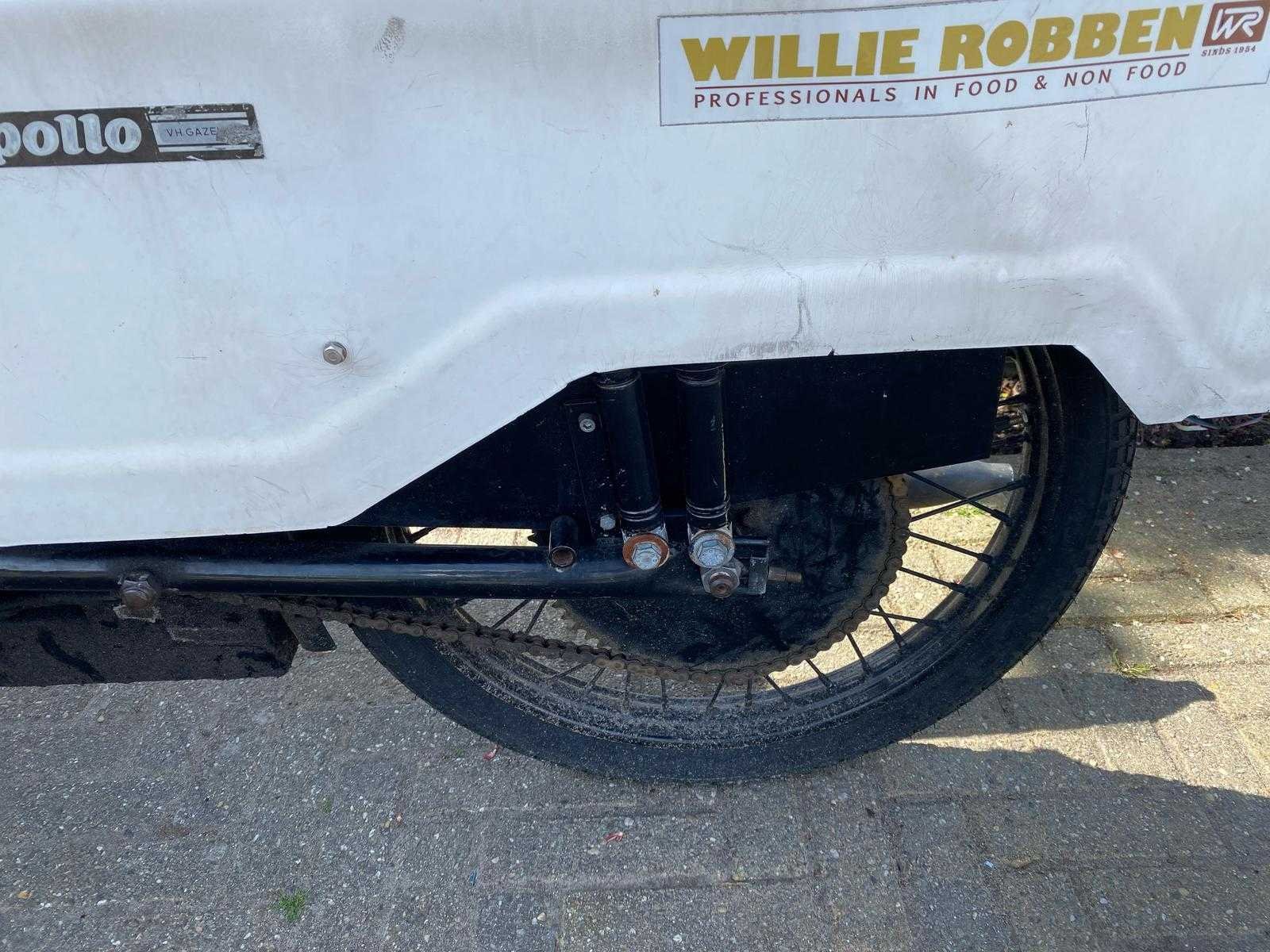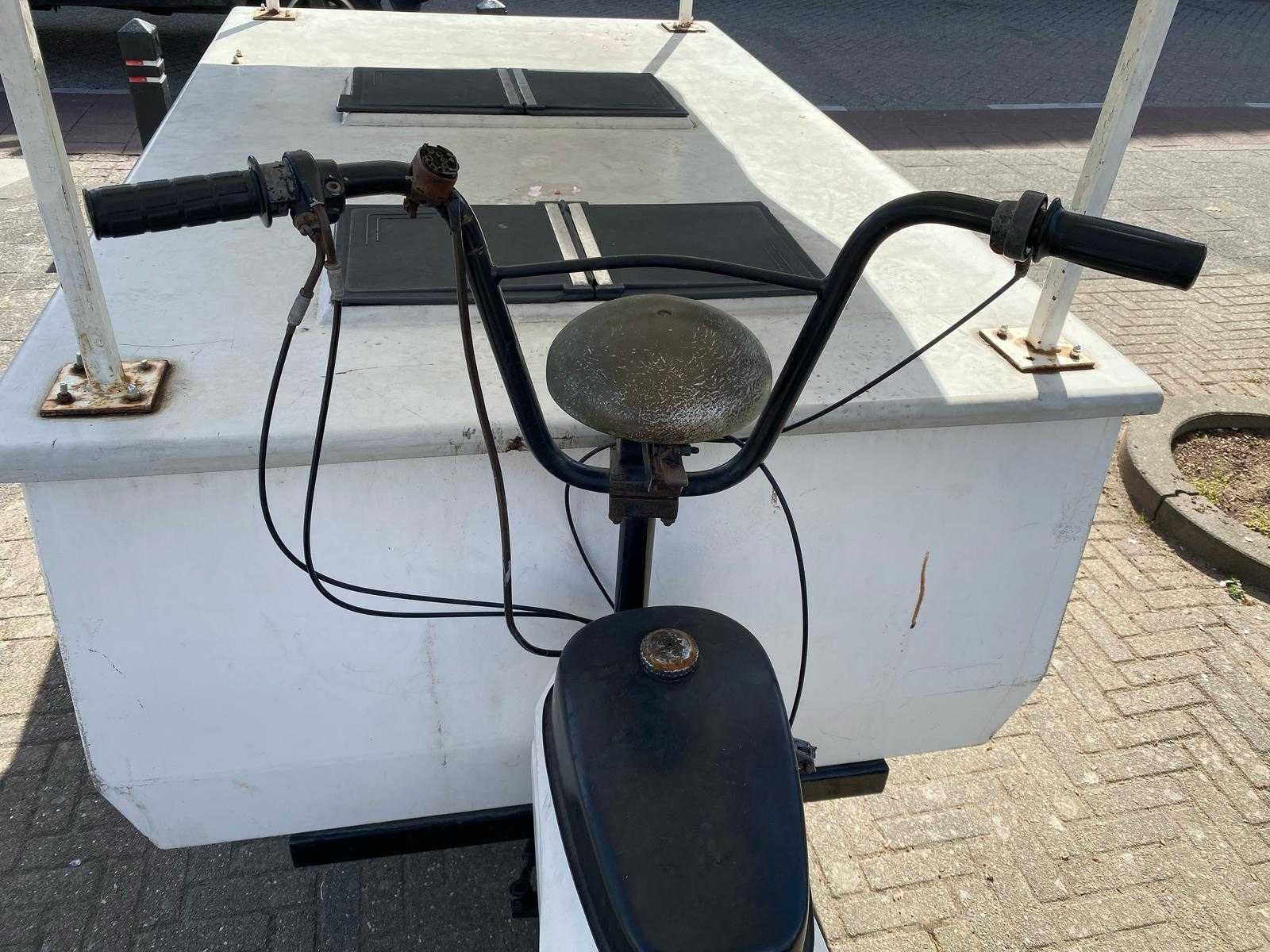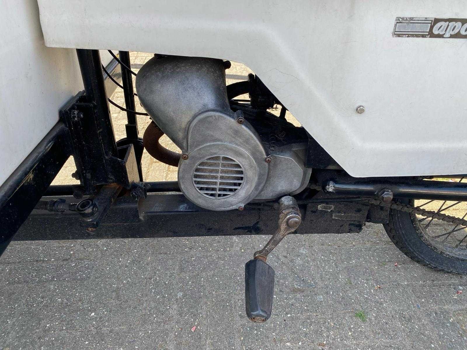Brommer 50 cc met koelingsruimte, koelsysteem is vernieuwd maar moet nog gevuld worden, rijdt en remt goed, 185 x 115 cm, brommer 120 cm, 200 cm hoog, geen documenten, jaren 50 van de vorige eeuw Nee Merk: Apollo