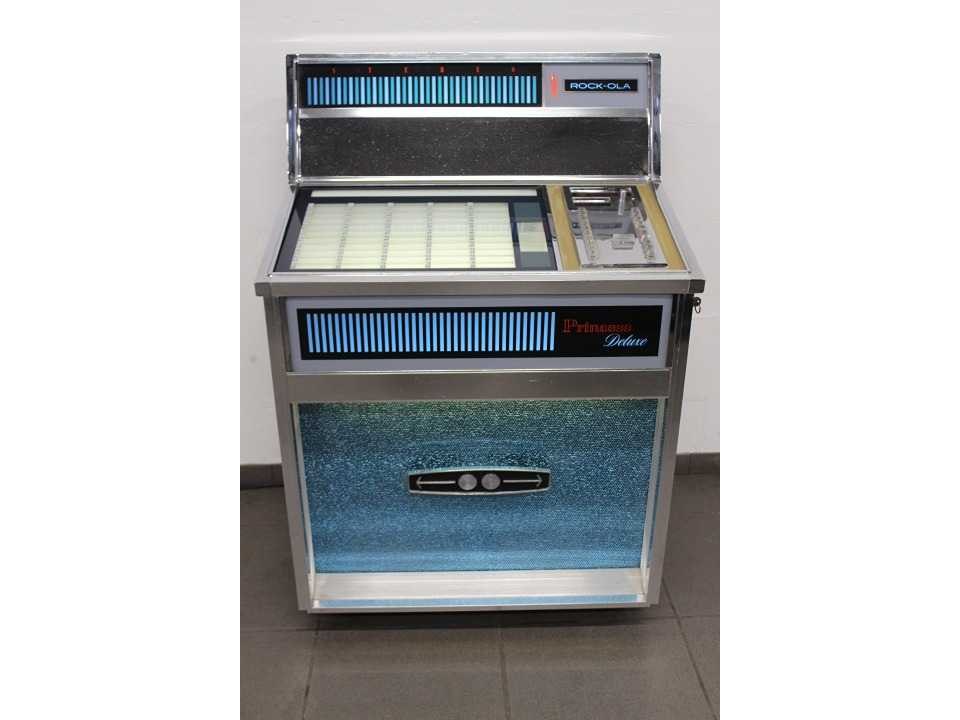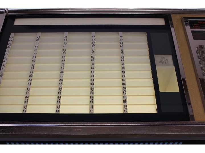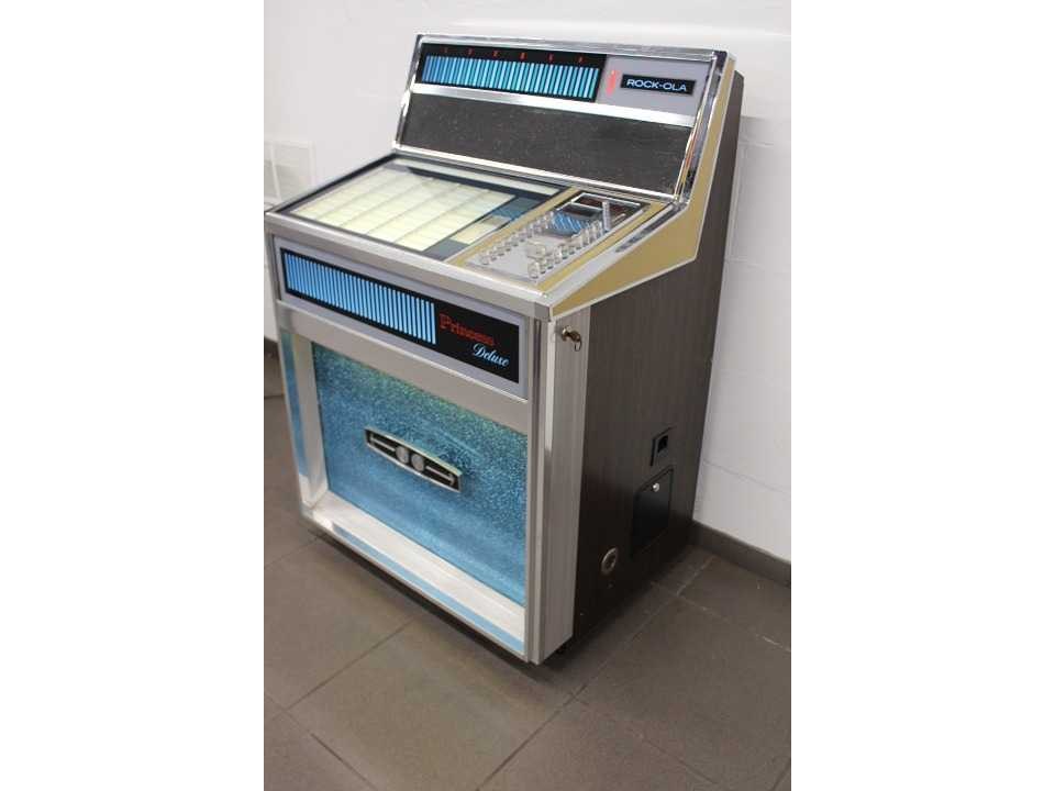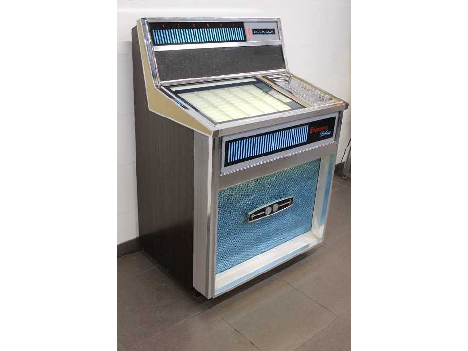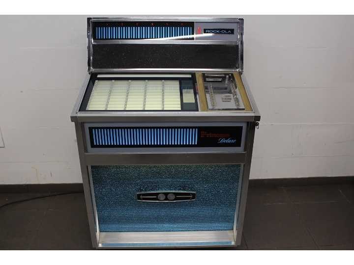 100 selecties, 45 tpm singles (worden erbij geleverd), compacte jukebox met draadafstandsbediening Nee Merk: Rock Ola Type: Princess de Luxe Bouwjaar: 1967 Lengte: 620mm Breedte: 800mm Hoogte: 1170mm