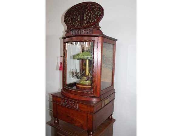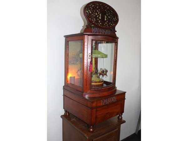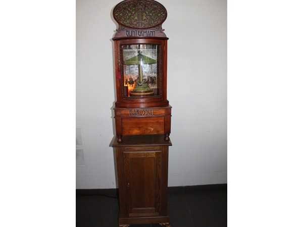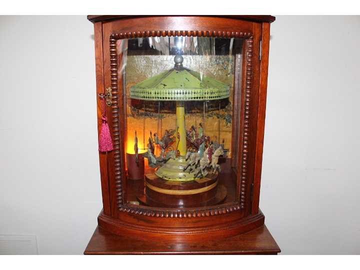 Draaicaroussel van tin (1911) in vitrinekast, met muntinworp 0,25 cent, draait rond met kermismuziek No Merk: Guntherman