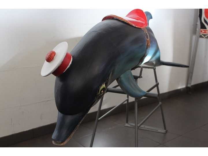 Houten Dolfijn met origineel metalen schommelstel; afkomstig van draaimolen Nee Fabrikant: Bernard Kindt Materiaal: Hout Periode: 1962 Hoogte: 90cm Lengte: 150cm