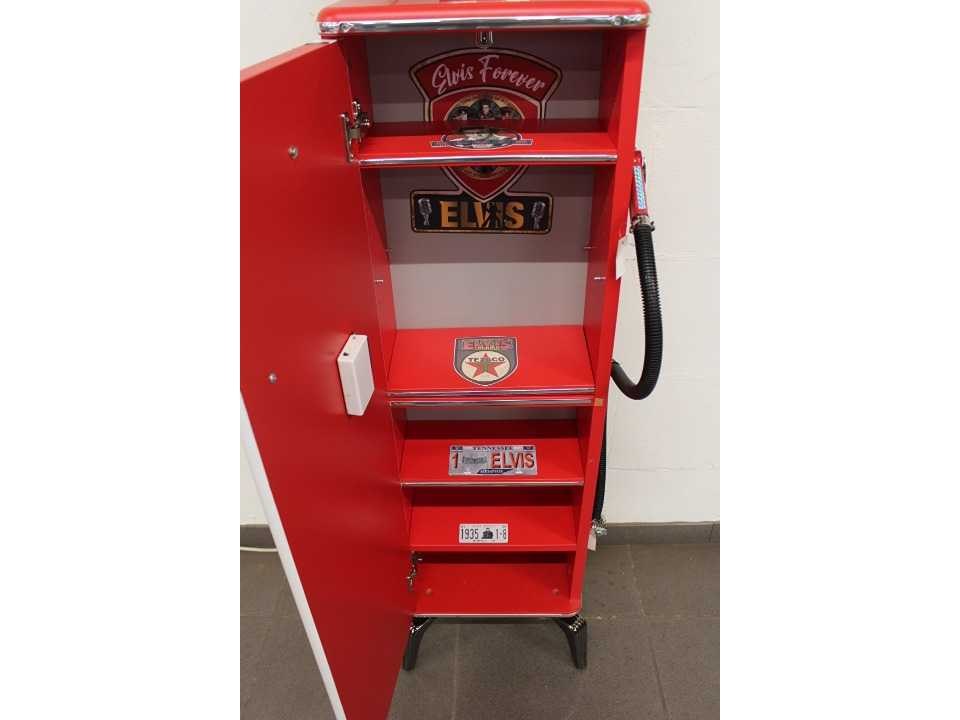 Decoratieve kast in de vorm van een benzinepomp, met globe en LED verlichting, met klok No Merk: Elvis Presley Model: Benzinepomp kast Kleur: Rood/ Wit Hoogte: 160
