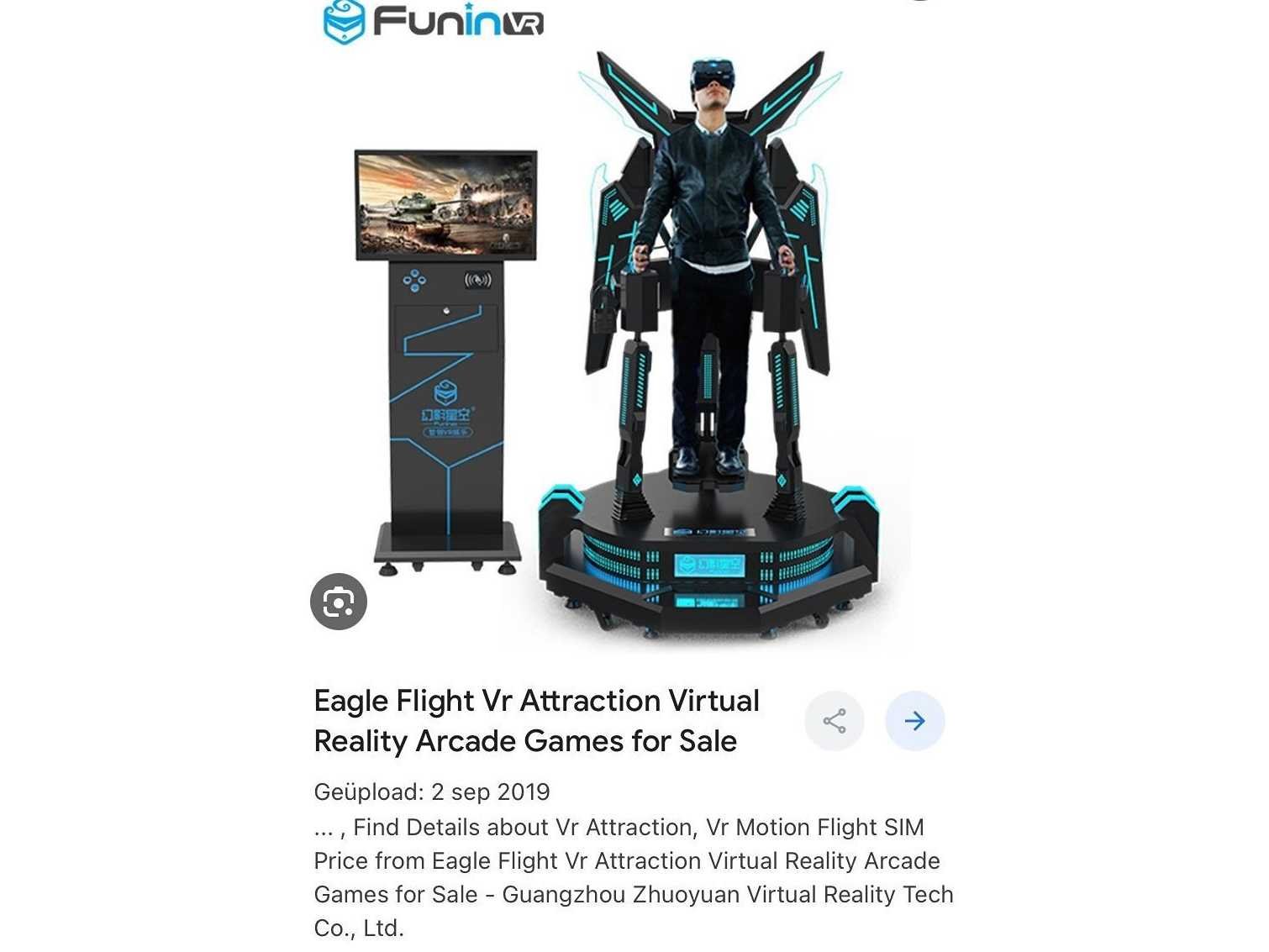 Spectaculair VR Realty spel, werkt op euromunten, LED verlichting, VR bril https://www.funinvrstar.com/funinvr-9d-virtual-reality-eagle-flight-vr-game-machine/ No Merk: VR Gaming Type: Eagle Flight Lengte: 126cm Breedte: 126cm Hoogte: 245cm Gewicht: 200kg Bouwjaar: 2016