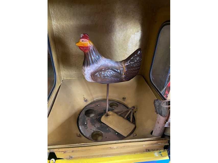 Capsuleautomaat met kip die capsule geeft, vintage metalen kast, werkt op Nederlands geld No Type: Verrassingsei Bouwjaar: 1968
