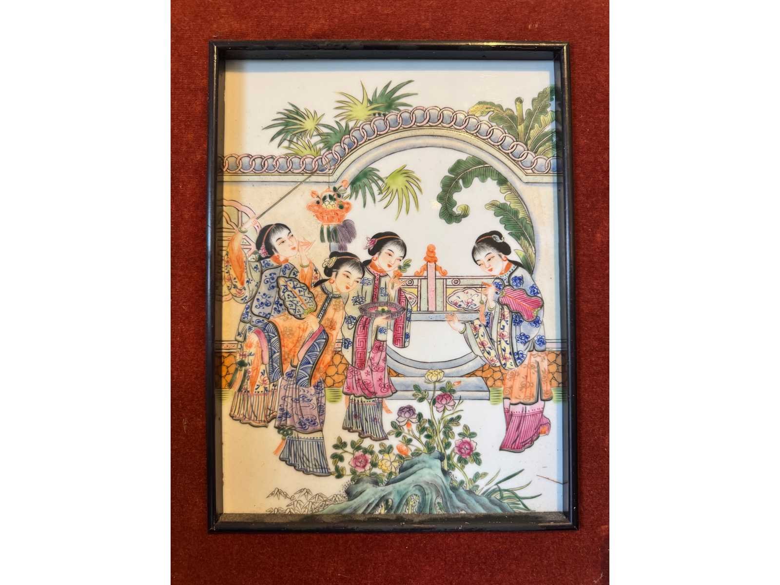 Verzameling Chinese items. 3 items. Porselein tablet ingelijst in suede omlijsting, Dehua blanc de chine beeldje van Guanyin gestempeld, Jingdezhen vaasje met fazanten gestempeld. No