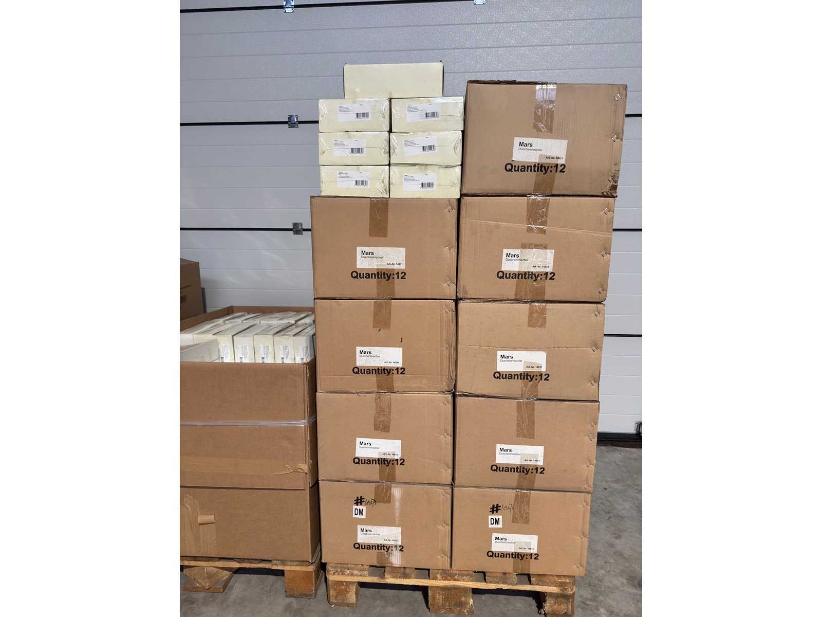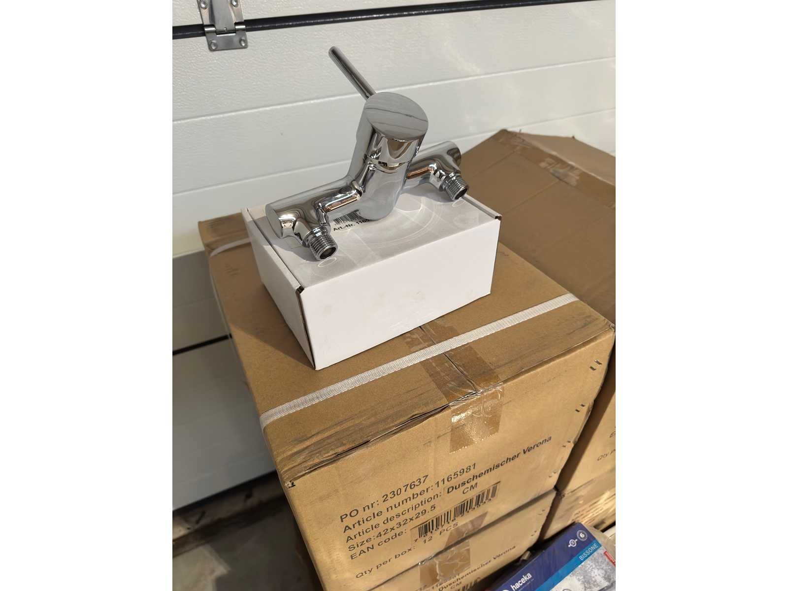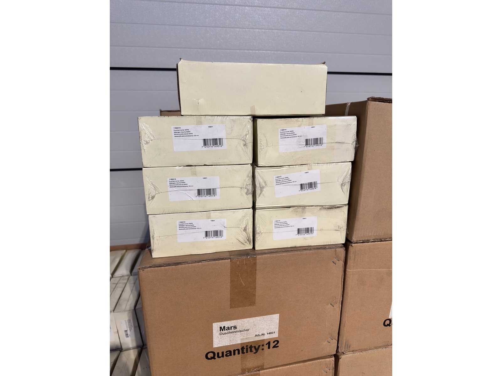 Partij luxe badkranen en douchekranen. Gemaakt in Zwitserland. 421 stuks in totaal. 3 pallets. No 1e: 242 stuks Domit Mars douchekraan met één hendel 2e: 75 stuks Domit Mars badkraan & douchekraan met één hendel 3e: 69 stuks Domit Verona douchekraan 4e: 18 stuks inbouw douchekraan 5e: 11 stuks Domit Thermis douchekraan 6e: 6 stuks diverse kranen (zie foto)