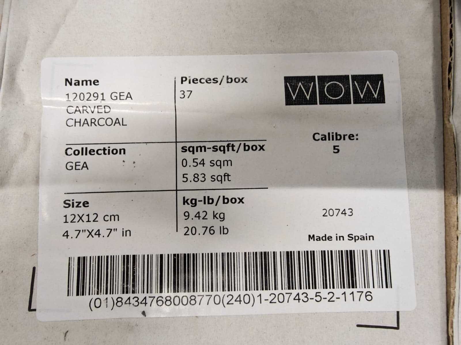 Nee Merk: WOW Kleur: Charcoal Afwerking: Mat Lengte: 12cm Breedte: 12cm Materiaal: Keramiek Dikte: 8mm Type: Wandtegel Model: Gea Carved Gewicht: 750kg Aantal m² per verpakking: 0.54m² Aantal pakken: 70