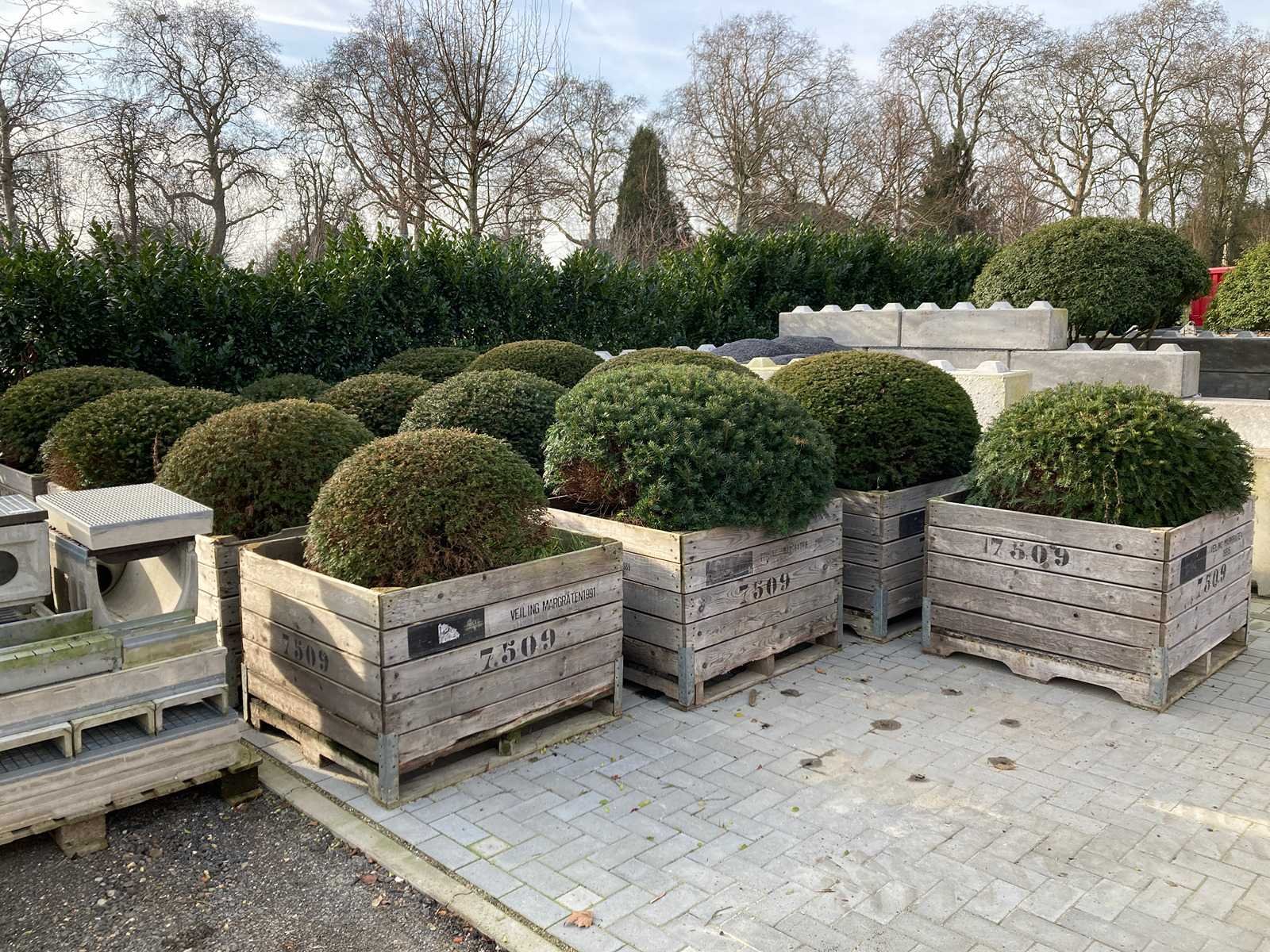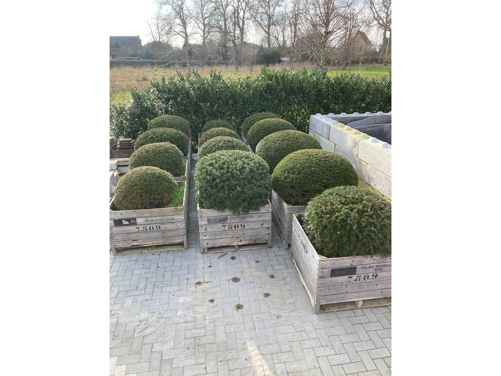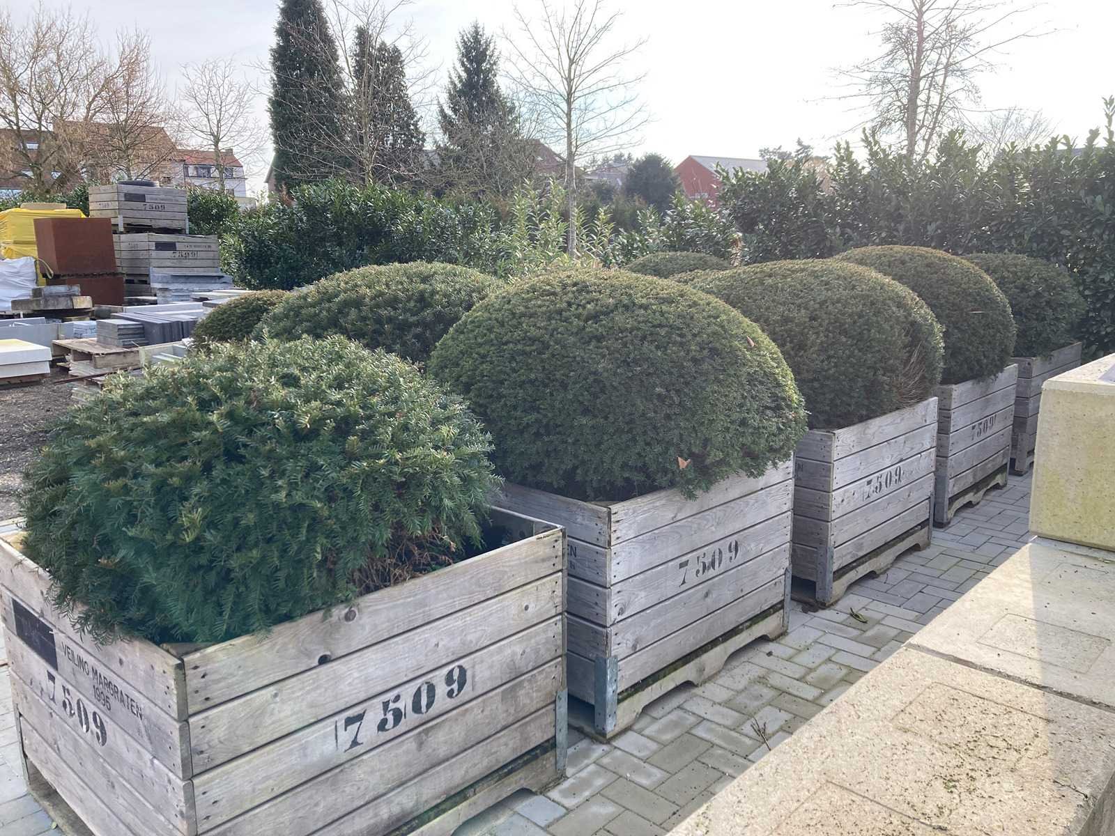 13 stuks taxusbollen in eikenhouten bakken Diameters van 90cm t.e.m. 130cm Totale hoogte met bak +/- 140cm Bakken zijn 110x110cm Nee Latijnse benaming: Taxus baccata Hoogte ca.: 60cm In pot: true Diameter ca.: 130cm