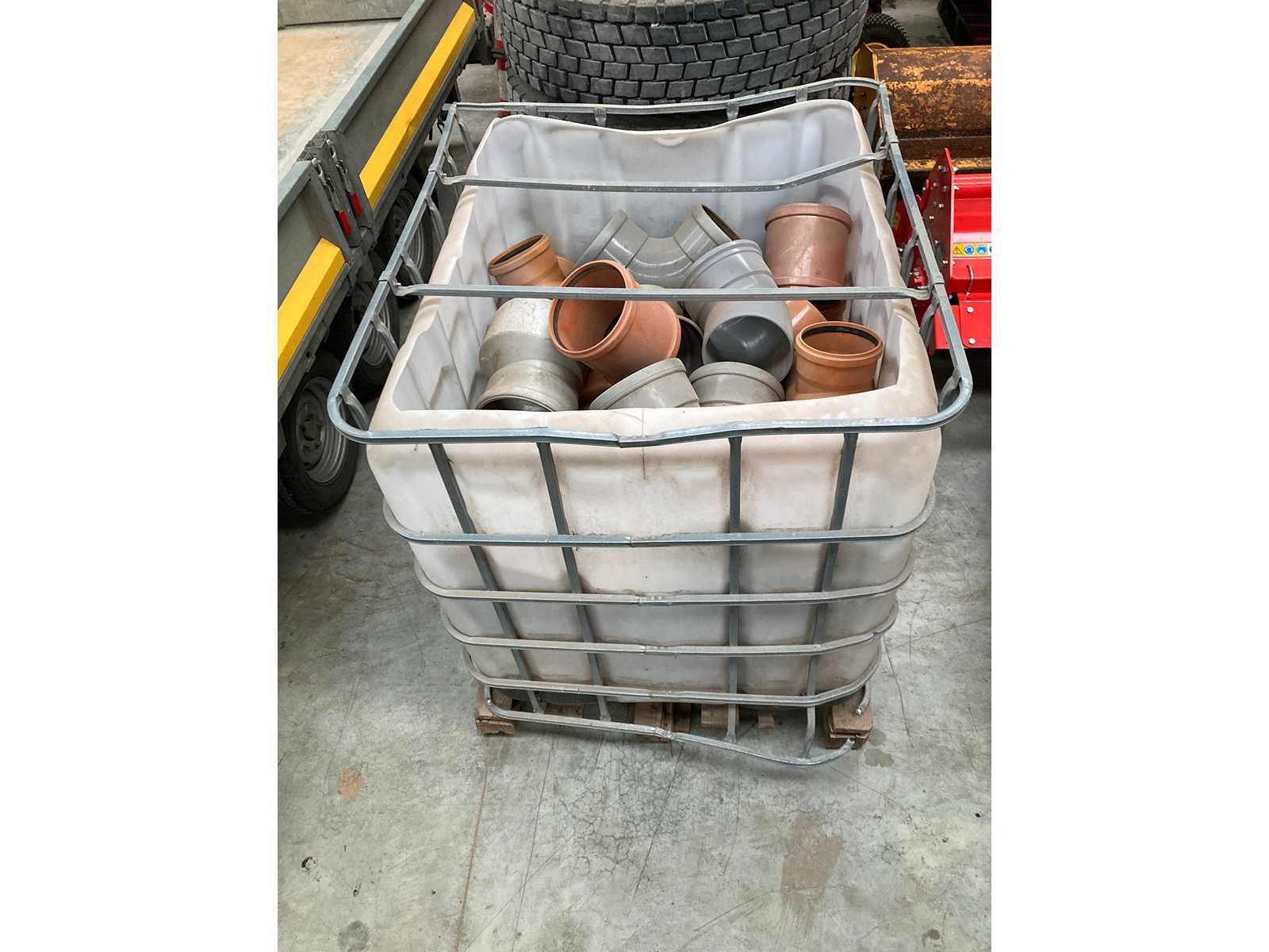 Diverse pvc koppelingen Diameter 160mm / 200mm / 250mm Enkele kleinere maten onderin In plastiek ibc container Nee Lengte: 110cm Breedte: 110cm Hoogte: 130cm