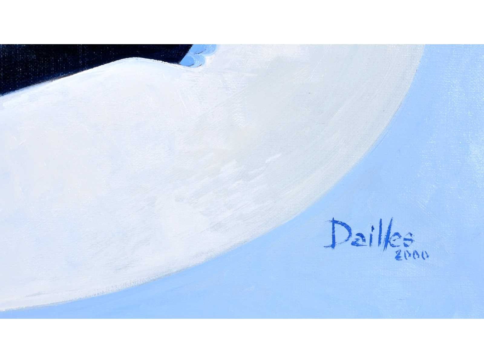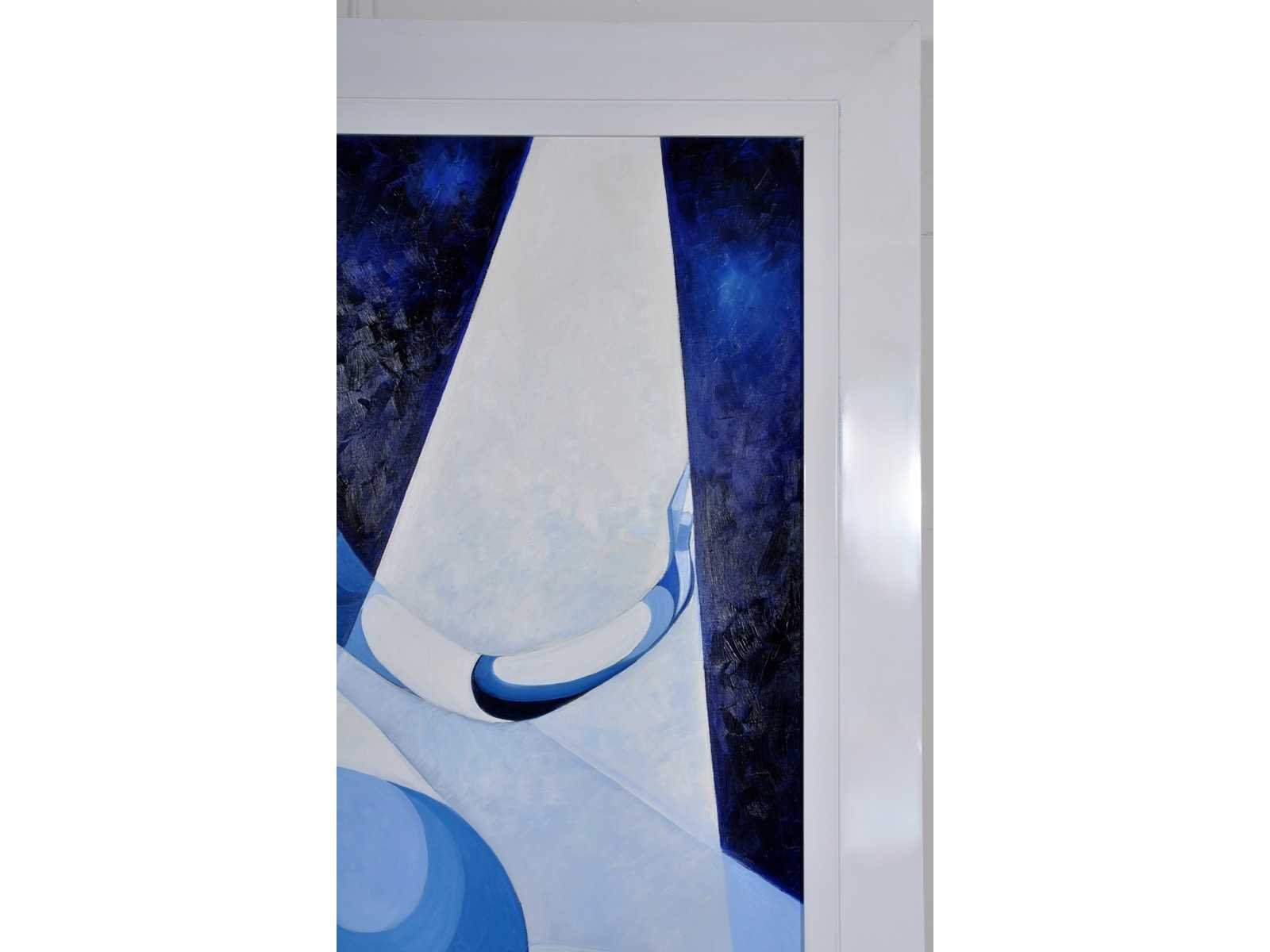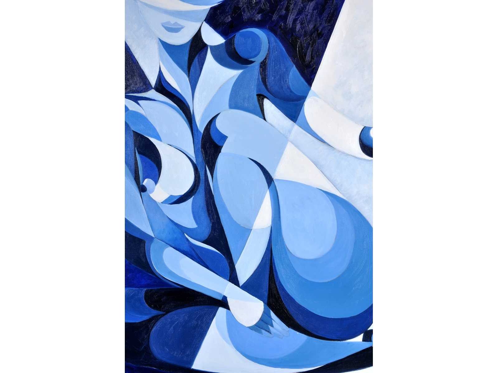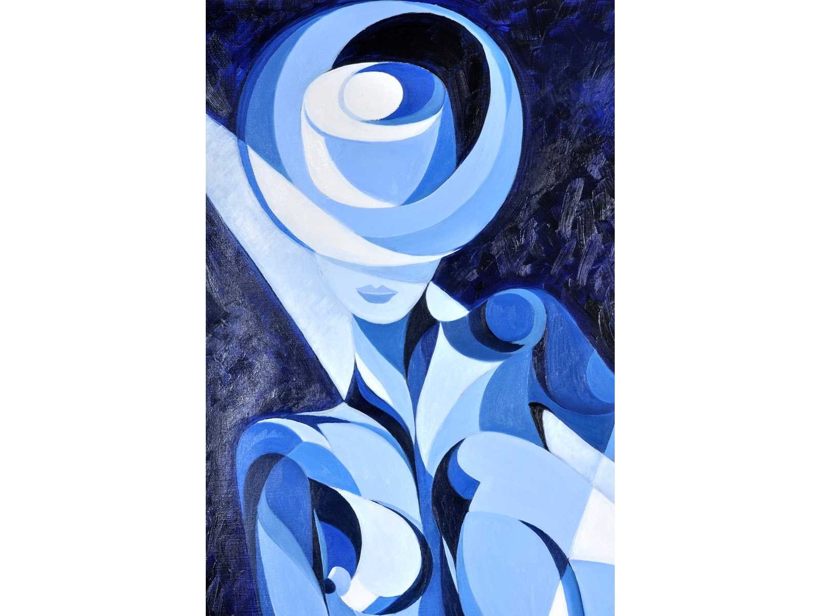 Gestileerde compositie in kubistische stijl, met een zittende figuur opgebouwd uit geometrische vormen in blauw, wit en zwart. De figuur wordt dramatisch belicht door twee lichtbundels en is uitgevoerd met sterke contrasten en vloeiende lijnen - Professioneel ingelijst - Galerieprijs: 2.500 € Nee Kunstenaar: Pierre Dailles Titel van werk: Kubistisch Portret in Blauw Techniek: Gemengde techniek op doek Handtekening/oplage: true Gesigneerd: Gesigneerd Hoogte: 100cm Breedte: 80cm Hoogte incl. lijst: 119,5cm Breedte incl. lijst: 99,5cm Frame: true