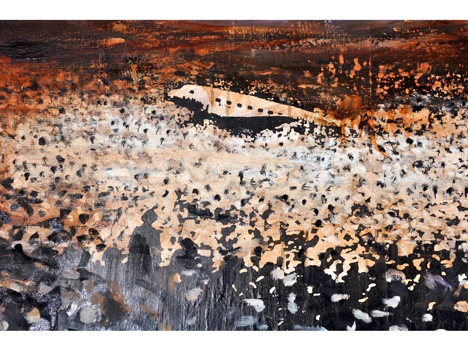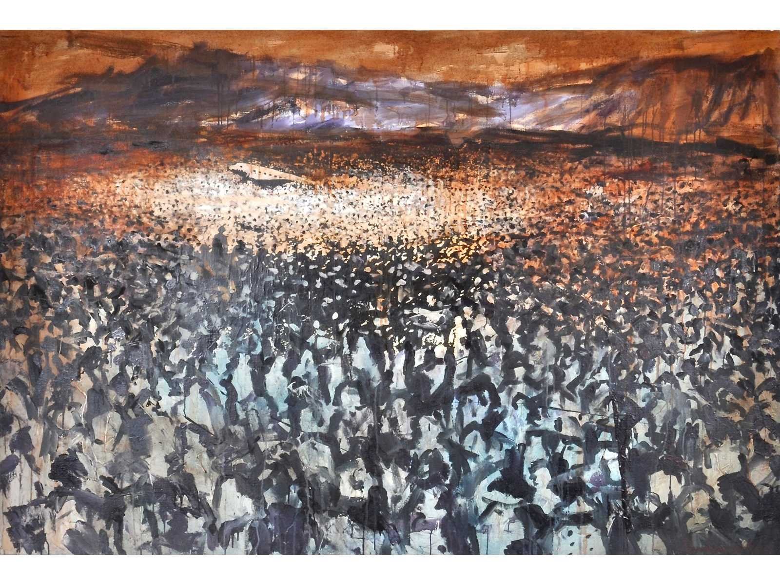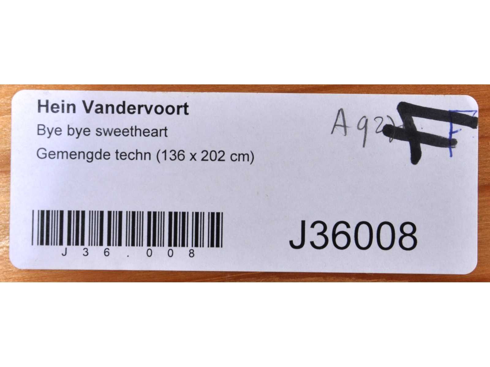 Expressieve voorstelling van een samendrommende menigte in bergachtig decor, met dramatische lichtwerking en collectieve spanning. Hein Vandervoort is een Nederlandse schilder die werkt met fotografische uitgangspunten en monochrome uitsneden, en exposeerde o.a. in het Stedelijk Museum Amsterdam, Museum De Lakenhal (Leiden) en het Koninklijk Paleis. Nee Kunstenaar: Hein Vandervoort (Leiden, 1962) Titel van werk: Bye bye sweetheart Datering: 1987 Techniek: olie op doek Handtekening/oplage: true Gesigneerd: Gesigneerd Hoogte: 136cm Breedte: 202cm