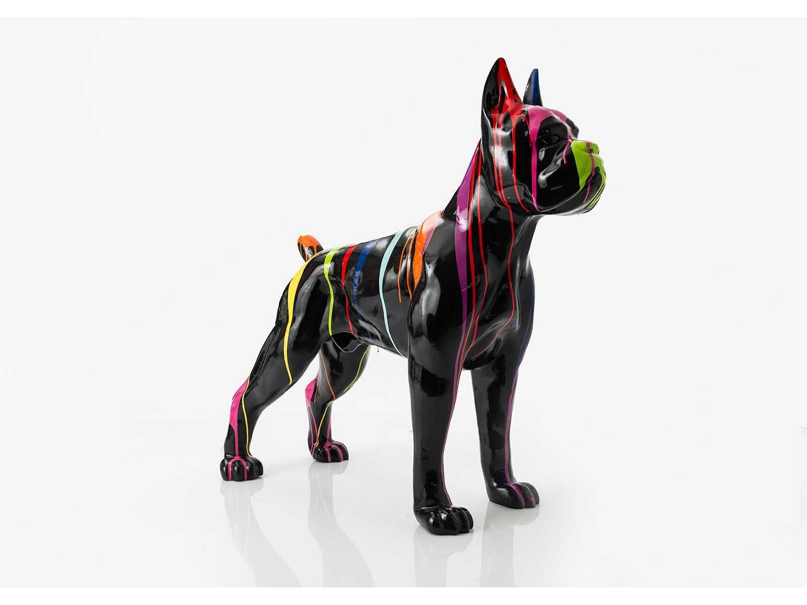 Nee Model: Hond Boxer Kleur: Zwart met verfstrepen Lengte: 110cm Breedte: 35cm Hoogte: 90cm Materiaal: Polyresine
