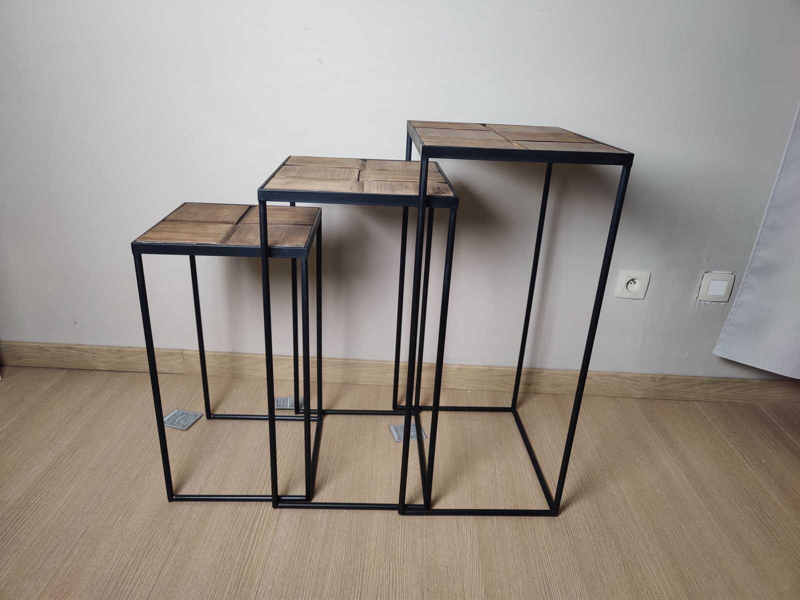 3 in elkaar passende bijzettafeltjes Nee Merk: Amadeus Model: Plantenstand Kleur: hout Lengte: 41cm Breedte: 35cm Hoogte: 78cm Materiaal: Metaal en hout