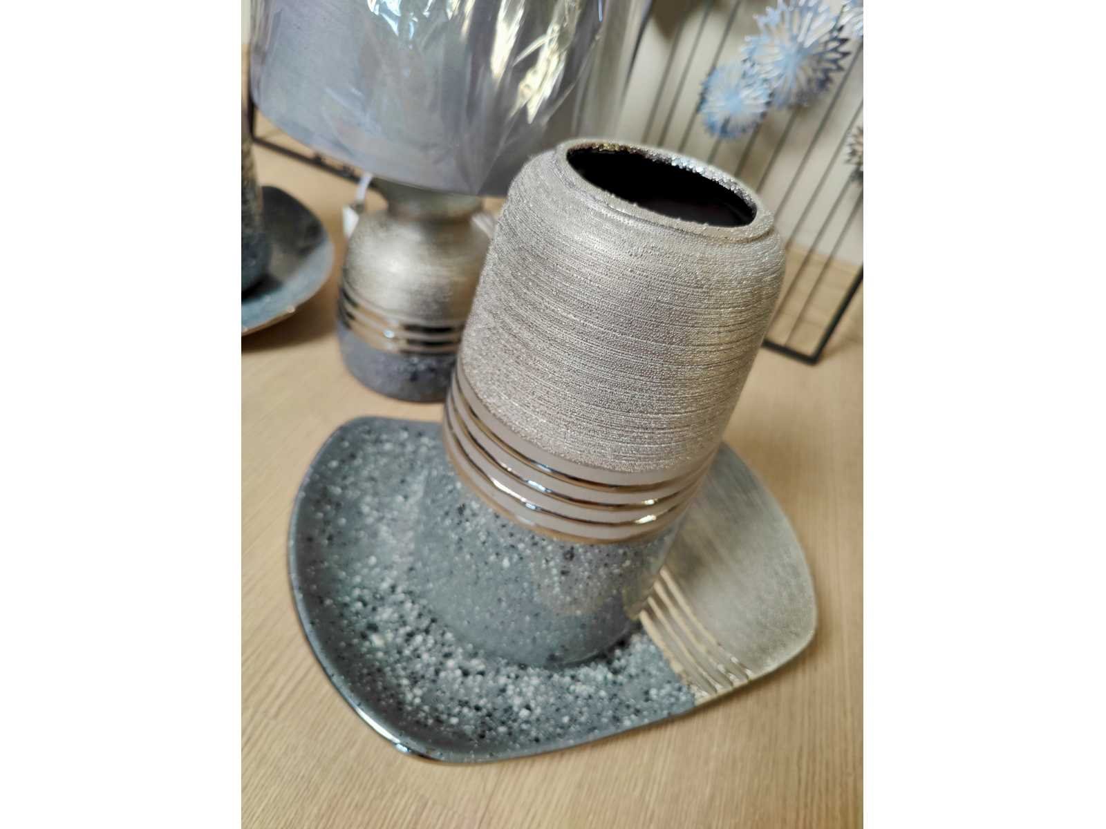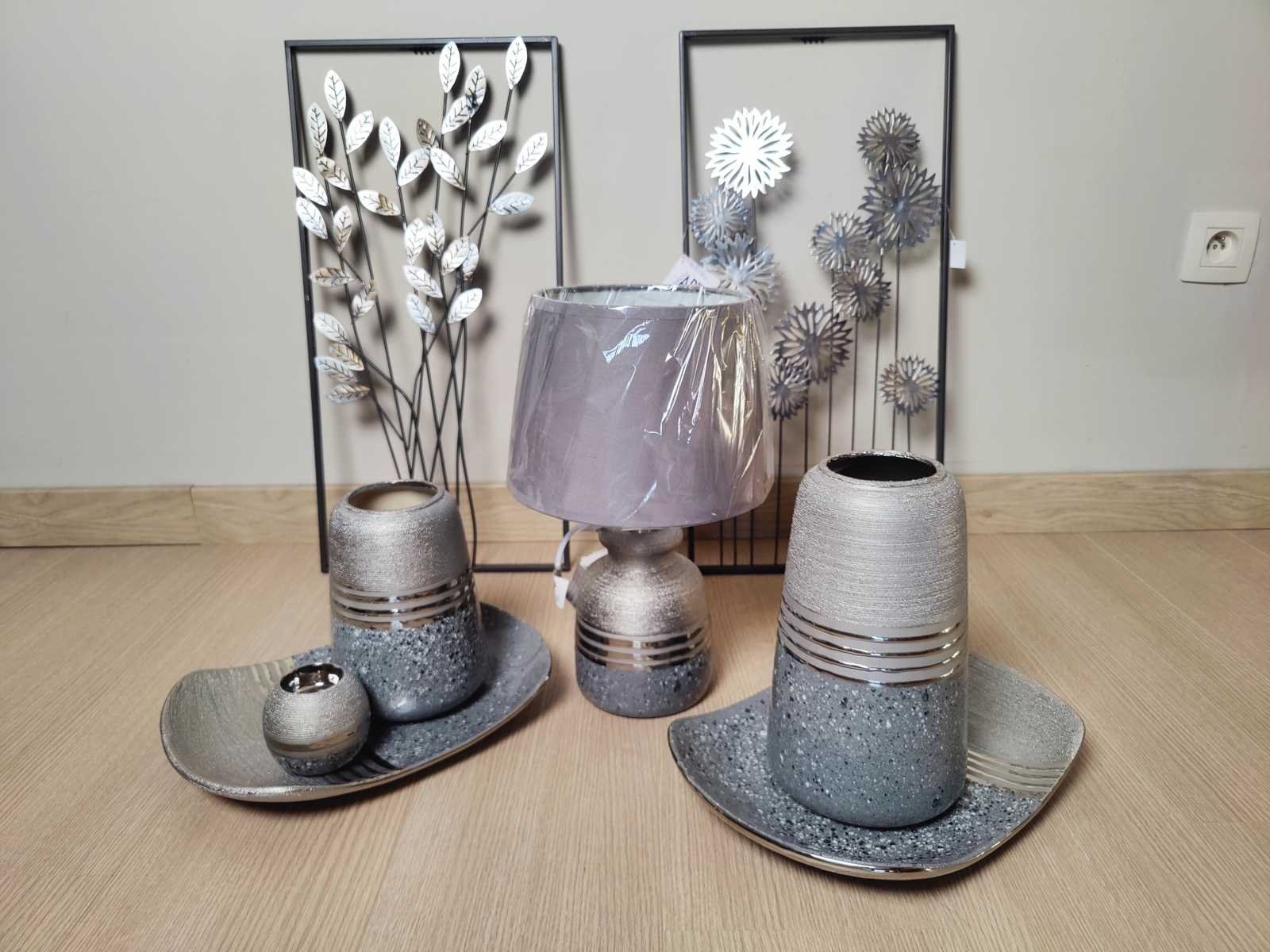 Decoratieve set van: - 2 schalen - 2 vazen - 1 theelichthouder - 2 wanddecoraties - 1 tafellamp Nee Kleur: Grijs Materiaal: Metaal