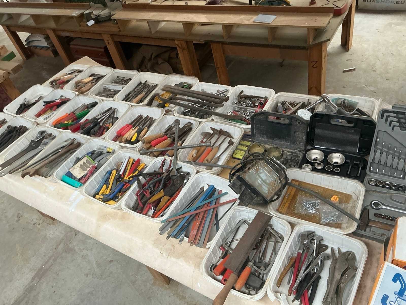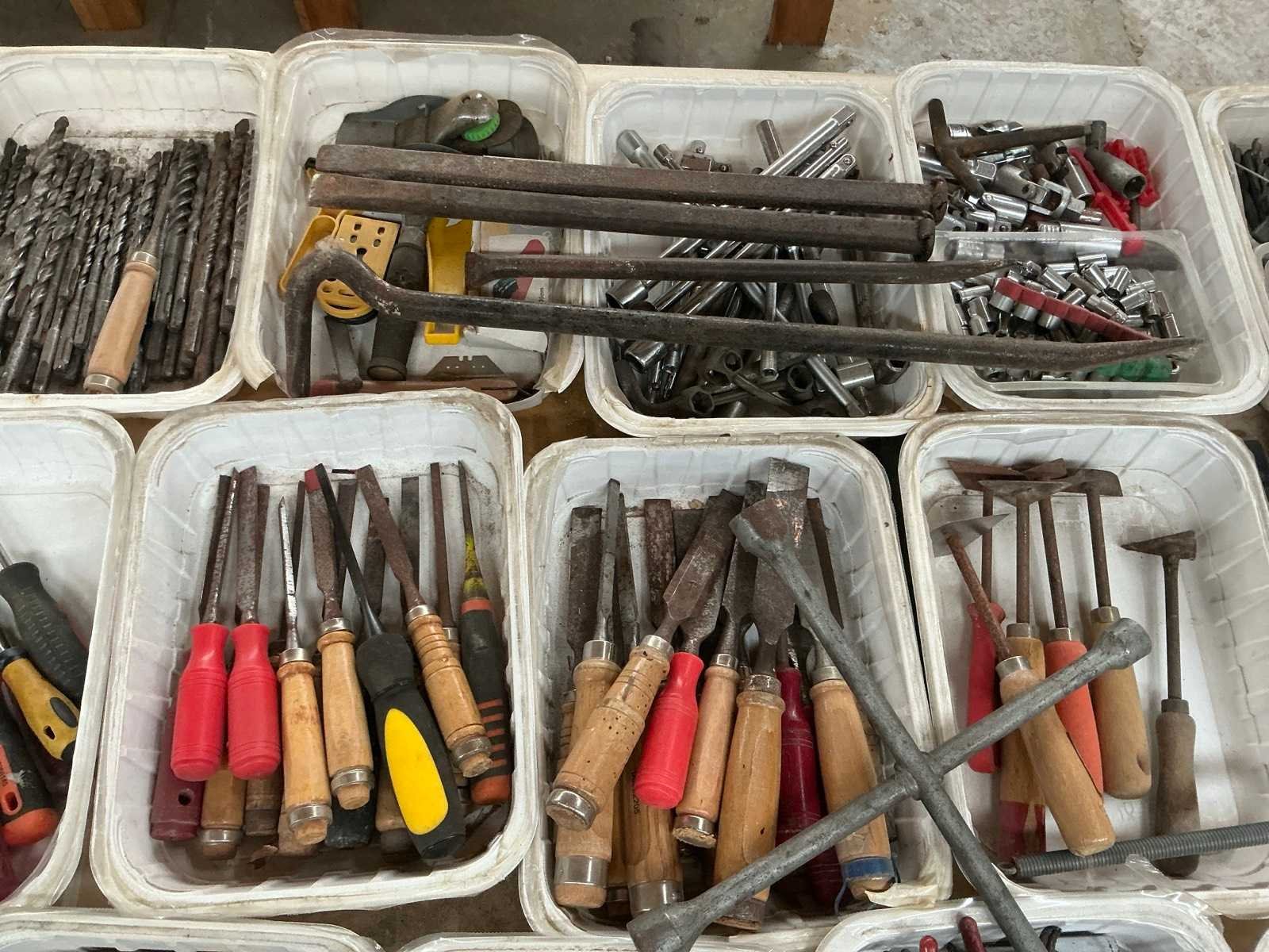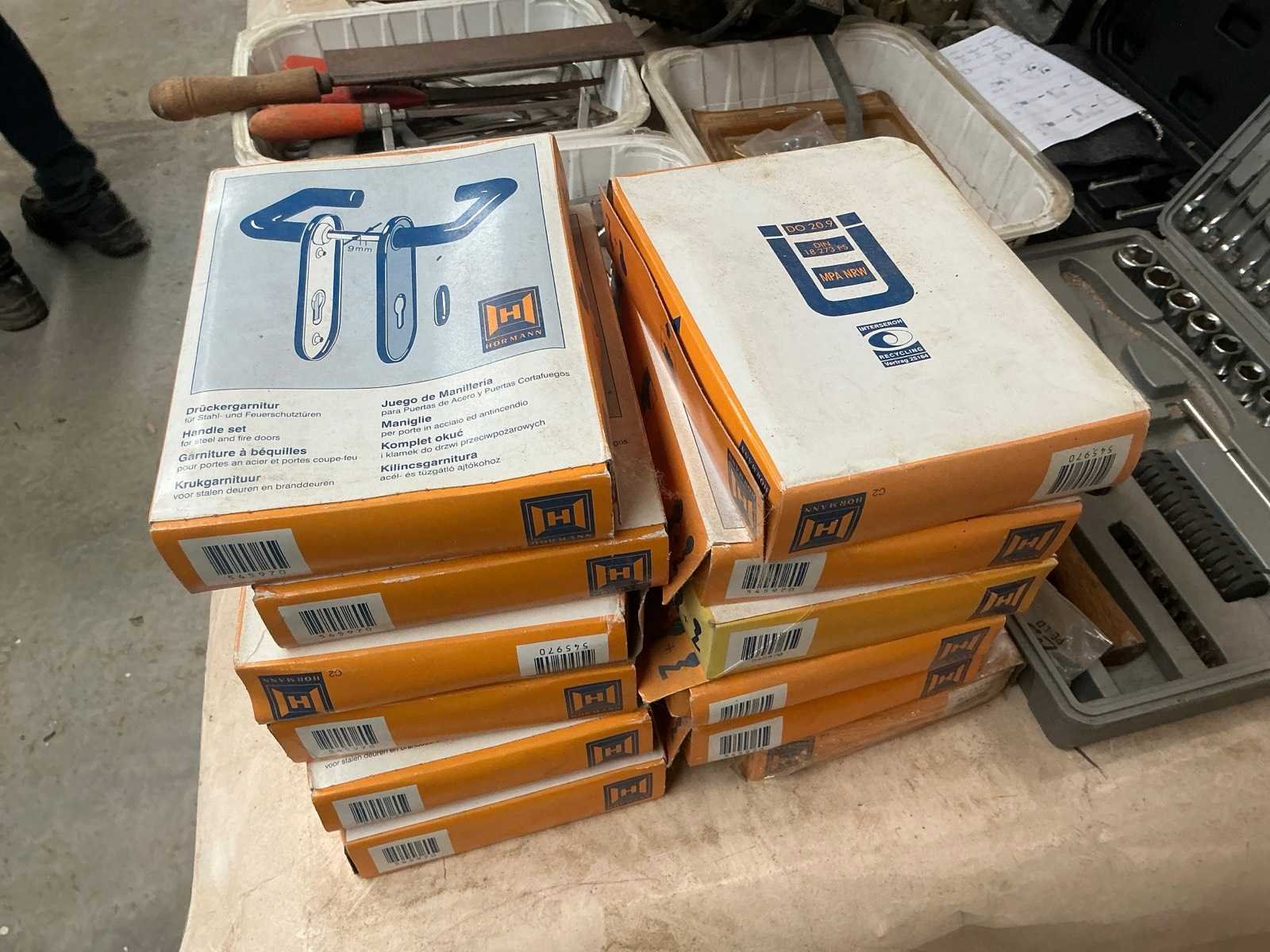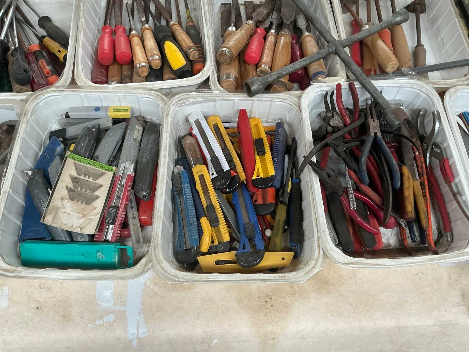 Waaronder tangen, steekmessen, betonboren, houtbeitels, metaalzaagbladen, 12x krukgarnituur Hormann, werkset in pvc koffer, diverse metaalboren, dopsleutels, krimptangen, diverse schroevendraaiers, breekmessen, gatenzaagset, diamantzaagset, hamers,… Nee