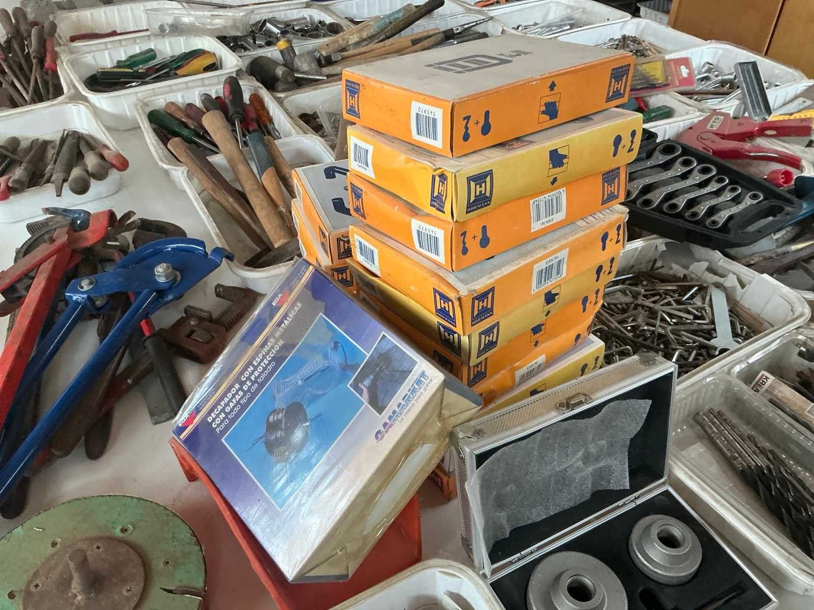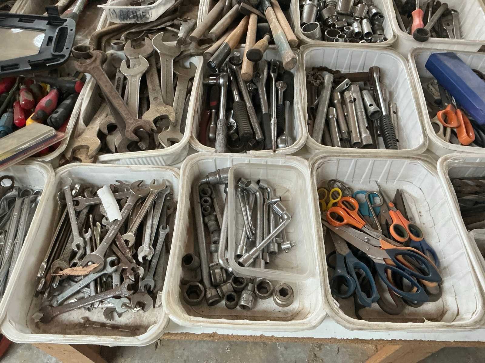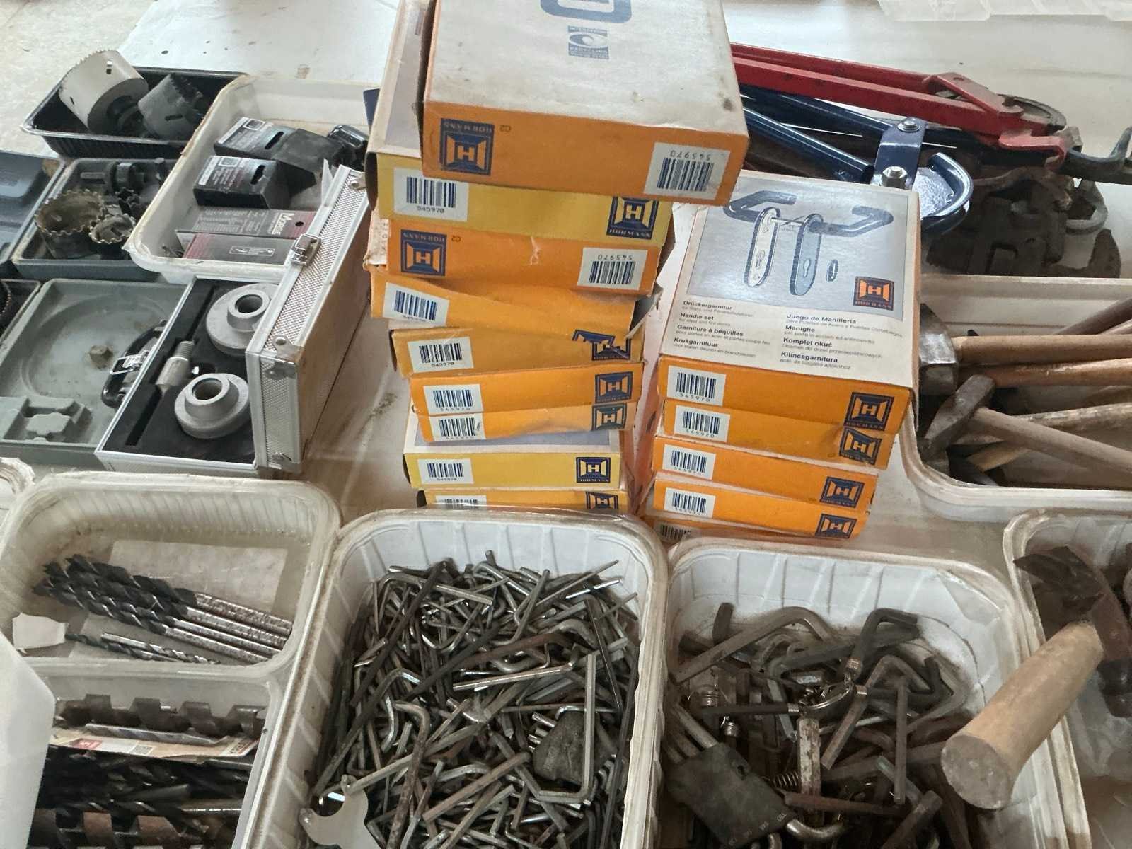 Waaronder tangen, steekmessen, betonboren, houtboren, vijlen, 15x krukgarnituur Hormann, werkset in pvc koffer, diverse metaalboren, dopsleutels, krimptangen, diverse schroevendraaiers, gatenzaagset, diamantzaagset, hamers,.., buizenplooiers,.., afgifte volgens aanwijzing Nee