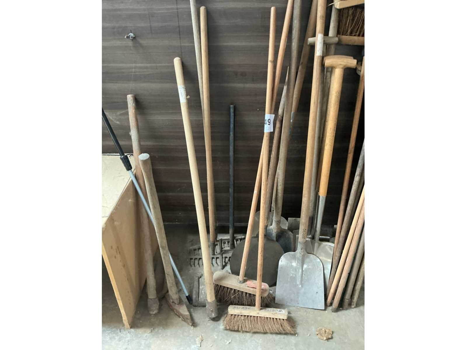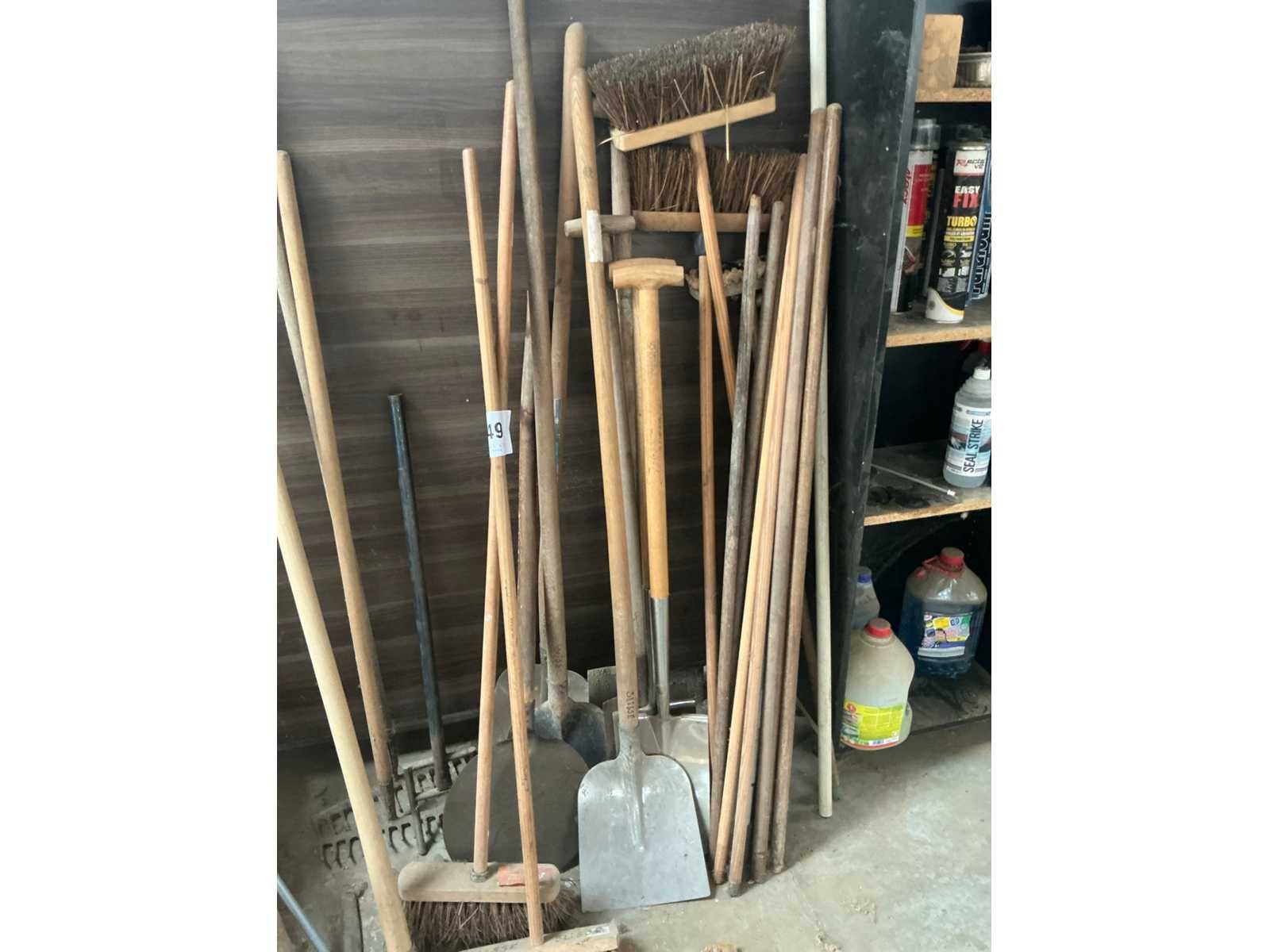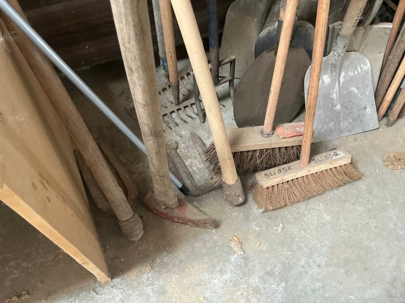 Waaronder 7 schoppen, 2 harken, 1 bijl, 5x borstel, diverse houten stelen,… Nee