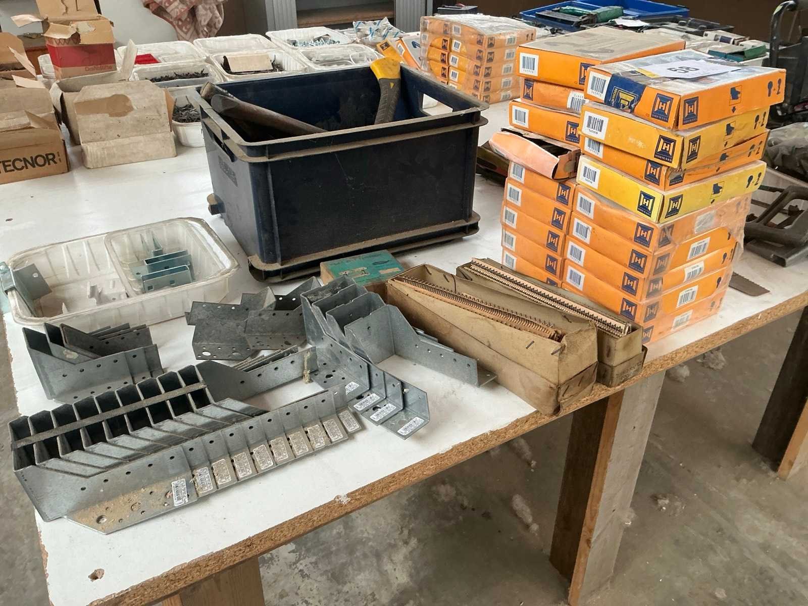 Waaronder diverse metalen balkenhouders, diverse bijlen, hamers, diverse riemhaken, handzagen, 9x plaatspanner, diverse spanvijzen, werklampen, gatenzaagset, divers schuurtoebehoren, enig deurbeslag, afgifte volgens aanwijzing Nee
