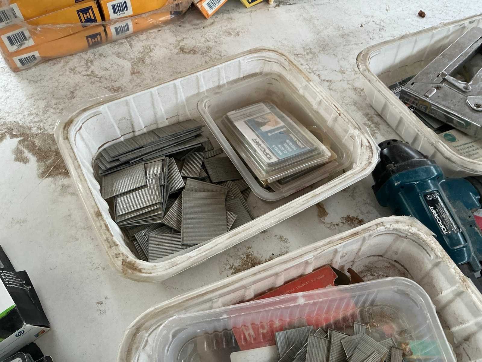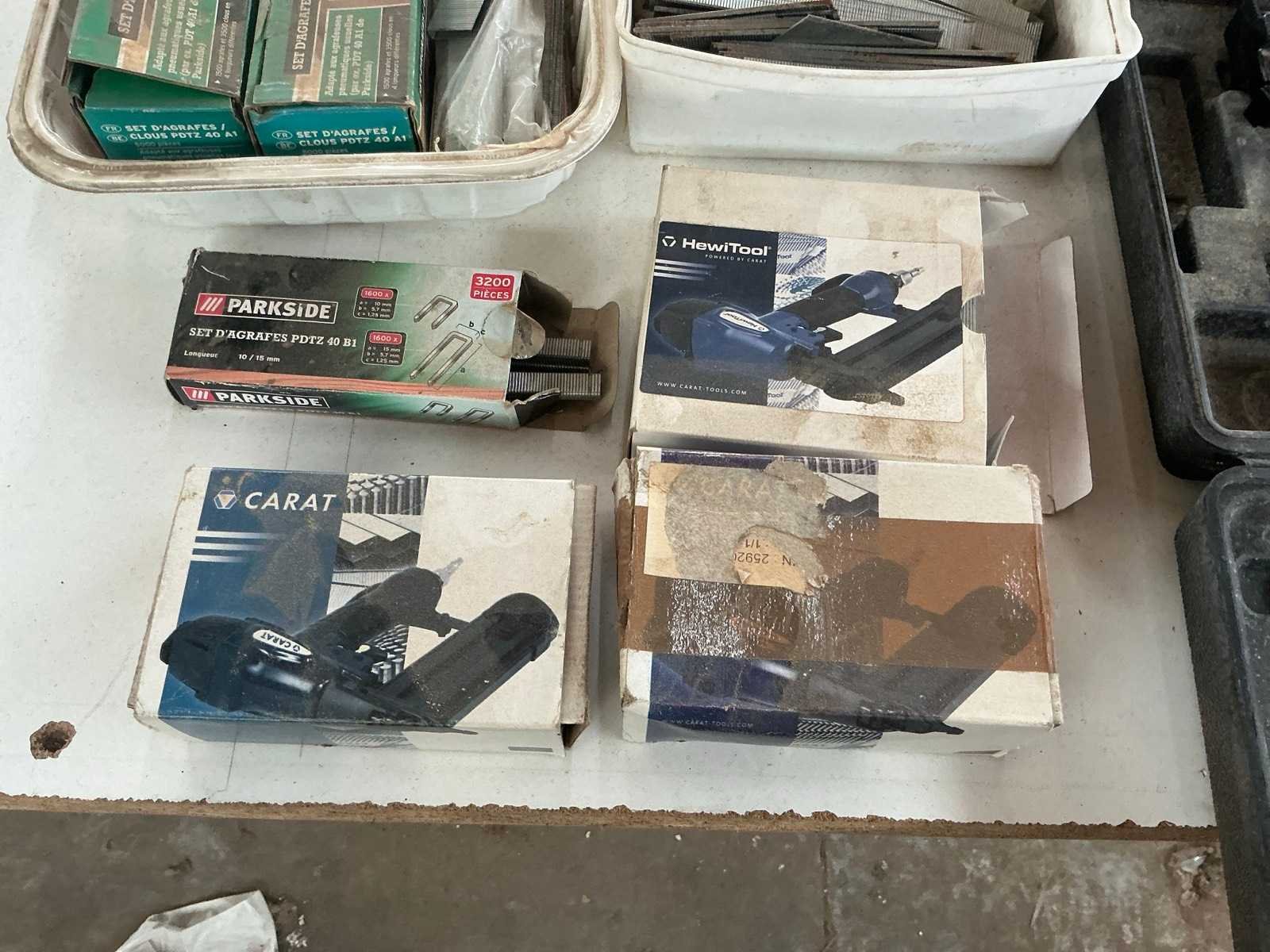 Compleet met diverse nietjes, nagels Hewitool, Carat, Bostitch,… en 3 manuele nietjesmachines Nee Merk: Prebena/ Parkside/…