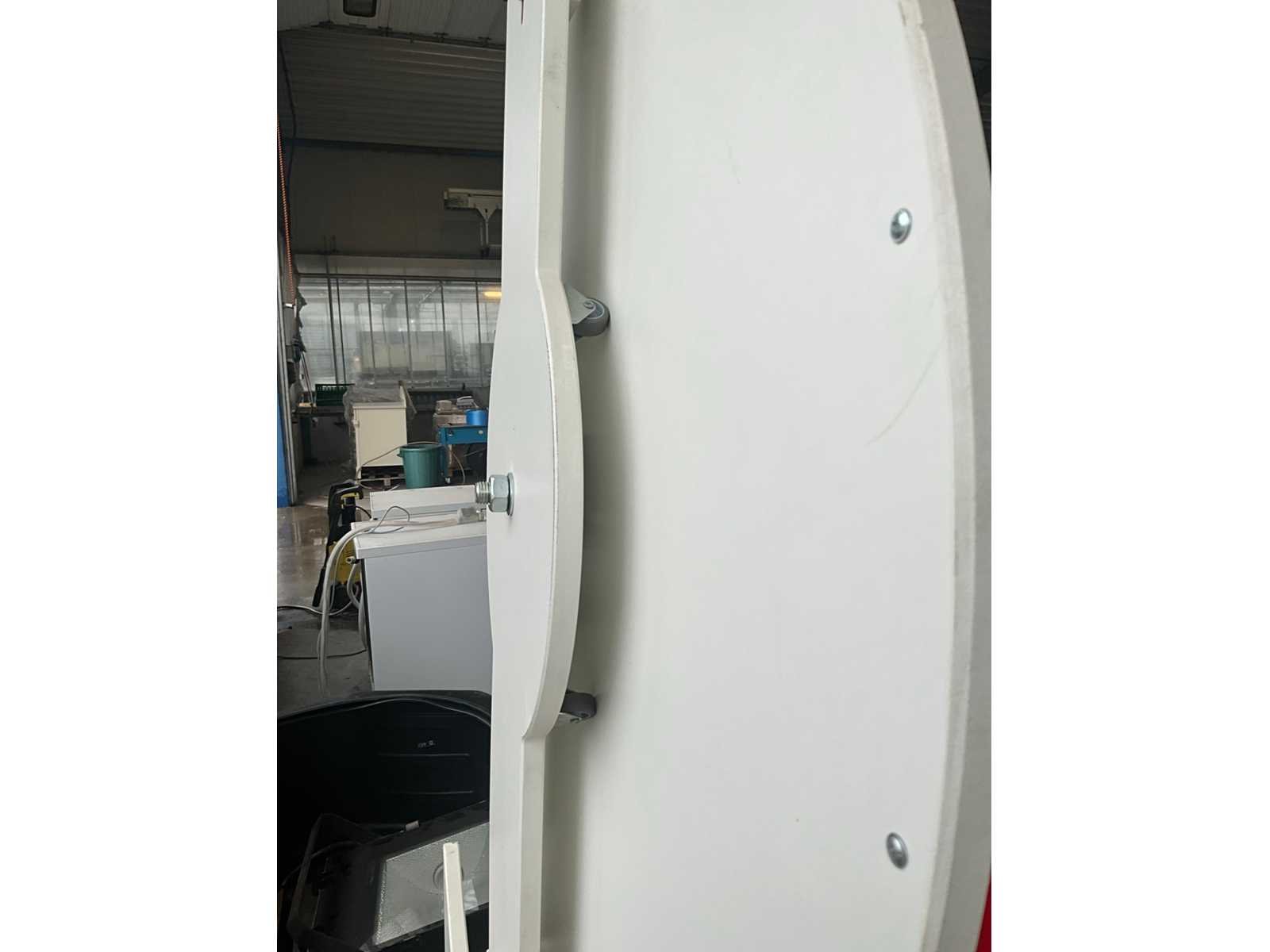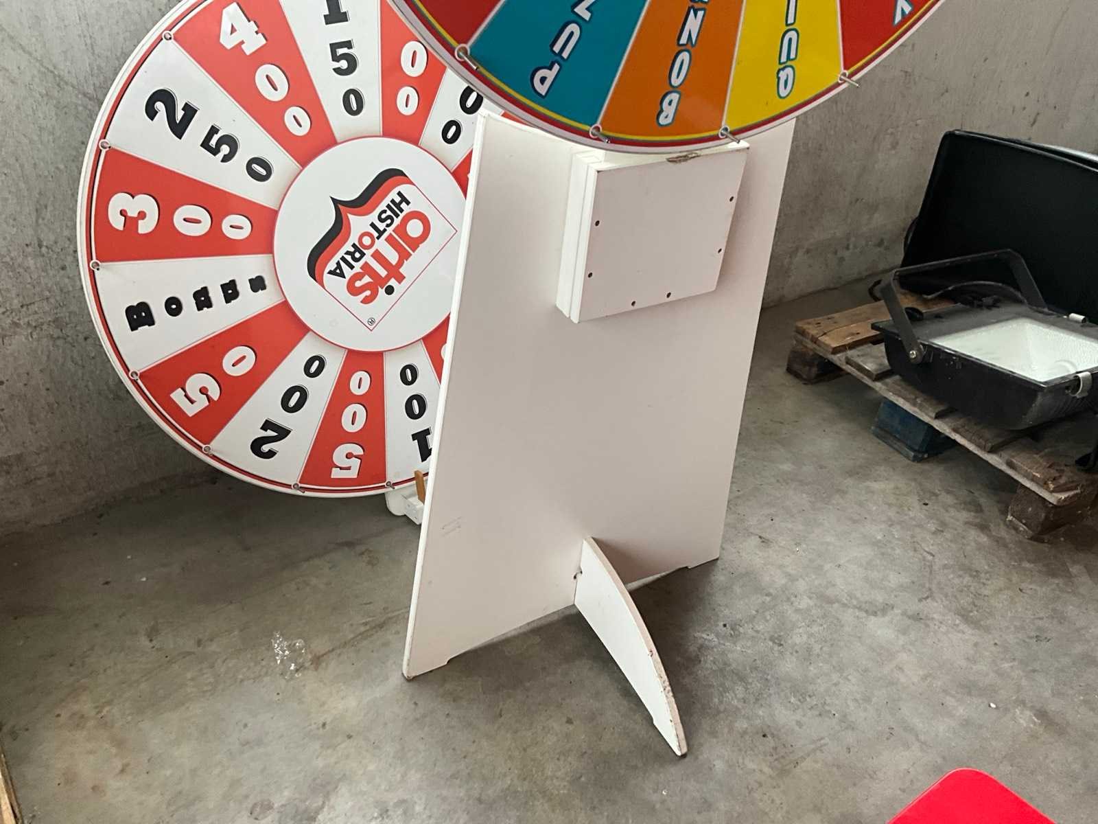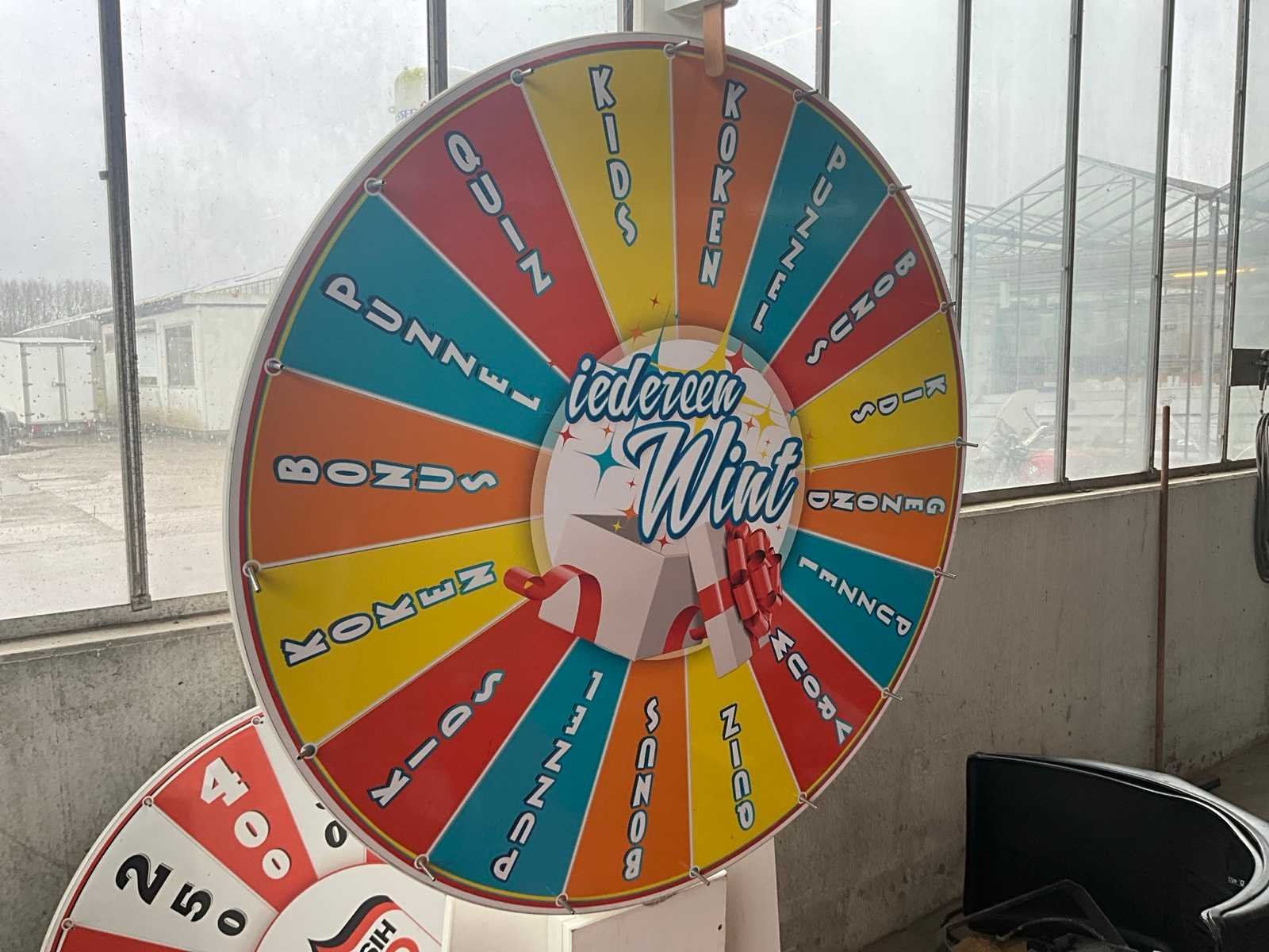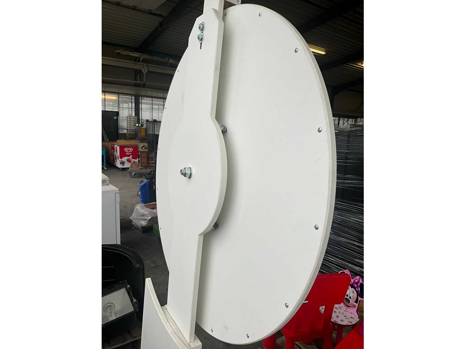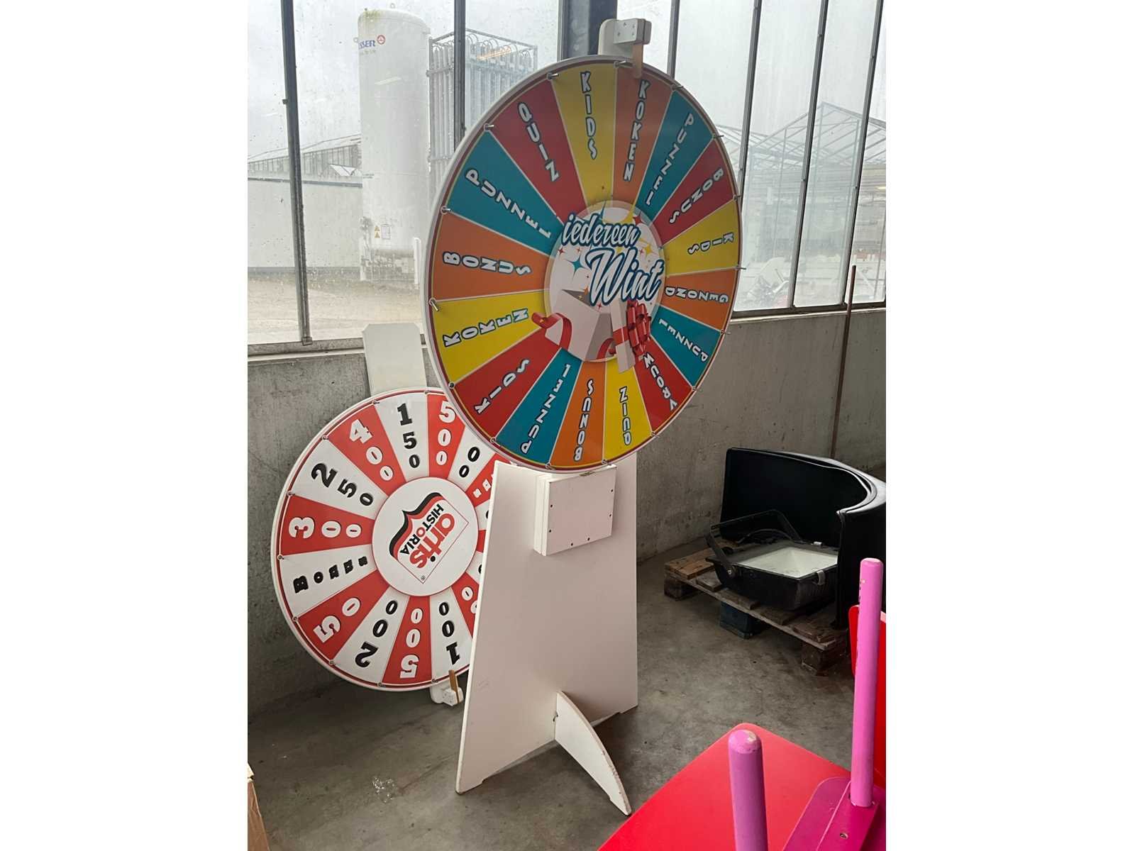 2x divers rad waaronder met namen en met getallen/cijfers, voorzien van 1 formica houten stand/onderstel, dienend voor beiden. Elk rad met diameter 100 cm. Nee Breedte: 100 Hoogte: 200
