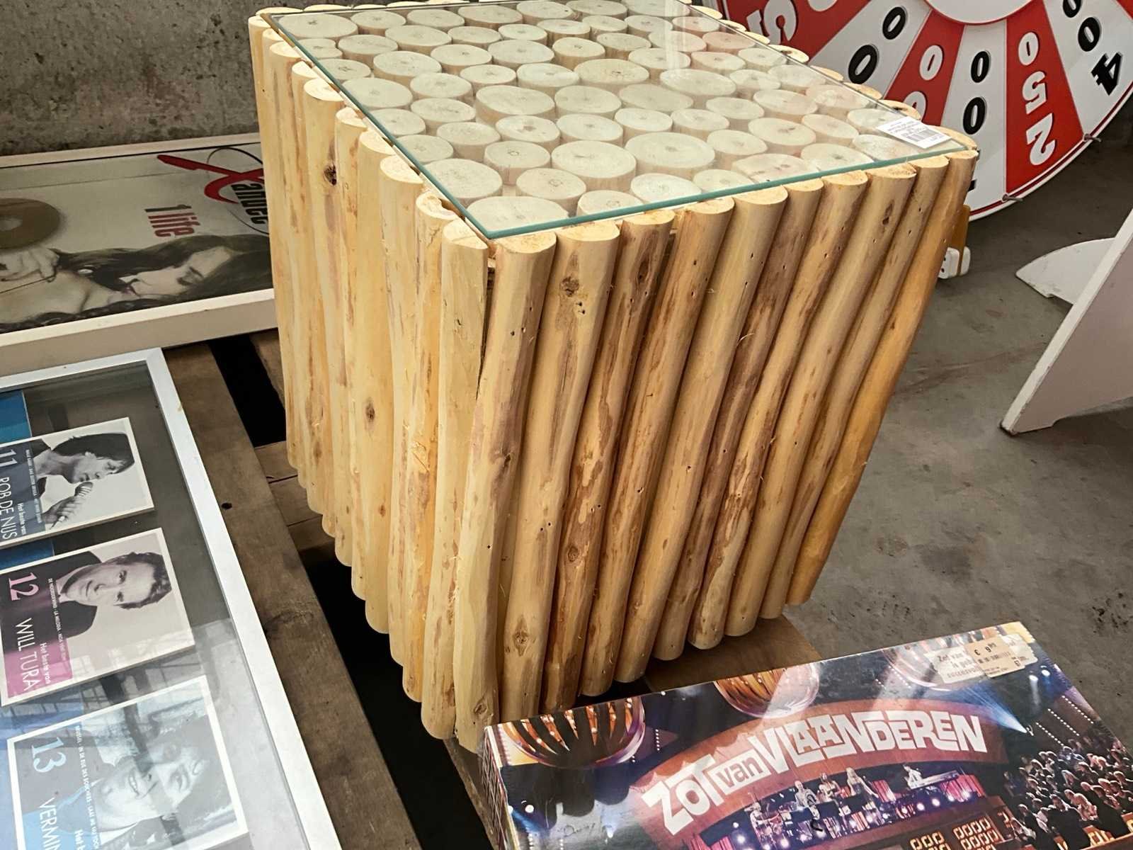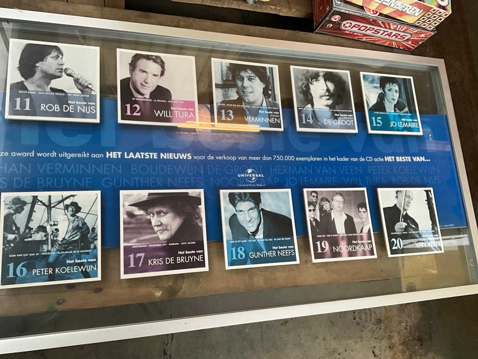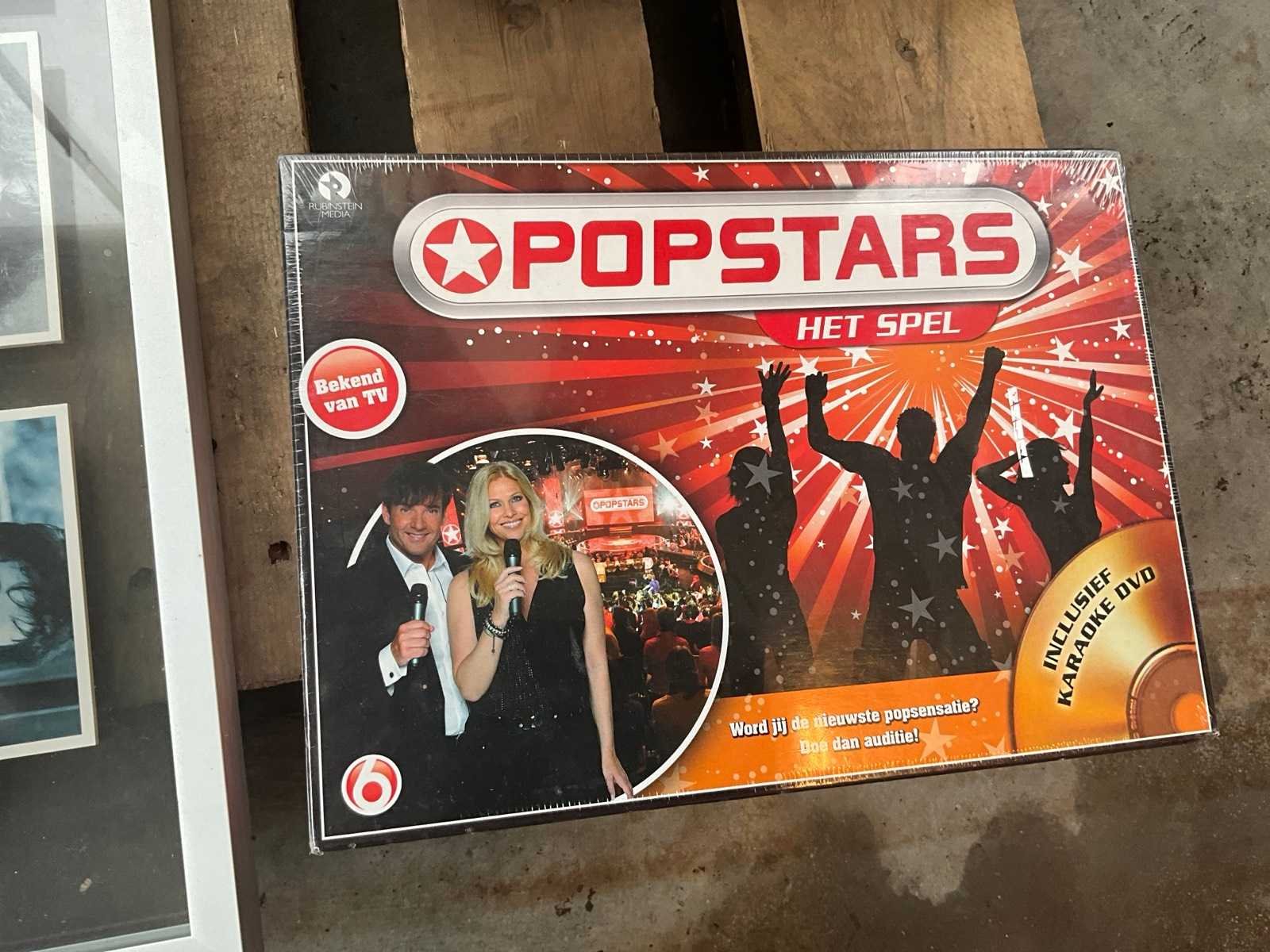 Waaronder verrijdbaar bijzettafeltje in houten uitvoering voorzien van glazen bovenblad, 2 decoratieve kaders met zangers en 2 gezelschapsspelen. Nee