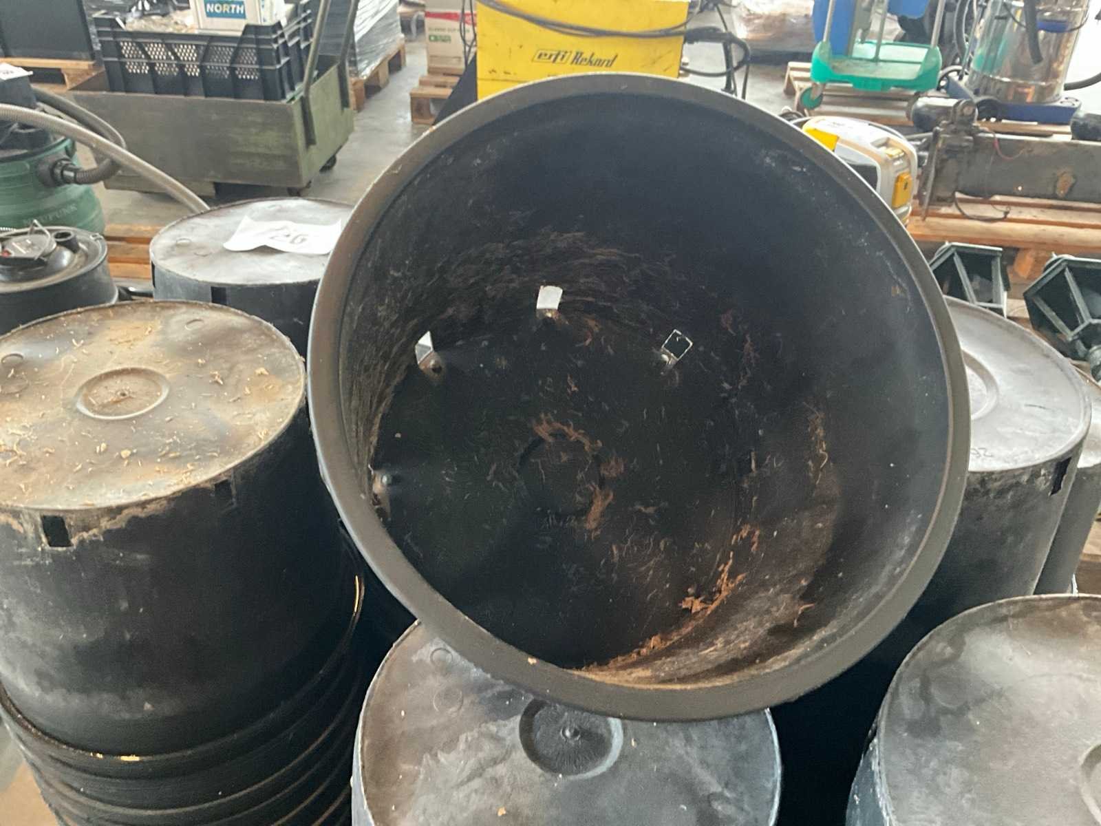 Ongeveer 175 ronde kunststoffen potten in diverse uitvoeringen waaronder afmetingen voornamelijk 26x22 en ook 26x26 cm, voorzien van openingen onderaan. Nee