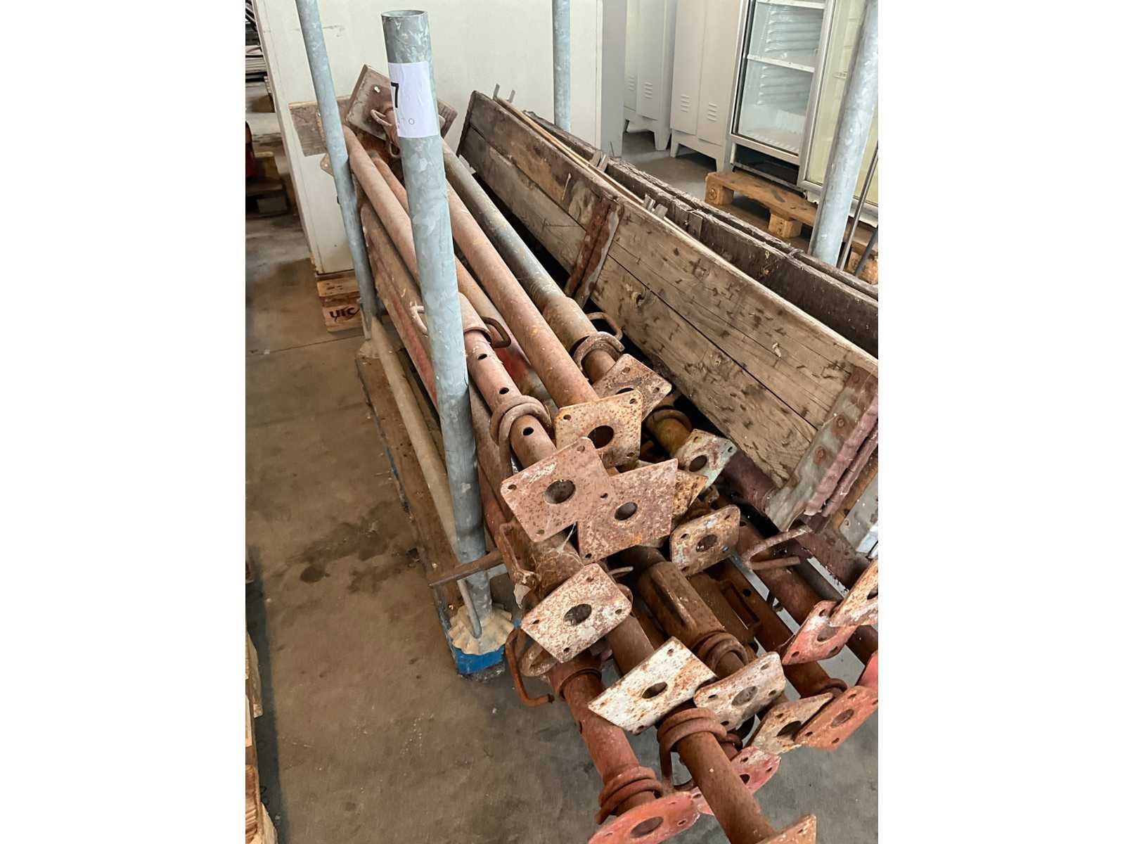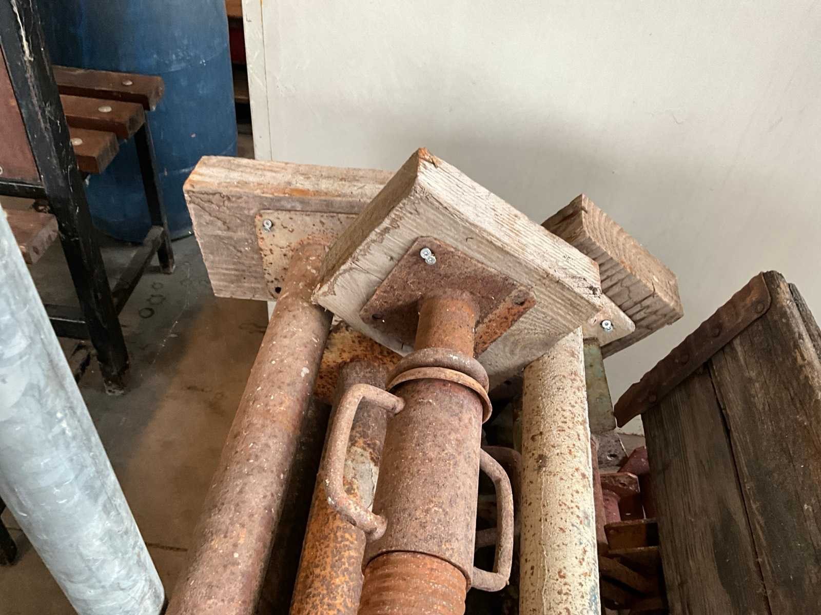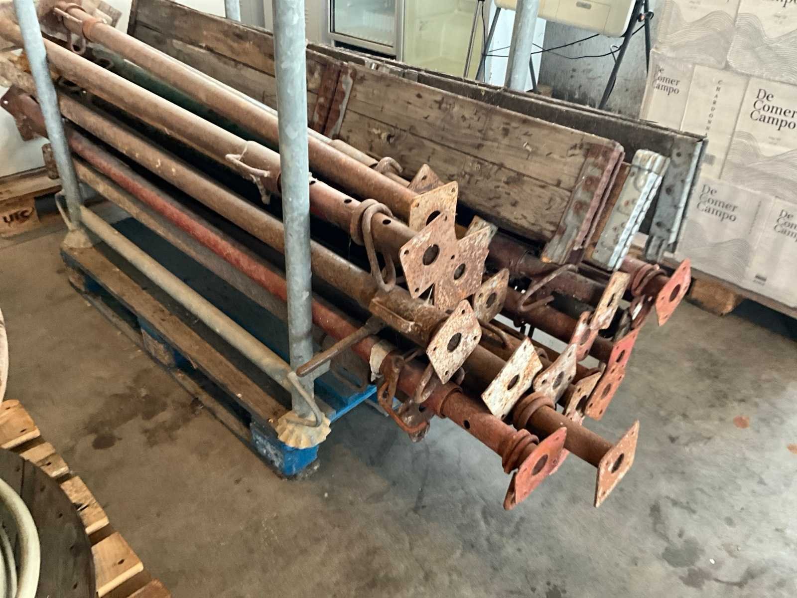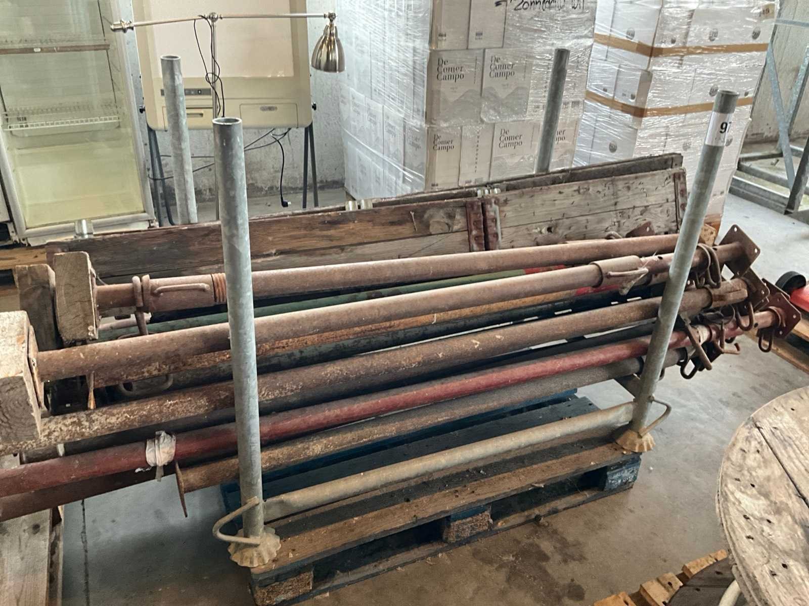 Elk van minimaal 150 cm hoog en verstelbaar in de hoogte, waaronder enige voorzien van houten voet en compleet met enkele houten palletringen in metalen stapelbok. Nee
