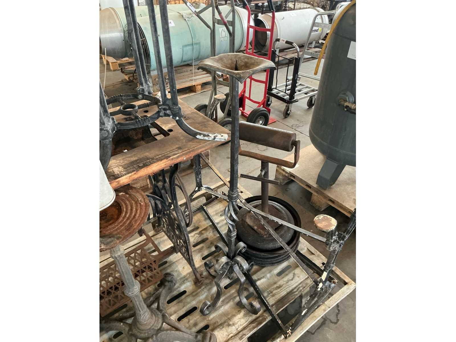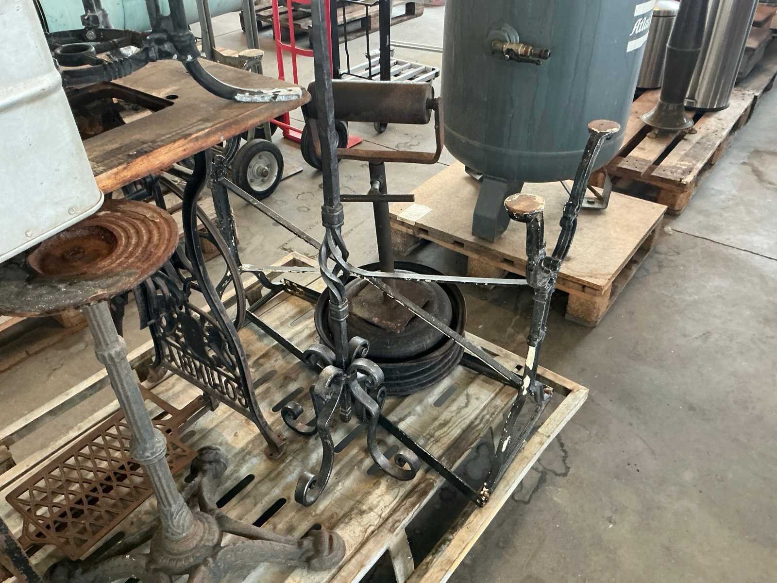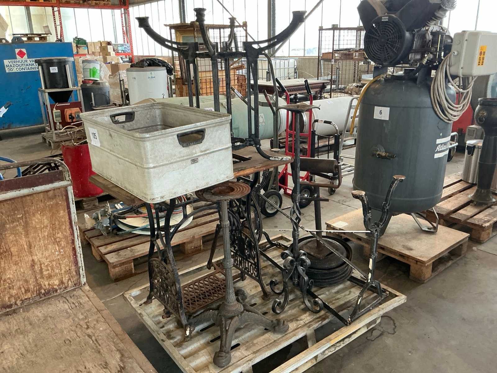 Waaronder 1x naaitafel voorzien van voetbediening, afmeting: 90x40x70cm, gietijzeren kaarshouder 105cm, 2 diverse onderstellen en afrolelement op voet, compleet met metalen bak Gmöhlin 65x40x25cm Nee