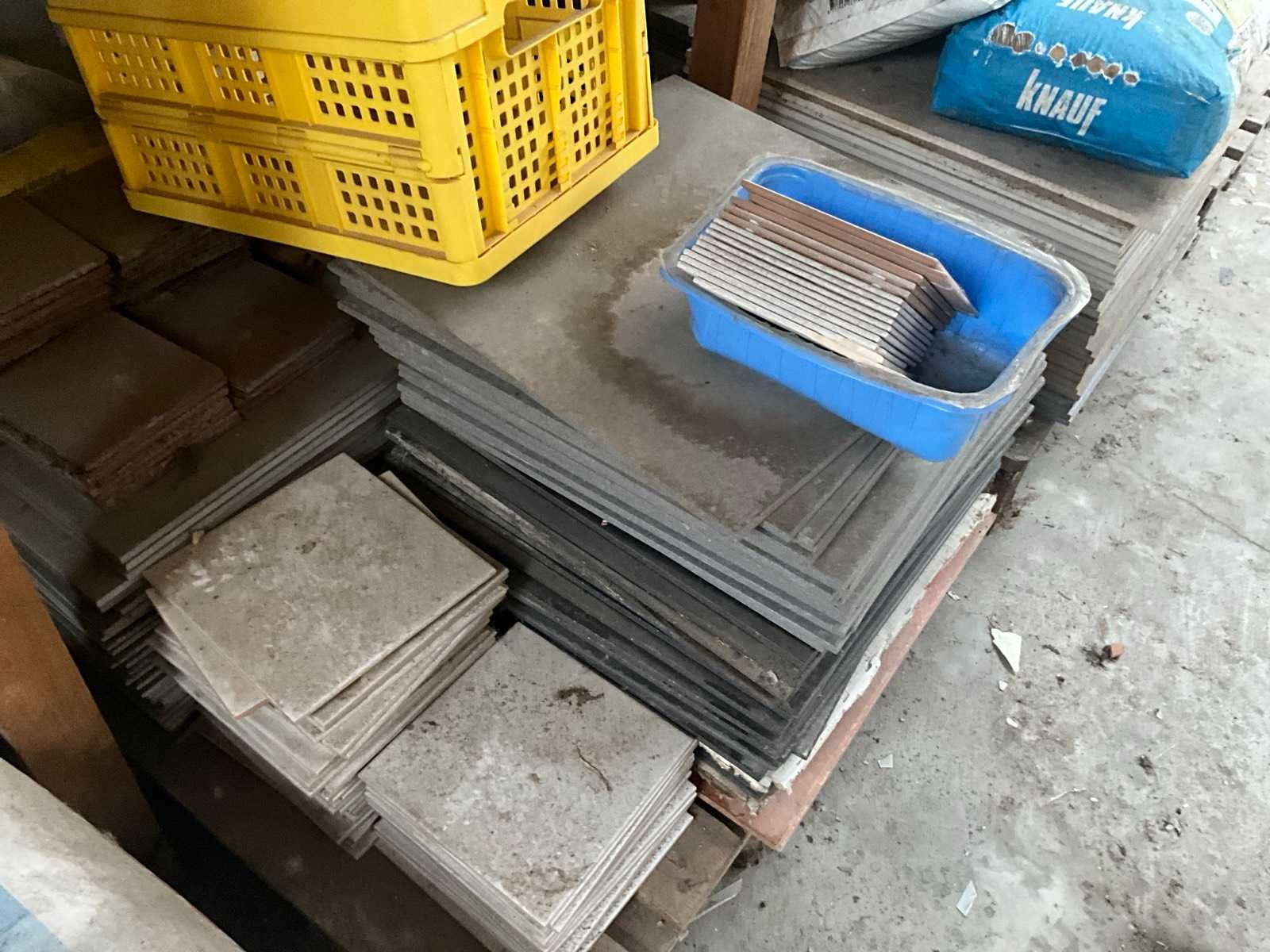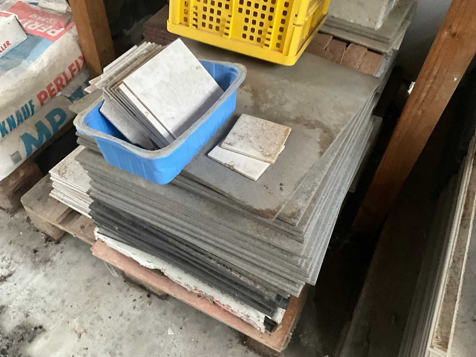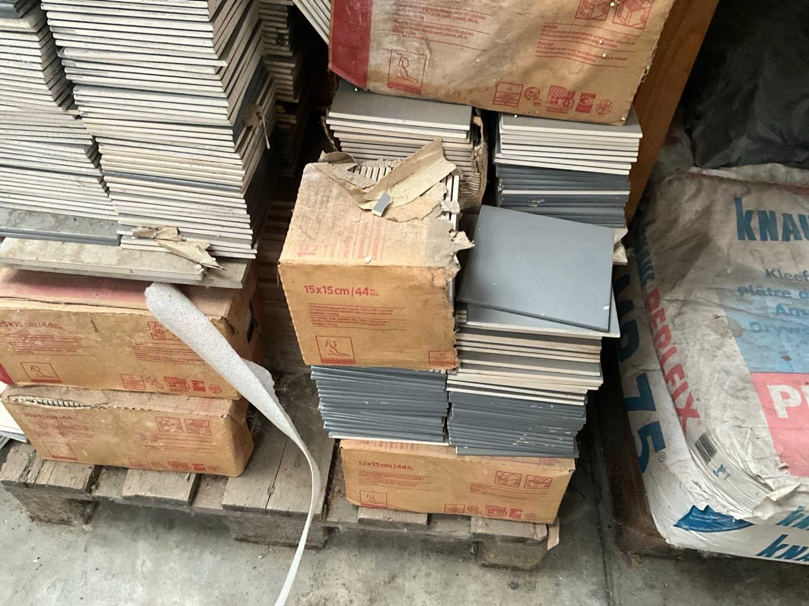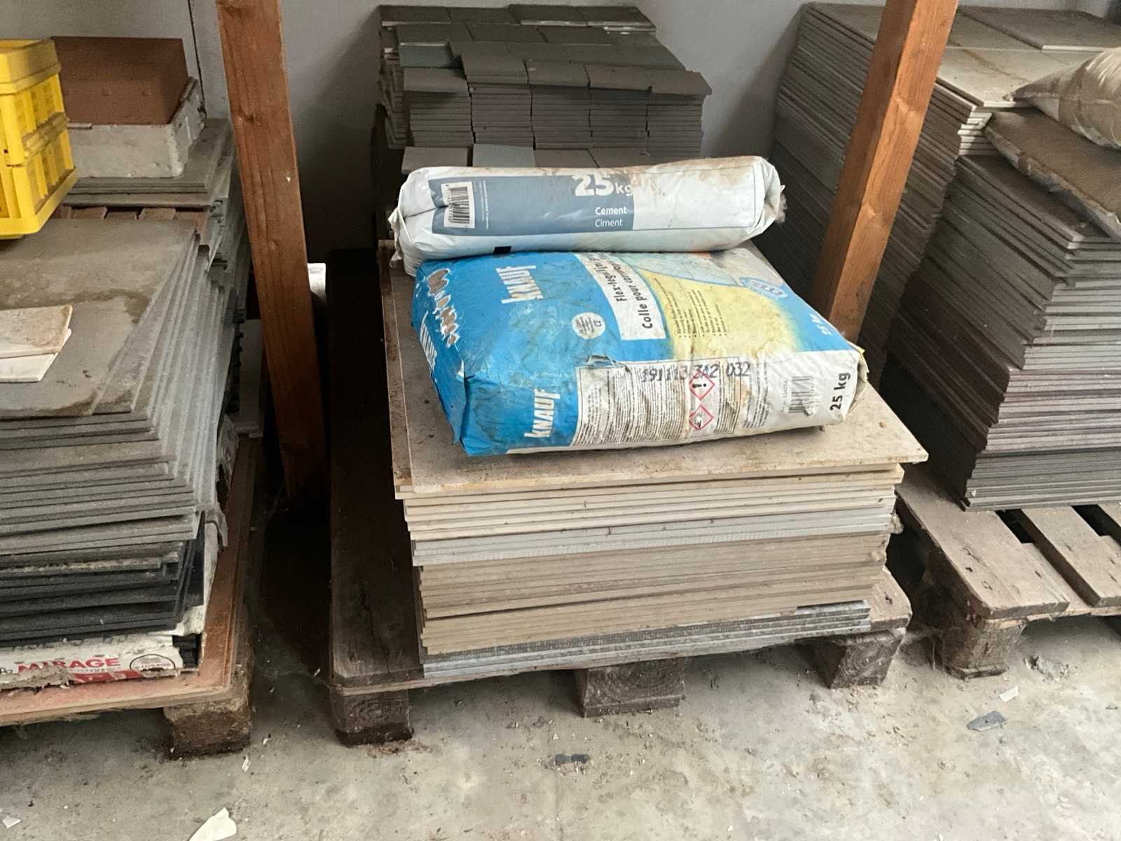 Grote partij diverse tegels in diverse formaten en uitvoeringen, alsook enig toebehoren. Zich bevindend op 10 diverse pall. Nee