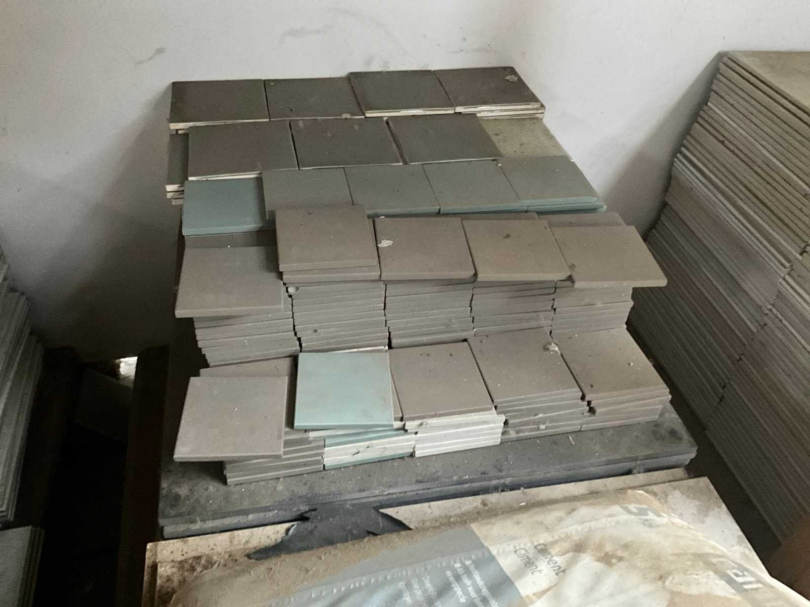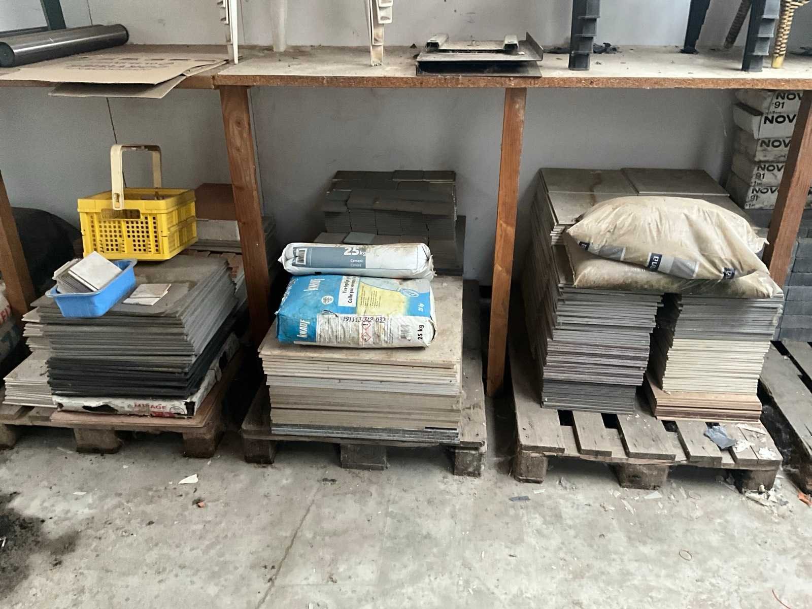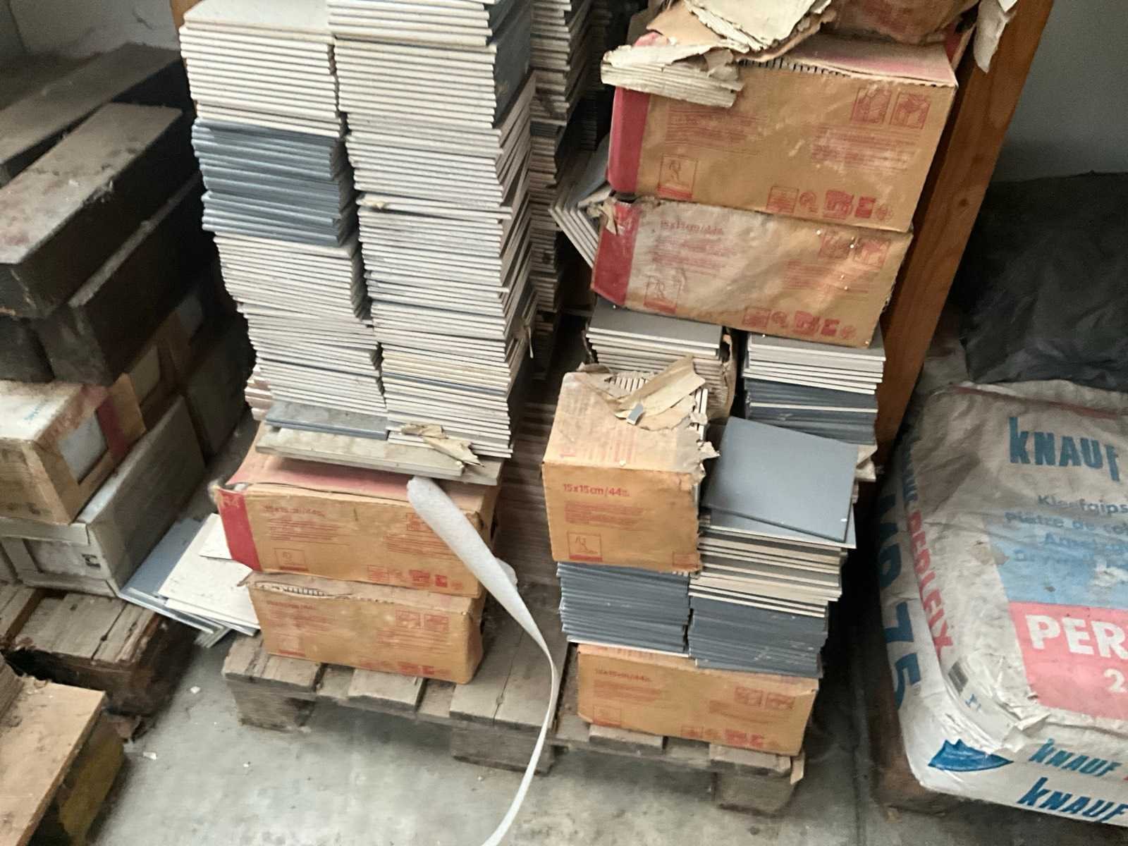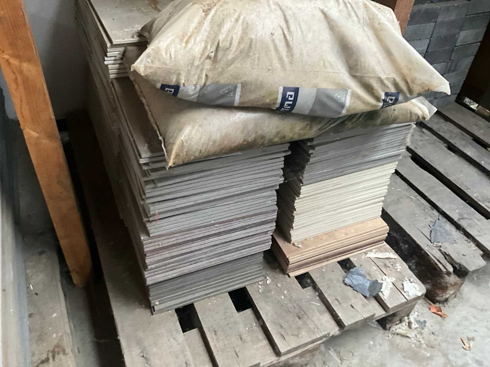 Grote partij diverse tegels in diverse formaten en uitvoeringen, alsook enig toebehoren. Zich bevindend op 10 diverse pall. Nee
