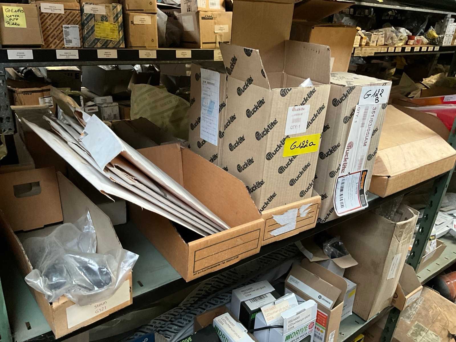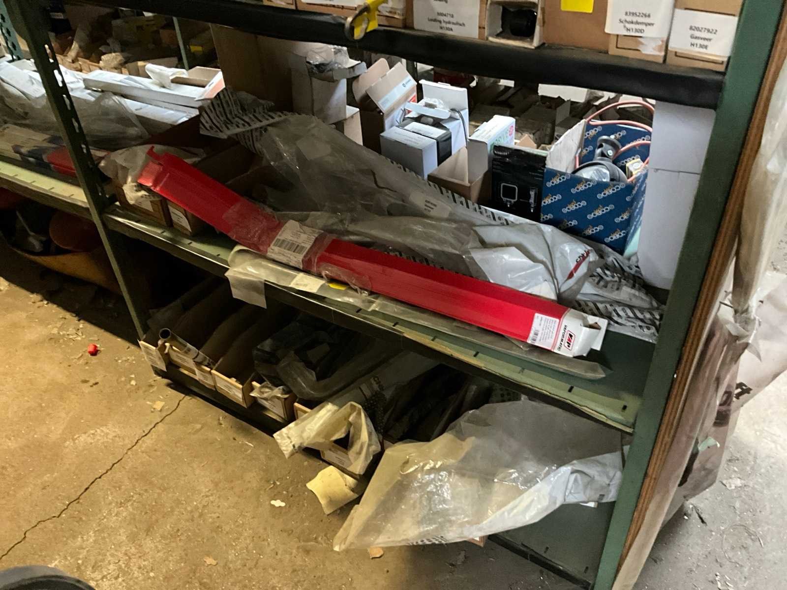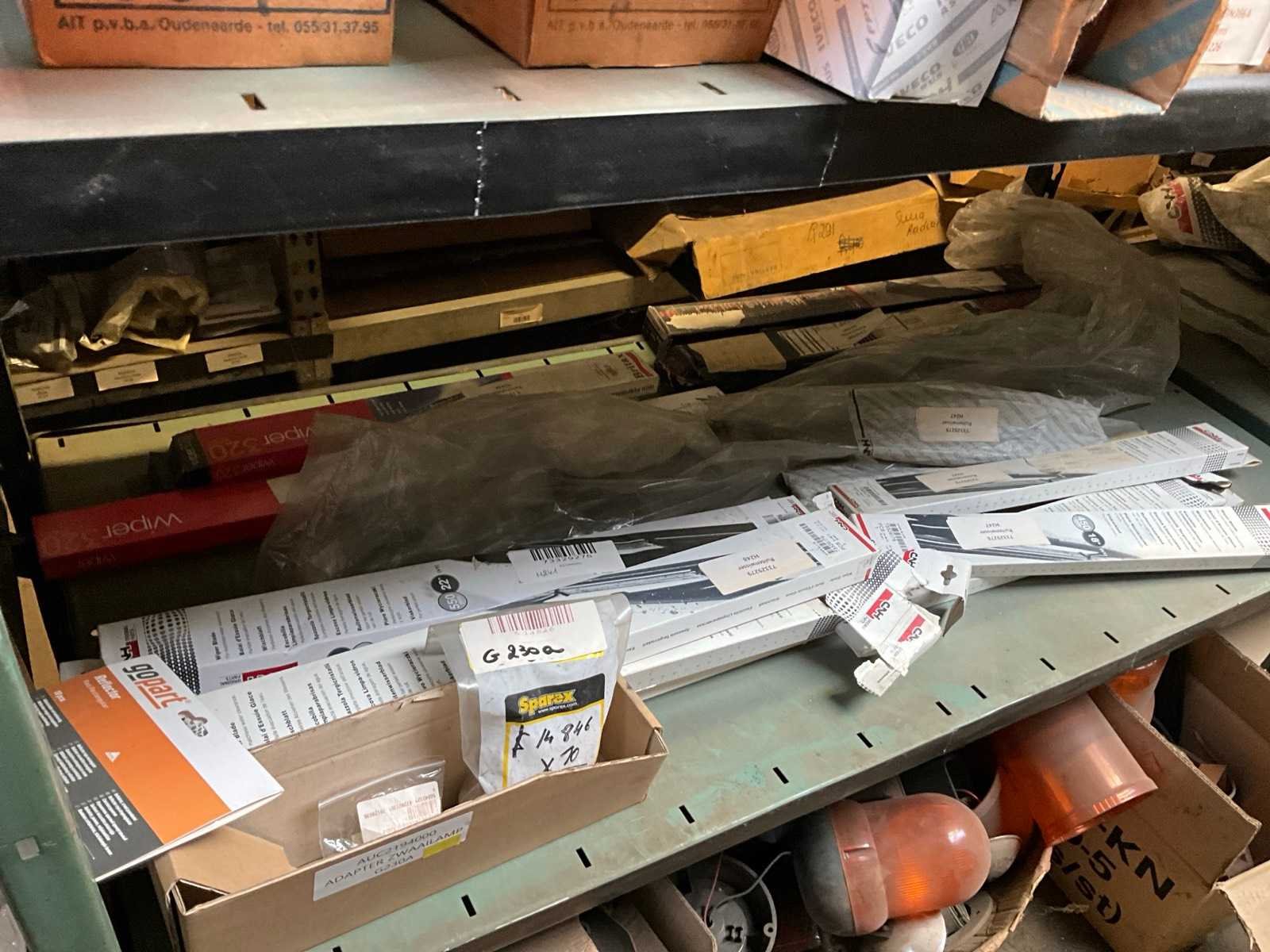 Bestaand uit inhoud 3x rek (12x sectie) waaronder originele verlichting-zwaailichten en spiegels (glas), werklichten, ruitenwisser bladen, gasveren, doorsteekkabels, vaste leidingen, enz.., ALLES BOVENOP REK NIET INCLUSIEF!!! Nee Merk: New Holland