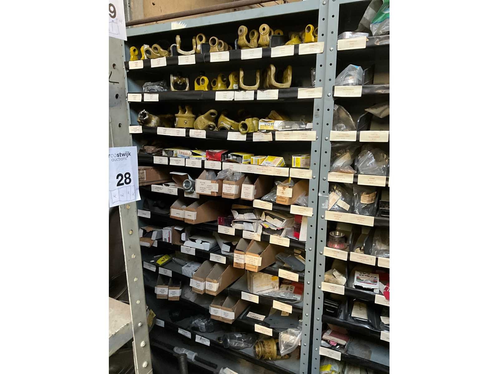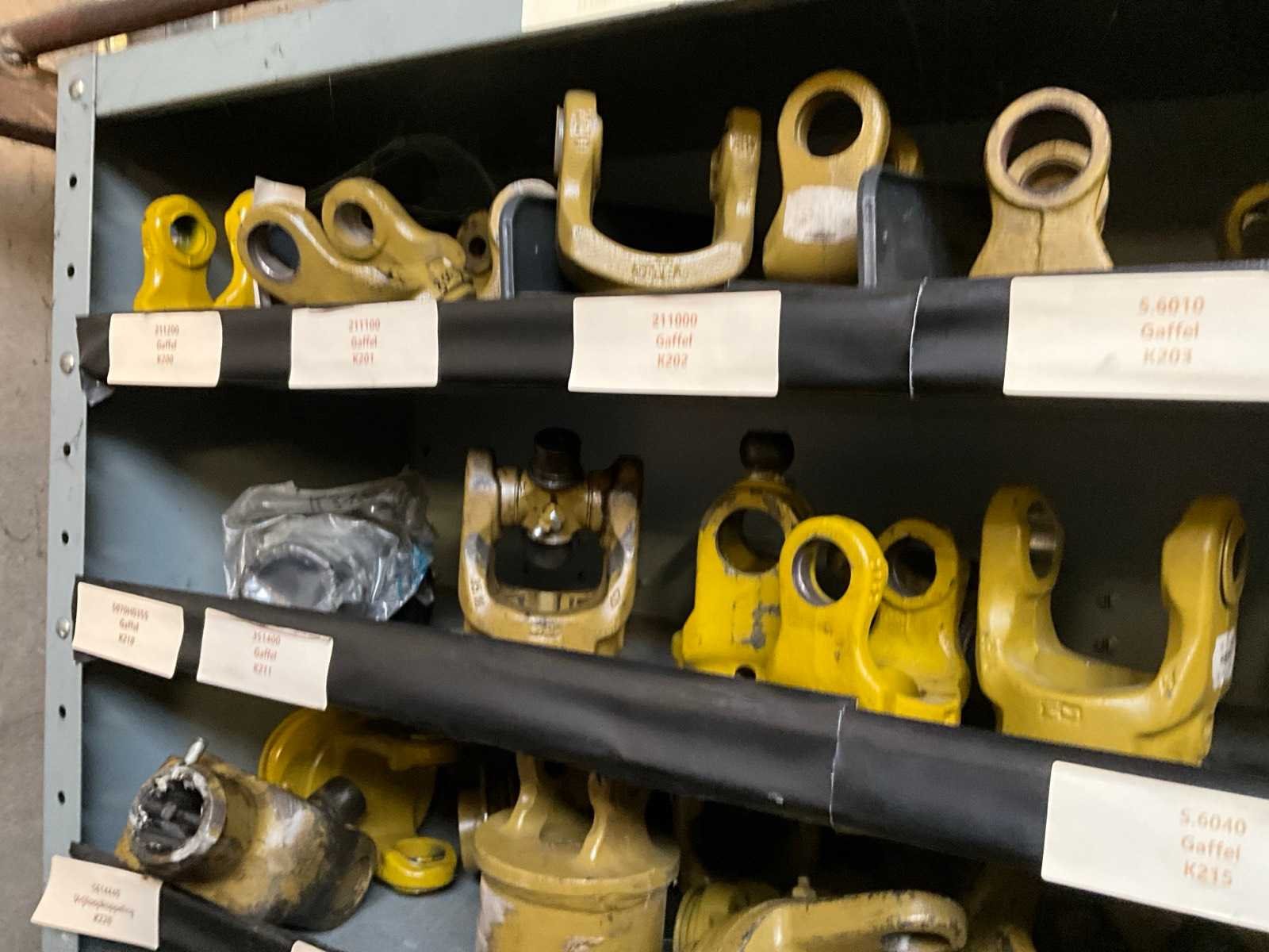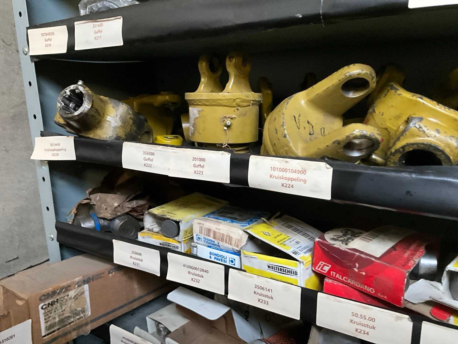 Bestaand uit 1x metalen magazijnrekje breedte 1 meter met inhoud waaronder gaffels-kruiskoppelingen-snelsluitkoppelingen, + partij maaiermessen voor weidemaaier enz.. Nee Merk: Walterscheid