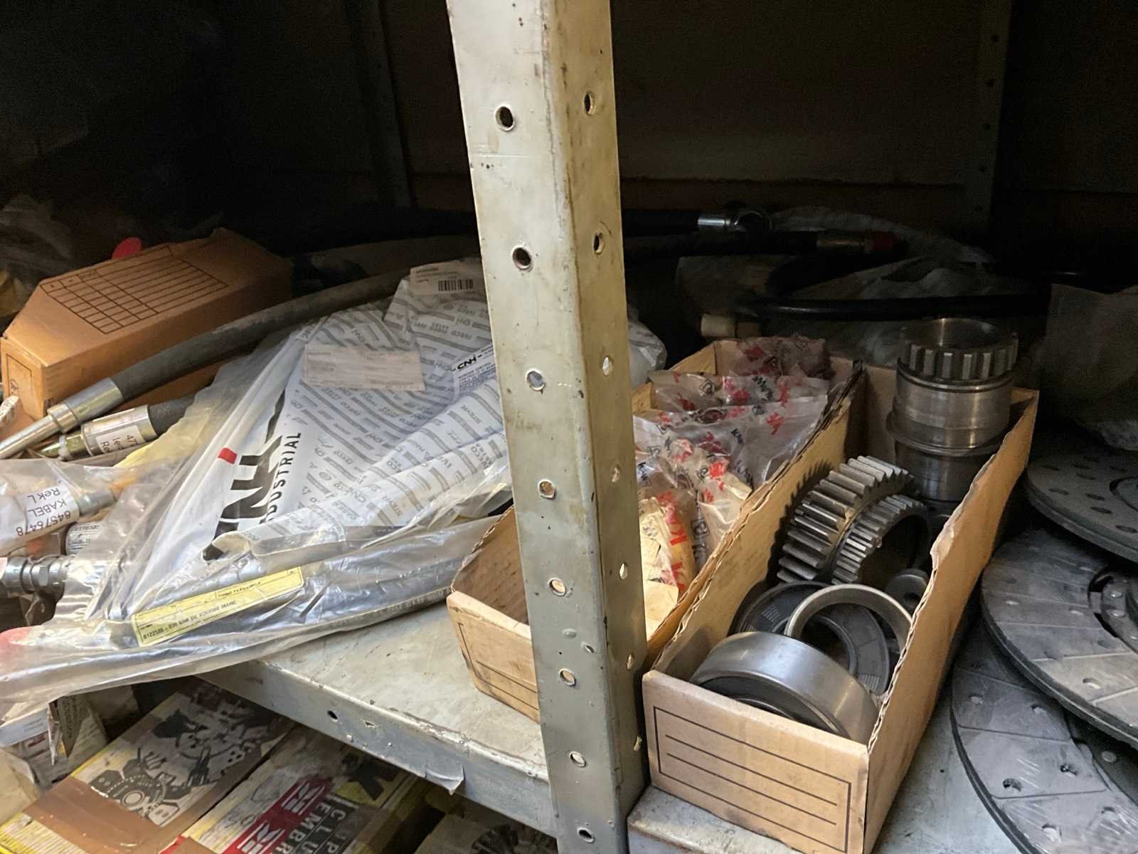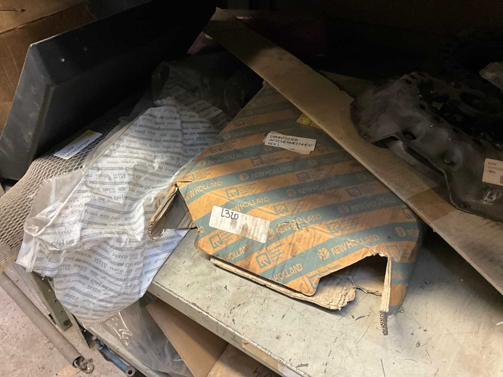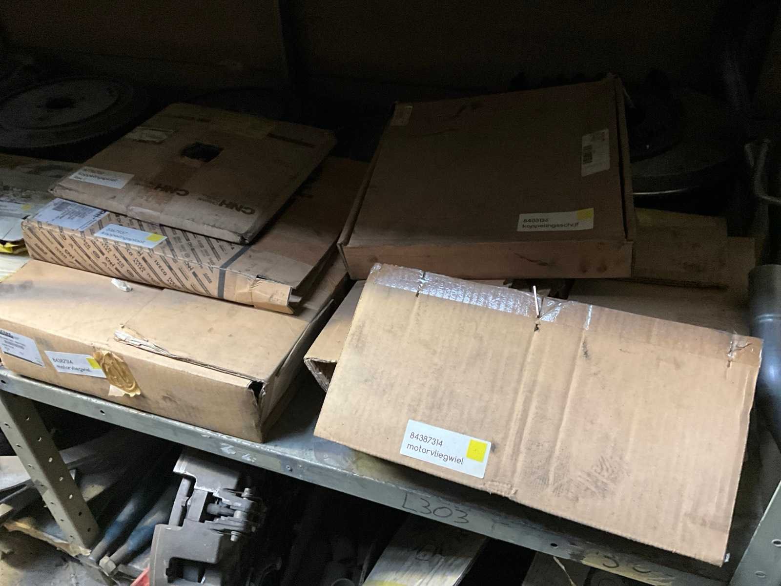 Bestaand uit inhoud rek met 11 secties waaronder drukplaten, koppelingsplaten, tandwielen en rollators, hydraulische slangen, supports, hydraulische cilinders Nee Merk: New Holland