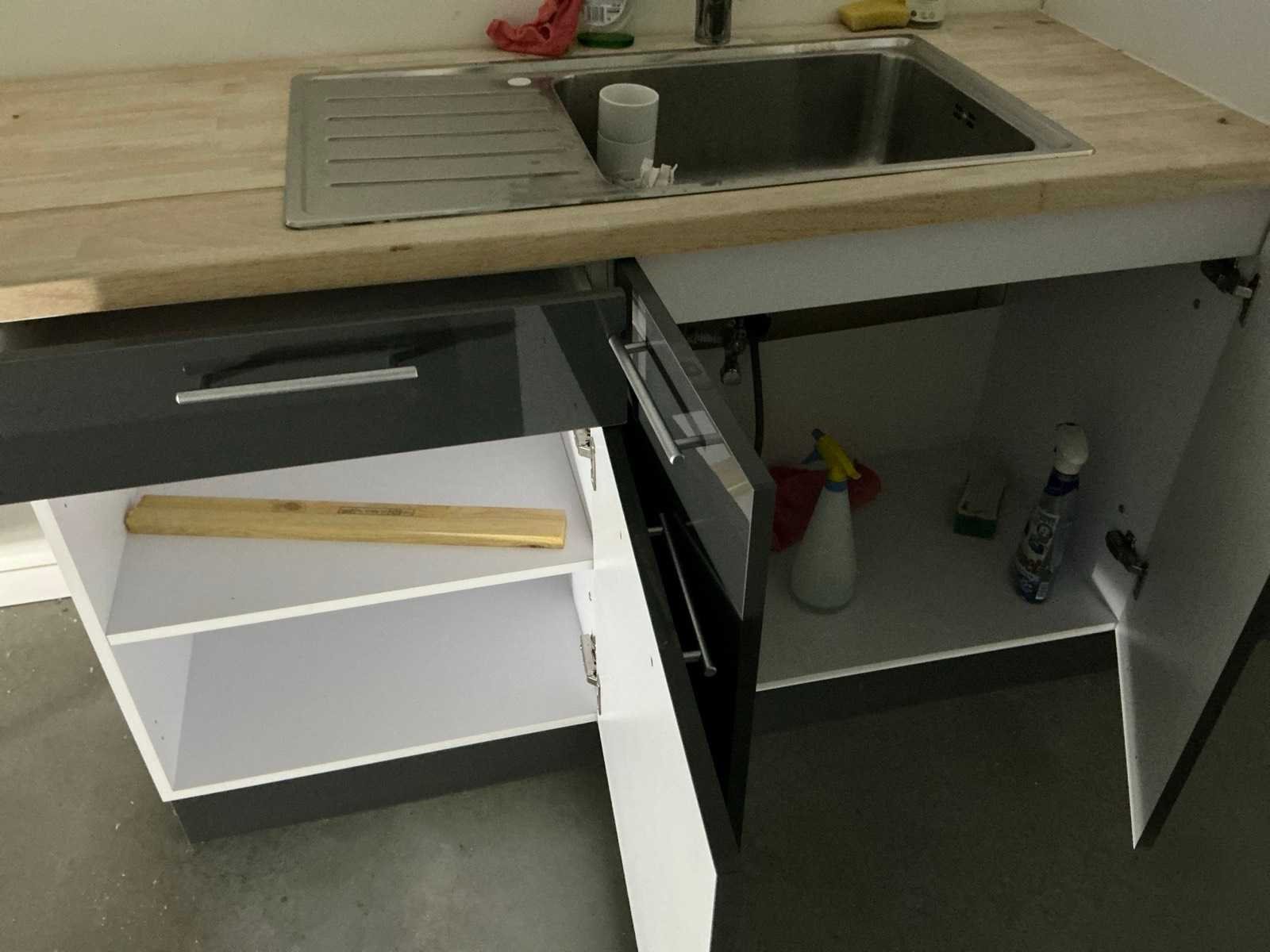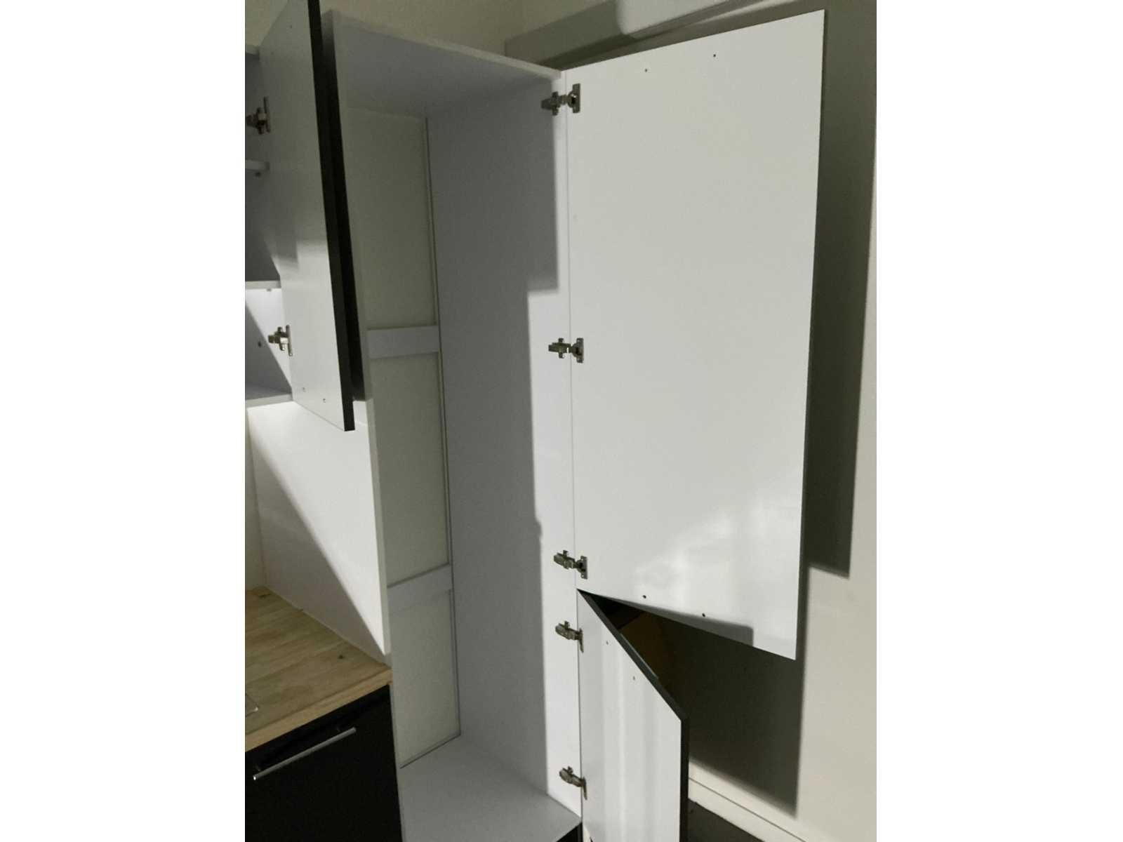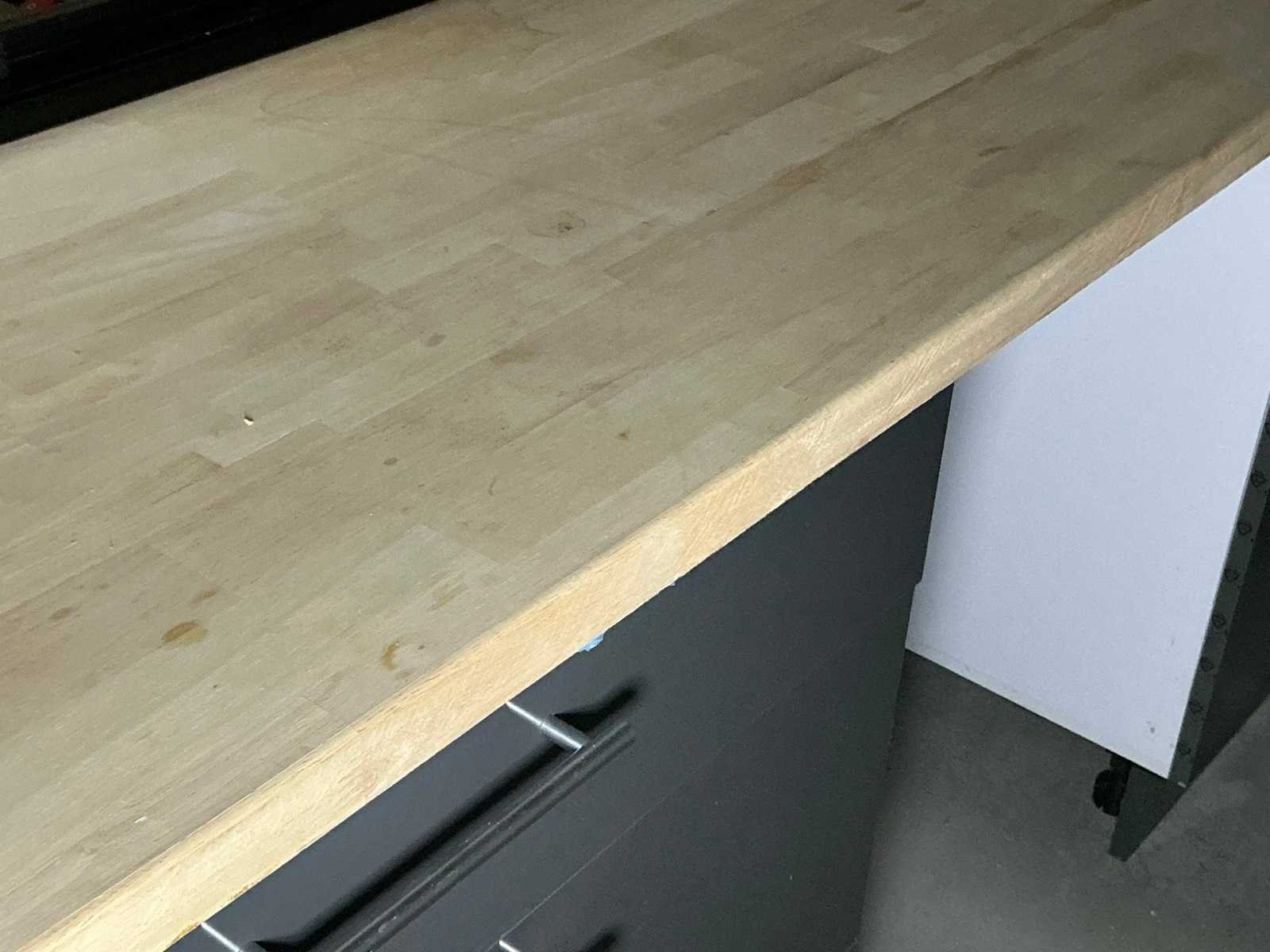 Voorzien van 14 deuren, 4 laden, rvs spoelbak en inox mengkraan Nee Type keukenopstelling: Wand Lengte: 403cm Breedte: 64cm Hoogte: 214cm Werkblad hoogte: 88,5cm Aanrechtblad: Hout Kleur: Wit/Antraciet