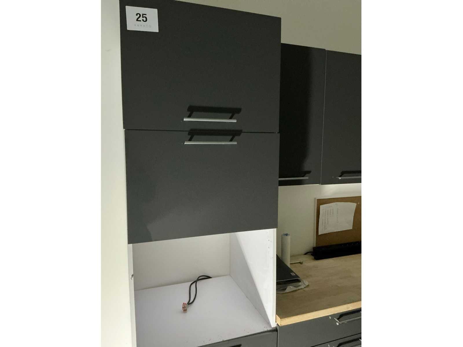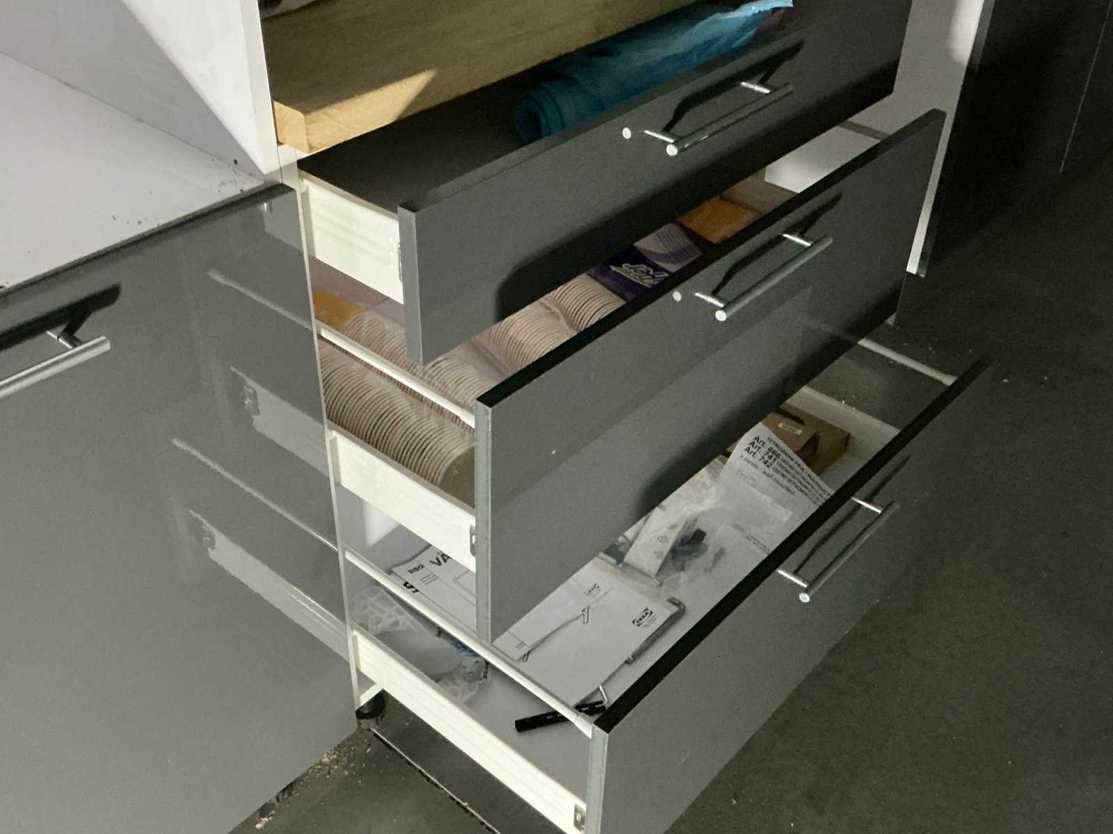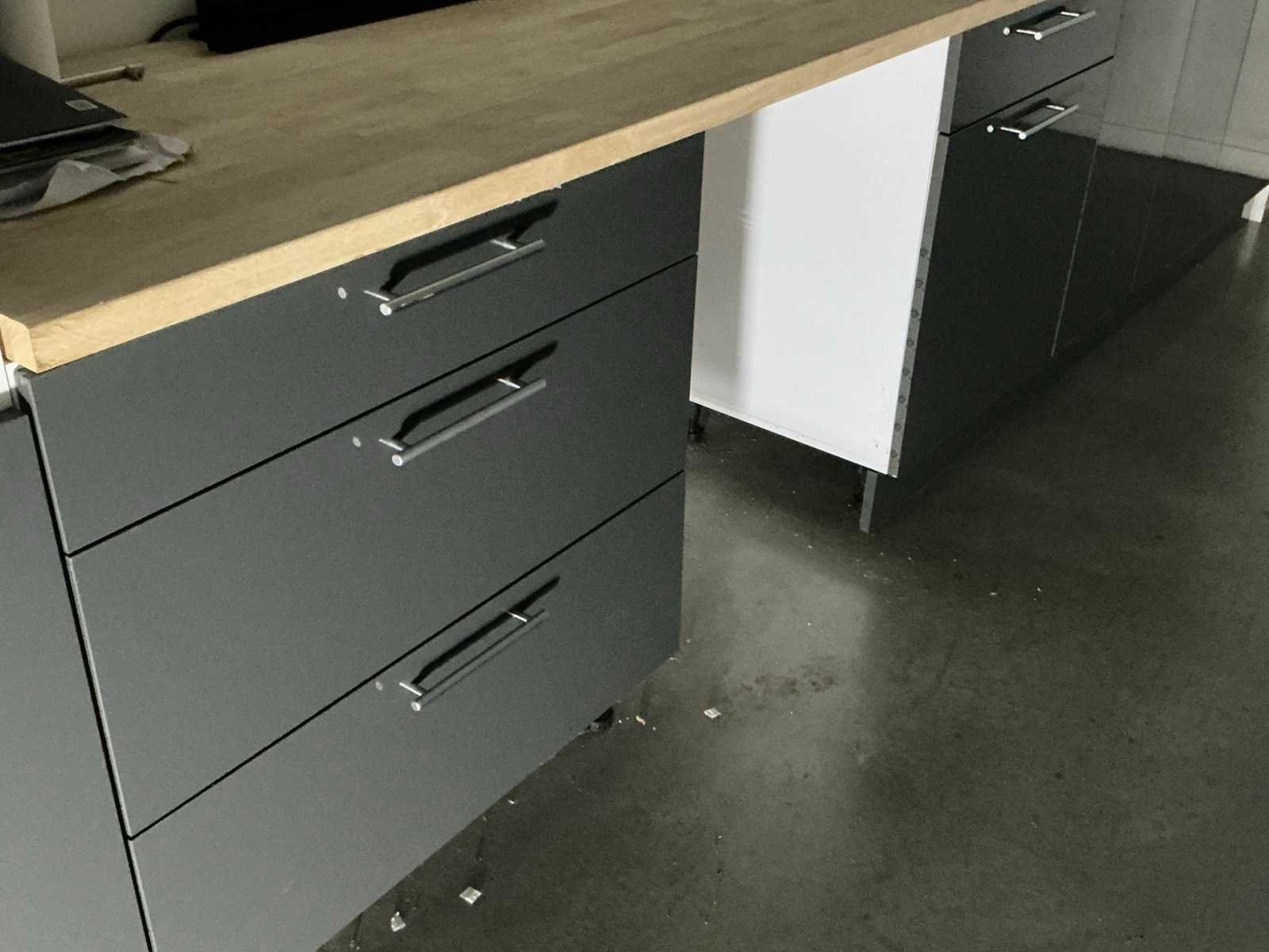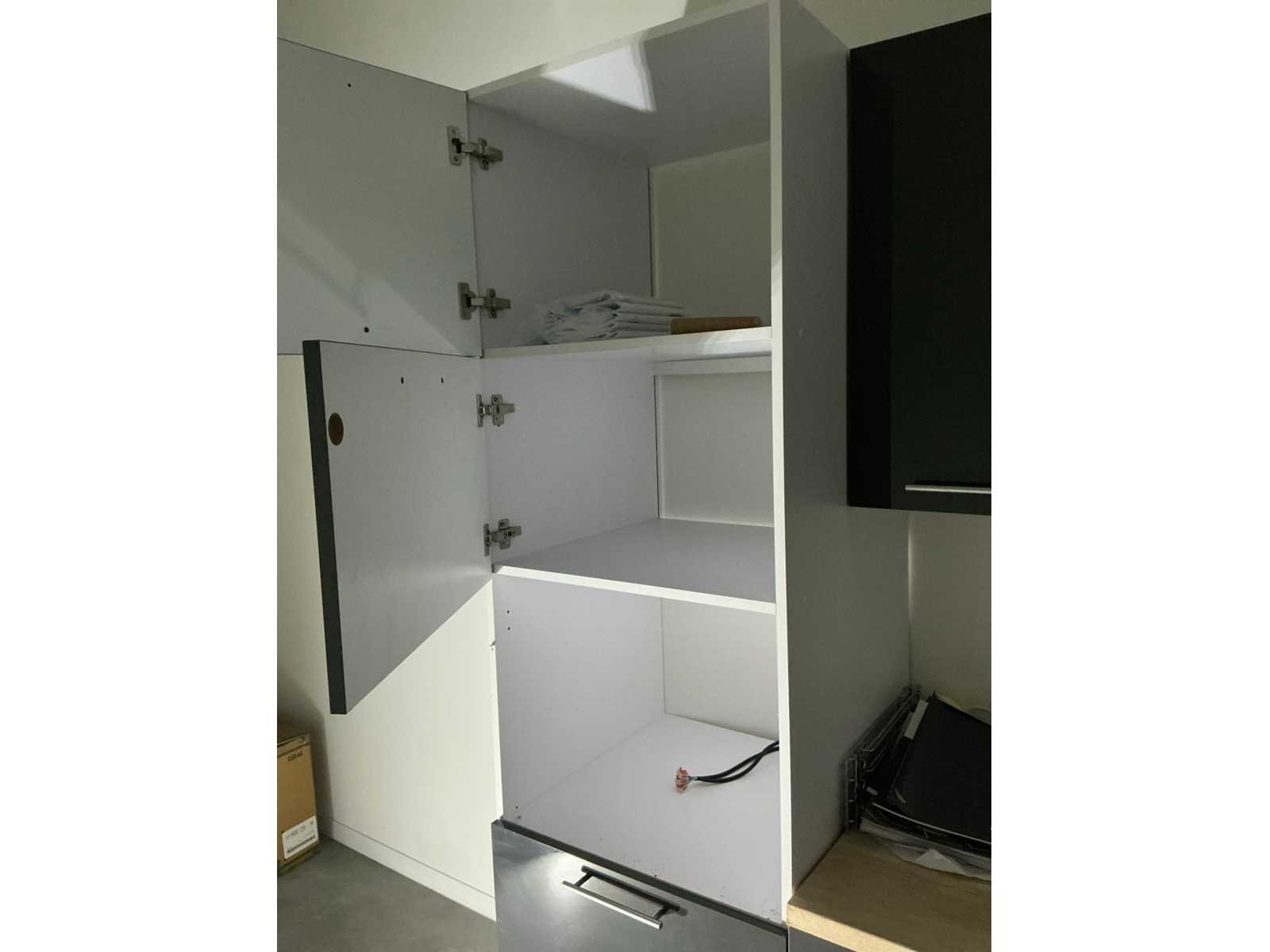 Voorzien van 14 deuren, 4 laden, rvs spoelbak en inox mengkraan Nee Type keukenopstelling: Wand Lengte: 403cm Breedte: 64cm Hoogte: 214cm Werkblad hoogte: 88,5cm Aanrechtblad: Hout Kleur: Wit/Antraciet
