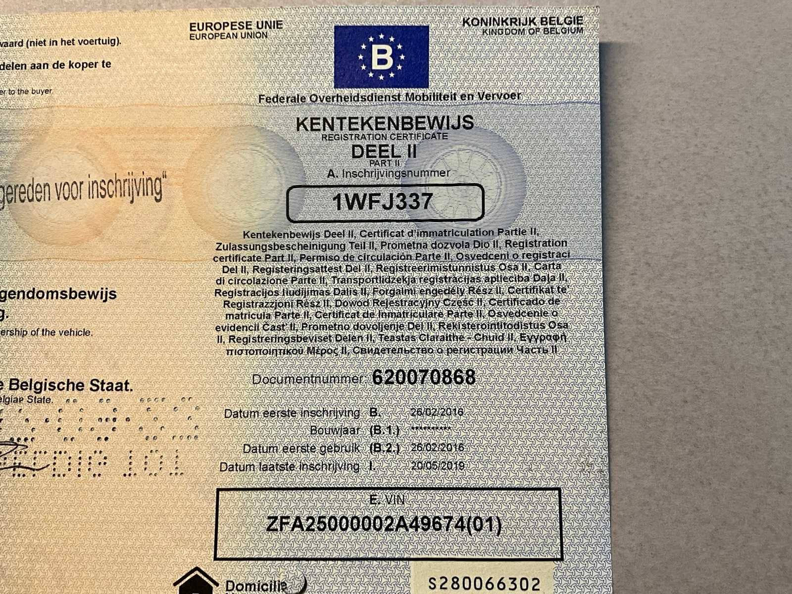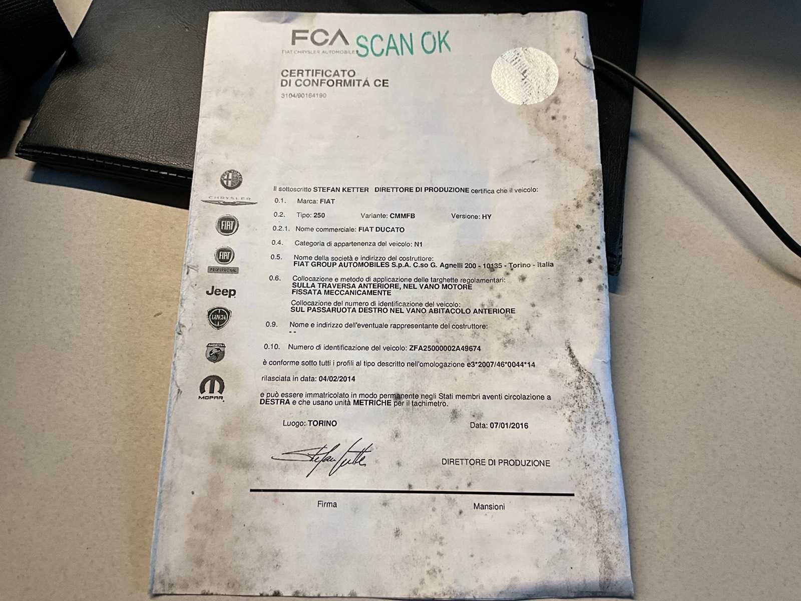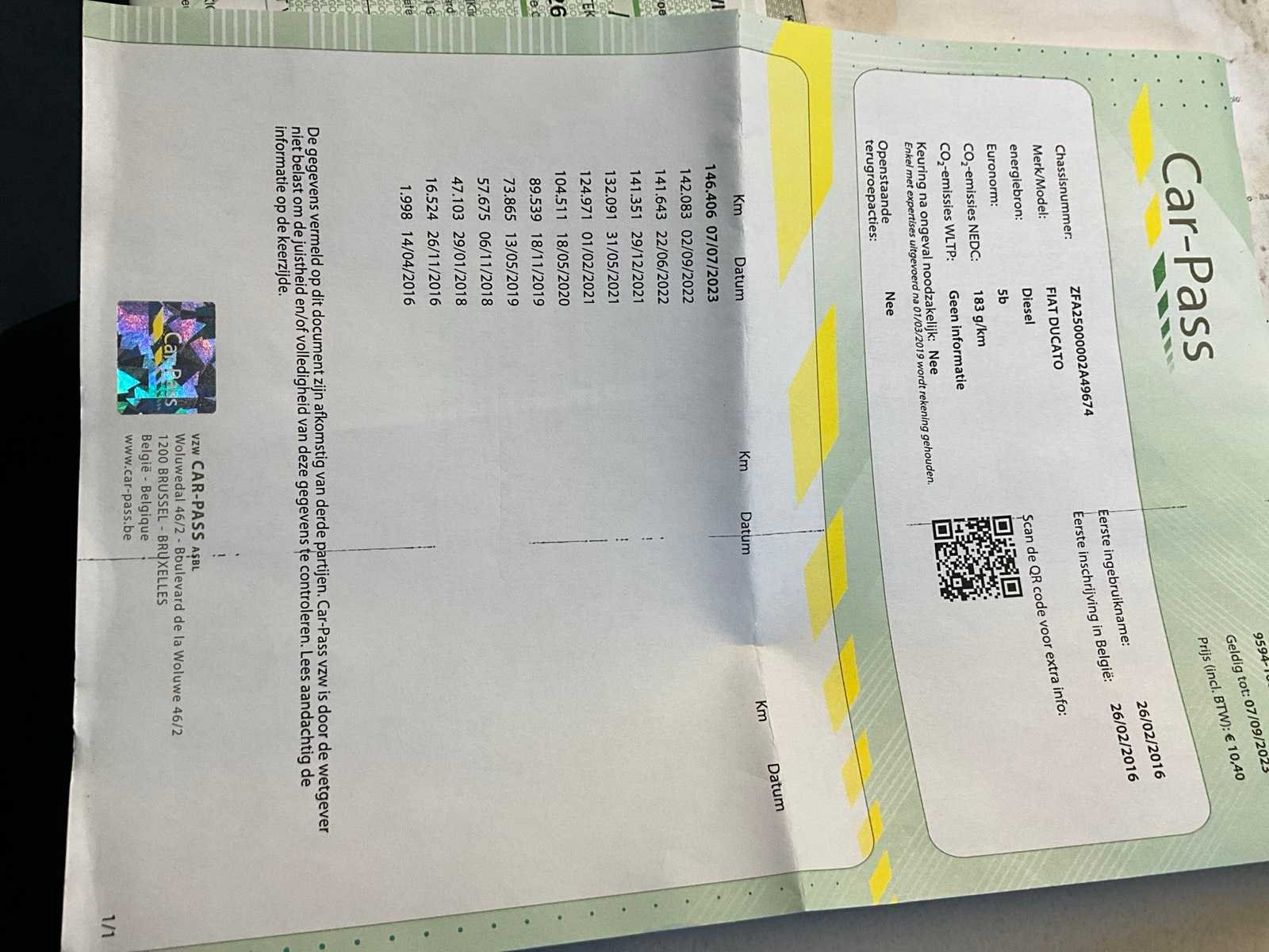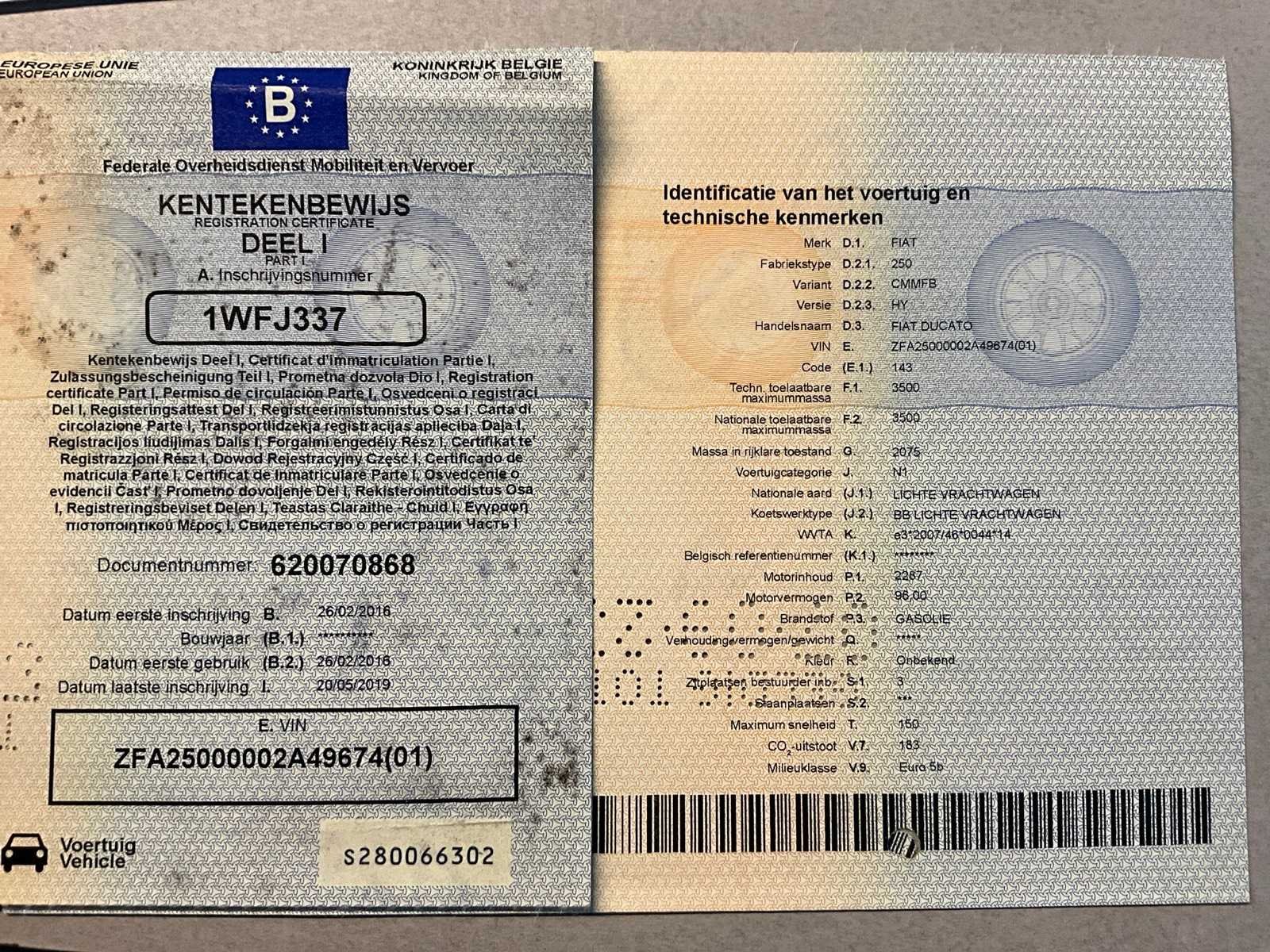 Overigen documenten: car-pass, keuringsbewijs. Ruit rechterportier ontbreekt. Nee Merk: Fiat Type: Ducato Bouwjaar: 2016 Chassisnummer: EFA25000002A49674 Afgelezen kilometerstand: 147614km Cilinderinhoud: 2287cc Vermogen (kW): 95kW Brandstof: diesel Datum eerste toelating: 26/2/2016 Nationaliteit documenten: België Aantal sleutels: 2 Kentekenpapieren compleet?: true CVO verklaring: true Startinformatie: Start en rijdt